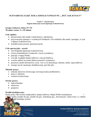 SCENARIUSZ ZAJĘĆ KOŁA EDUKACYJNEGO PT. „ BYĆ JAK IGNACY” Część I – teoretyczna: Zajęcia dotyczące życia Ignacego Łukasiewicza. Grupa wiekowa: klasy IV-VI Wymiar czasu: 2 x 45 minut Cele ogólne: promowanie idei nauki wśród dzieci i młodzieży, przywracanie pamięci o wybitnych Polakach i ich wkładzie dla nauki i postępu, w tym o Ignacu Łukasiewiczu, kształtowanie postaw patriotycznych. Cele operacyjne - uczeń: zna biografię Ignacego Łukasiewicza, tworzy kalendarium wydarzeń z życia wynalazcy, pracuje z mapą Polski, wie jak wygląda lampa naftowa i zna jej budowę, wyraża opinie na temat dobroczynności wynalazcy, poszerza zasób słownictwa: m,in. wie co to destylacja, chemia, nafta, ropa naftowa. stosuje się do zasad gry dydaktycznej, gra fair-ply. Metody pracy: metody aktywne (twórczego rozwiązywania problemów), praca z tekstem, rozmowa kierowana. Formy pracy: indywidualna zbiorowa grupowa Środki dydaktyczne: Karty pracy dla ucznia (załączniki), lampa naftowa, Mapa Polski teraźniejsza i z XIX wieku, kostka do gry, pionki do gry, instrukcja gry „Inwestycja”, karty losu x 2, tabela wyników dla każdego ucznia. Przebieg zajęć: CZĘŚĆ WSTĘPNA Cały cykl zajęć będzie poświęcony wielkiemu polskiemu wynalazcy, który żył ponad 150 lat temu. O kim, dowiemy się rozwiązując krzyżówkę. Nauczyciel rysuje na tablicy krzyżówkę. Czyta pytania, uczniowie wspólnie odgadują hasła związane Ignacym Łukasiewiczem. 3. 6. 11. W I K E O R 1. U K Ł A D 2. S T U D I A I A R K A 4. L A M P A 5. D E S T Y L P A L N I A 7. A P T E K A 8. L W Ó W 9. K I T E L 10. C H E M C A S T N I Z A C I A J A Słoneczny lub okresowy. Wyższe lub doktoranckie. Pierwiastek chemiczny na literę s, o barwie jasnożółtej. Nocna lub naftowa. Rozdzielenie ciekłej mieszaniny wieloskładnikowej poprzez odparowanie, a następnie skroplenie jej składników. 6. Miejsce, w którym górnicy zajmują się wydobyciem z ziemi kopalin użytecznych: węgla kamiennego, soli czy ropy naftowej i gazu ziemnego. 7. Sklep, w którym sprzedaje się leki. 8. Miasto, kiedyś należało do Polski, dziś na terach Ukrainy. 9. Odzież ochronna zakładana w laboratoriach, szpitalach, aptekach. 10. Nauka badająca naturę i właściwości substancji. 11. Platforma…………….…….. przeznaczona do wykonywania odwiertów pod dnem akwenów. 1. 2. 3. 4. 5. CZĘŚĆ GŁÓWNA 1. Przeczytajcie życiorys tego znanego Polaka (może przeczytać też nauczyciel). Na podstawie tekstu (załącznik nr 1) uporządkuj wydarzenia z życia Ignacego Łukasiewicza w kolejności chronologicznej, od jego narodzin do śmierci. Ponumeruj wydarzenia od 1 do 10. Uczniowie otrzymują kartę pracy z zadaniem do wykonania. Jan Boży Józef Ignacy Łukasiewicz przyszedł na świat w zubożałej rodzinie szlacheckiej w 1822 roku we wsi Zaduszniki z ojca Józefa i matki Apolonii ze Świetlików. W 1836 roku ukończył 4 klasy gimnazjum Ojców Pijarów w Rzeszowie i z powodu ciężkich warunków materialnych w rodzinie rozpoczął pracę w aptece w Łańcucie, a później w Rzeszowie. Wstąpił tam do tajnej organizacji patriotycznej i pod zarzutem nielegalnej działalności skierowanej przeciwko zaborcy został aresztowany w 1846 roku i przebywał w więzieniu do 1848 r. Po wyjściu z więzienia rozpoczął pracę w aptece "Pod Gwiazdą" Piotra Mikolascha we Lwowie. W latach 1850-1852 studiował farmację na Uniwersytetach w Krakowie i Wiedniu. W 1852 r. w Wiedniu uzyskał tytuł magistra farmacji i wrócił do pracy w aptece Piotra Mikolascha, gdzie objął stanowisko prowizora. W latach 1852-1853 Ignacy Łukasiewicz wspólnie z Janem Zehem prowadził na zapleczu apteki badania nad ropą naftową. Po oczyszczeniu tego płynu uzyskał naftę świetlną. 31 lipca 1853 w szpitalu na lwowskim Łyczakowie zapłoneły po raz pierwszy lampy naftowe, które wykonał blacharz lwowski Adam Bratkowski, według projektu Łukasiewicza. Datę 31 lipca 1853 roku uważa się za datę powstania polskiego przemysłu naftowego. Na przełomie lat 1853/54 Łukasiewicz opuścił Lwów i przeniósł się w pobliże terenów roponośnych - do Gorlic, gdzie dzierżawił aptekę. Nie zaprzestał prac nad doskonaleniem procesu otrzymywania nafty. W 1854 roku wspólnie z Tytusem Trzecieskim założył pierwszą na świecie spółkę naftową, która zaczęła wydobywać i eksploatować ropę w Bóbrce k. Krosna. W 1856 roku na skutek uzyskania znaczących ilości ropy Łukasiewicz założył w Ulaszowicach pierwszą na ziemiach polskich destylarnię ropy naftowej. Następne destylarnie Łukasiewicza to: destylarnia w Klęczanach (1858) prowadzona wspólnie z Eugeniuszem Zielińskim, kolejna w Polance (1861) i w Chorkówce (1865). Łukasiewicz cały czas pracował nad udoskonaleniem przetwórstwa ropy, efektem czego były nagrody za eksponowane produkty naftowe na wystawach w Jaśle, Lwowie i Wiedniu. Doskonalił również na terenie kopalni Bóbrka technikę wiercenia otworów za ropą. Wprowadził do użytku wiertnicę ręczną (1862), później zastosował maszyny parowe do napędu wiertnic. Czynił też starania o założenie szkoły górniczej w Bóbrce. Łukasiewicz był człowiekiem o wybitnych cechach charakteru. Wspierał finansowo ruchy narodowowyzwoleńcze, budował szkoły, kościoły, drogi i mosty. Stał na czele Krajowego Towarzystwa Naftowego. Założył prowadzoną przez żonę Honoratę Szkołę Koronkarską dla dziewcząt w Chorkówce. Na kopalni Bóbrka założył tzw. Kasę Bracką (odpowiednik dzisiejszego ZUS). Za działalność charytatywną papież Pius IX w 1873 roku nadał mu tytuł Szambelana Papieskiego i odznaczył Orderem Św. Grzegorza. Ignacy Łukasiewicz zmarł w Chorkówce 7 stycznia 1882 roku na zapalenie płuc i został pochowany na cmentarzu parafialnym w Zręcinie. ____Działalność konspiracyjna, pobyt w więzieniu. ____Łukasiewicz odkrywa naftę i konstruuję lampę. _1__Narodziny w Zadusznikach