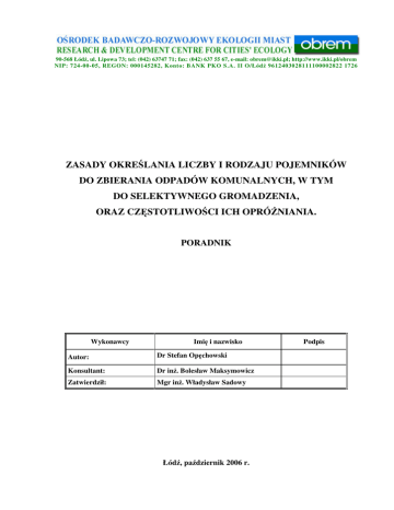 90-568 Łódź, ul. Lipowa 73; tel: (042) 63747 71; fax: (042) 637 55 67, e-mail: [email protected]; http://www.ikki.pl/obrem NIP: 724-00-05, REGON: 000145282, Konto: BANK PKO S.A. II O/Łódź 9612403028111100002822 1726 ZASADY OKREŚLANIA LICZBY I RODZAJU POJEMNIKÓW DO ZBIERANIA ODPADÓW KOMUNALNYCH, W TYM DO SELEKTYWNEGO GROMADZENIA, ORAZ CZĘSTOTLIWOŚCI ICH OPRÓŻNIANIA. PORADNIK Wykonawcy Imię i nazwisko Autor: Dr Stefan Opęchowski Konsultant: Dr inż. Bolesław Maksymowicz Zatwierdził: Mgr inż. Władysław Sadowy Łódź, październik 2006 r. Podpis SPIS TREŚCI 1. Wstęp ………………………………………………………………………………….. 3 1.1. Uzasadnienie celowości ……………………………….……………...…………. 3 1.2. Podstawa formalno-prawna wykonania opracowania ……………………….…... 3 2. Cel i zakres pracy ……………………………………………………………..………. 3 3. Analiza parametrów dotyczących wytwarzania, zbierania i odbierania odpadów komunalnych stosowanych w gminach ……………………………......…… 4 3.1. Wprowadzenie ………………………………………………………………….. 4 3.2. Średnia ilość odpadów wytwarzanych przez statystycznego mieszkańca gminy ………………………………………….…………………… 4 3.3. Wymagania dotyczące liczby i objętości pojemników do zbierania odpadów zmieszanych powstających w nieruchomościach mieszkalnych ……………….. 5 3.4. Wymagania dotyczące liczby i objętości pojemników do zbierania odpadów 3.5. zmieszanych powstających w nieruchomościach niemieszkalnych …….……… 6 Selektywna zbiórka odpadów …………………………….....…………………. 9 3.6. Częstotliwość opróżniania pojemników ............................................................... 10 3.7. Podsumowanie ...................................................................................................... 11 4. Przepisy prawne związane z tematyką poradnika .......................................................... 12 5. Sposoby określania ilości wytwarzanych odpadów komunalnych ................................. 14 5.1. Odpady komunalne powstające w gospodarstwach domowych ........................... 14 5.2. Odpady komunalne powstające poza gospodarstwami domowymi ..................... 16 6. Urządzenia do zbierania odpadów komunalnych w świetle ustawy o systemie oceny zgodności oraz norm ........................................................................................... 17 7. Zasady określania liczby i rodzaju pojemników do zbierania odpadów komunalnych, w tym przeznaczonych do selektywnego gromadzenia odpadów oraz częstotliwości opróżniania pojemników ................................................................................................ 20 7.1. Zasady ogólne ....................................................................................................... 20 7.2. Odpady komunalne powstające w gospodarstwach domowych ........................... 21 7.3. Odpady komunalne powstające poza gospodarstwami domowymi ..................... 23 2 1. WSTĘP 1.1 Uzasadnienie celowości Ustawa z 13 września 1996 r. o utrzymaniu czystości i porządku w gminach nakłada na gminę obowiązek określania w regulaminie utrzymania czystości i porządku na terenie gminy rodzajów urządzeń przeznaczonych do zbierania odpadów komunalnych oraz częstotliwości pozbywania się zebranych w nich odpadów. Podstawę dla zrealizowania tego obowiązku stanowią informacje dotyczące ilości i rodzaju wytwarzanych odpadów komunalnych z uwzględnieniem systemu zbiórki i liczby osób korzystających z tych urządzeń. Aktualnie brakuje obowiązkowego lub zalecanego sposobu określania tych parametrów. Wynikiem tego jest zupełna dowolność postępowania w sprawach prowadzących do formułowania przepisów gminnych kształtujących wysokość opłat. 1.2 Podstawa formalno-prawna wykonania opracowania Praca została wykonana na podstawie umowy o dzieło zawartej w dniu 1 sierpnia 2006 r. pomiędzy Ministrem Budownictwa a Ośrodkiem Badawczo-Rozwojowym Ekologii Miast OBREM. 2. CEL I ZAKRES PRACY Celem pracy jest opracowanie, w formie zaleceń, zasad określania liczby i rodzaju pojemników do zbierania odpadów komunalnych oraz częstotliwości ich opróżniania. Zakres pracy: • stosowane w gminach sposoby określania średniej ilości odpadów wytwarzanych przez statystycznego mieszkańca gminy, rodzajów i liczby pojemników oraz częstotliwości ich opróżniania, • interpretacja przepisów prawa związanych z tematem pracy, • analiza i wskazanie zalecanych sposobów określania wytwarzanych ilości odpadów komunalnych uwzględniających system zbiórki oraz liczbę osób korzystających z urządzeń zastosowanych do tej zbiórki, 3 • omówienie urządzeń zalecanych do stosowania w zbieraniu odpadów komunalnych w świetle ustawy o systemie zgodności, przepisów wykonawczych do tej ustawy oraz norm, • opracowanie zasad określania liczby i rodzaju pojemników do zbierania odpadów komunalnych, w tym przeznaczonych do selektywnego gromadzenia oraz częstotliwości ich opróżniania. 3. ANALIZA PARAMETRÓW DOTYCZĄCYCH WYTWARZANIA, ZBIERANIA I ODBIERANIA ODPADÓW KOMUNALNYCH STOSOWANYCH W GMINACH 3.1. Wprowadzenie Przeprowadzona analiza parametrów dotyczących wytwarzania, zbierania i odbierania odpadów komunalnych miała na celu zbadanie, na przykładzie wybranych gmin, jakie zapisy stosowane są w gminnych regulaminach utrzymania czystości i porządku. Źródłem informacji były zapisy w zamieszczonych w internecie regulaminach obowiązujących w 32 gminach wybranych tak, aby objąć analizą miasta wojewódzkie, inne większe miasta, małe miasta, gminy wiejskie oraz gminy turystyczne. Analizowane regulaminy zostały uchwalone 