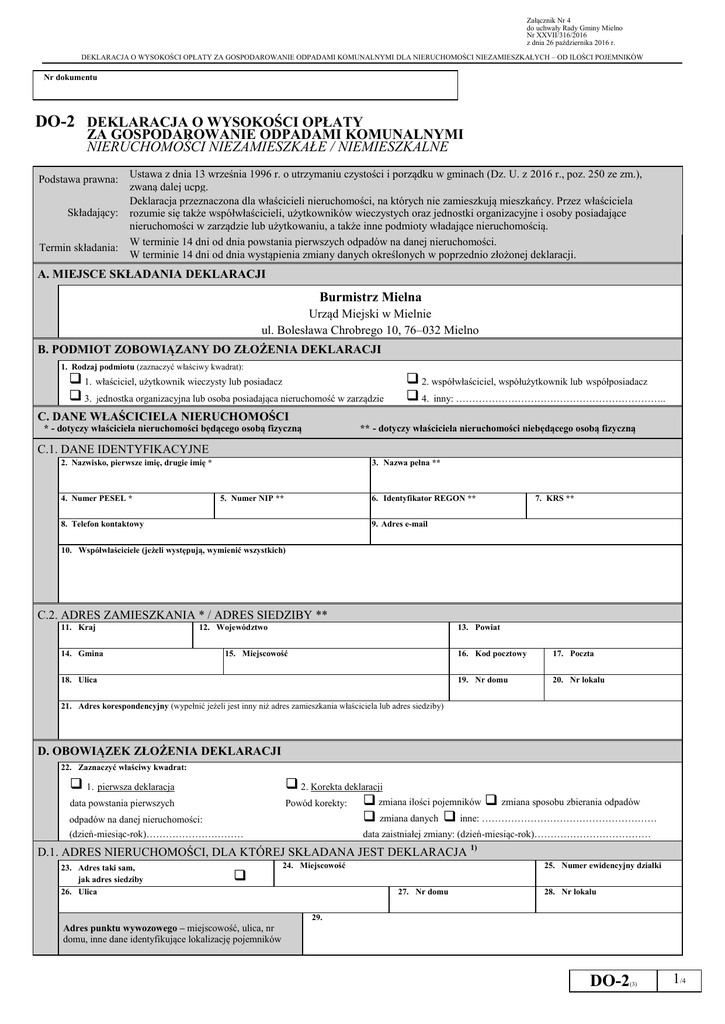 Załącznik Nr 4 do uchwały Rady Gminy Mielno Nr XXVII/316/2016 z dnia 26 października 2016 r. DEKLARACJA O WYSOKOŚCI OPŁATY ZA GOSPODAROWANIE ODPADAMI KOMUNALNYMI DLA NIERUCHOMOŚCI NIEZAMIESZKAŁYCH – OD ILOŚCI POJEMNIKÓW Nr dokumentu DO-2 DEKLARACJA O WYSOKOŚCI OPŁATY ZA GOSPODAROWANIE ODPADAMI KOMUNALNYMI NIERUCHOMOŚCI NIEZAMIESZKAŁE / NIEMIESZKALNE Podstawa prawna: Składający: Termin składania: Ustawa z dnia 13 września 1996 r. o utrzymaniu czystości i porządku w gminach (Dz. U. z 2016 r., poz. 250 ze zm.), zwaną dalej ucpg. Deklaracja przeznaczona dla właścicieli nieruchomości, na których nie zamieszkują mieszkańcy. Przez właściciela rozumie się także współwłaścicieli, użytkowników wieczystych oraz jednostki organizacyjne i osoby posiadające nieruchomości w zarządzie lub użytkowaniu, a także inne podmioty władające nieruchomością. W terminie 14 dni od dnia powstania pierwszych odpadów na danej nieruchomości. W terminie 14 dni od dnia wystąpienia zmiany danych określonych w poprzednio złożonej deklaracji. A. MIEJSCE SKŁADANIA DEKLARACJI Burmistrz Mielna Urząd Miejski w Mielnie ul. Bolesława Chrobrego 10, 76–032 Mielno B. PODMIOT ZOBOWIĄZANY DO ZŁOŻENIA DEKLARACJI 1. Rodzaj podmiotu (zaznaczyć właściwy kwadrat): 1. właściciel, użytkownik wieczysty lub posiadacz 3. jednostka organizacyjna lub osoba posiadająca nieruchomość w zarządzie C. DANE WŁAŚCICIELA NIERUCHOMOŚCI * - dotyczy właściciela nieruchomości będącego osobą fizyczną 2. współwłaściciel, współużytkownik lub współposiadacz 4. inny: ……………………………………………………….. ** - dotyczy właściciela nieruchomości niebędącego osobą fizyczną C.1. DANE IDENTYFIKACYJNE 2. Nazwisko, pierwsze imię, drugie imię * 4. Numer PESEL * 3. Nazwa pełna ** 5. Numer NIP ** 6. Identyfikator REGON ** 7. KRS ** 9. Adres e-mail 8. Telefon kontaktowy 10. Współwłaściciele (jeżeli występują, wymienić wszystkich) C.2. ADRES ZAMIESZKANIA * / ADRES SIEDZIBY ** 11. Kraj 12. Województwo 14. Gmina 13. Powiat 15. Miejscowość 18. Ulica 16. Kod pocztowy 17. Poczta 19. Nr domu 20. Nr lokalu 21. Adres korespondencyjny (wypełnić jeżeli jest inny niż adres zamieszkania właściciela lub adres siedziby) D. OBOWIĄZEK ZŁOŻENIA DEKLARACJI 22. Zaznaczyć właściwy kwadrat: 1. pierwsza deklaracja 2. Korekta deklaracji zmiana ilości pojemników zmiana sposobu zbierania odpadów Powód korekty: zmiana danych inne: ……………………………………………… data powstania pierwszych odpadów na danej nieruchomości: (dzień-miesiąc-rok)………………………… data zaistniałej zmiany: (dzień-miesiąc-rok)……………………………… D.1. ADRES NIERUCHOMOŚCI, DLA KTÓREJ SKŁADANA JEST DEKLARACJA 1) 23. Adres taki sam, jak adres siedziby 26. Ulica 24. Miejscowość 25. Numer ewidencyjny działki 27. Nr domu 28. Nr lokalu 29. Adres punktu wywozowego – miejscowość, ulica, nr domu, inne dane identyfikujące lokalizację pojemników DO-2 (3) 1/4 DEKLARACJA O WYSOKOŚCI OPŁATY ZA GOSPODAROWANIE ODPADAMI KOMUNALNYMI DLA NIERUCHOMOŚCI NIEZAMIESZKAŁYCH – METODA OD ILOŚCI POJEMNIKÓW E. DANE DO OKREŚLENIA OPŁATY ZA GOSPODAROWANIE ODPADAMI KOMUNALNYMI E.1. SPOSÓB ZBIERANIA ODPADÓW (należy wybrać jeden sposób) 30. Oświadczam, że na terenie nieruchomości wskazanej w części D.1. niniejszej deklaracji odpady będą zbierane w sposób: 2) selektywny nieselektywny E.2. OKRES ZBIERANIA ODPADÓW 31. Oświadczam, że na terenie nieruchomości wskazanej w części D.1. niniejszej deklaracji odpady będą zbierane w okresie: od…………………………………. do……………………………. 32. Oświadczam, że niniejsza deklaracja jest składana jako: 3) jednoroczna wieloletnia E.3. OŚWIADCZENIE O ZBIERANIU ODPADÓW DO POJEMNIKÓW LUB WORKÓW 4) Oświadczam, że na terenie nieruchomości wskazanej w części D.1. niniejszej deklaracji odpady zmieszane będą zbierane do (obiekty gastronomiczne tylko pojemniki): 34. Oświadczam, że na terenie nieruchomości wskazanej w części D.1. niniejszej deklaracji odpady selektywne będą zbierane do: 33. pojemnika pojemnika własnego worka OPAKOWANIA ZE SZKŁA 35. pojemnika pojemnika własnego worka OPAKOWANIA Z TWORZYW SZTUCZNYCH, METALI I PAPIERU pojemnika pojemnika własnego worka F. OBLICZENIE WYSOKOŚCI OPŁATY ZA GOSPODAROWANIE ODPADAMI KOMUNALNYMI 5) Kolumna I Rodzaj nieruchomości Podać nr z załącznika ZDO-2b Kolumna II Kolumna III Kolumna IV Frakcja odpadów Liczba i wielkość pojemników Podać na podstawie załącznika ZDO-2b Częstotliwość Okres I – sty-maj; paź-gru Okres II – cze-wrz Odpady zmieszane / zmieszane po segregacji Opakowania ze szkła Opakowania z tworzyw sztucznych, metali i papieru F.1. OPŁATA OD POJEMNIKA (iloczyn ilości pojemników / worków, częstotliwości oraz stawki opłaty) – odpady zmieszane / zmieszane po segregacji X po segregacji 6) bez segregacji 6) 120 l = 14 zł 120 l = 28 zł = W okresie I 7) 36. 240 l = 56 zł 1100 l = 256 zł W okresie I 7) 37. W okresie II 7) 38. 39. = 41. zł 42. X 45. zł 46. X zł 43. = 44. 1100 l = 128 zł W okresie II 7) X 40. 240 l = 28 zł Wysokość opłaty miesięcznej za pojemniki / worki Ilość pojemników / worków miesięcznie Stawka za odpady zmieszane zł 47. = zł zł F.2. OPŁATA OD POJEMNIKA (iloczyn ilości pojemników / worków, częstotliwości oraz stawki opłaty) – odpady selektywne Stawka za odpady selektywne 6) X Ilość pojemników / worków miesięcznie – opakowania ze szkła oraz opakowania z tworzyw sztucznych i opakowania z papieru W okresie I 48. 120 l = 14 zł DO-2 (3) 2/4 W okresie I 7) 49. W okresie II 7) 50. 53. X X = 7) = 51. zł 54. = 56. 1100 l = 128 zł W okresie II X 52. 240 l = 28 zł 7) Wysokość opłaty miesięcznej za pojemniki / worki 57. zł 58. = zł 55. zł 59. zł zł DEKLARACJA O WYSOKOŚCI OPŁATY ZA GOSPODAROWANIE 