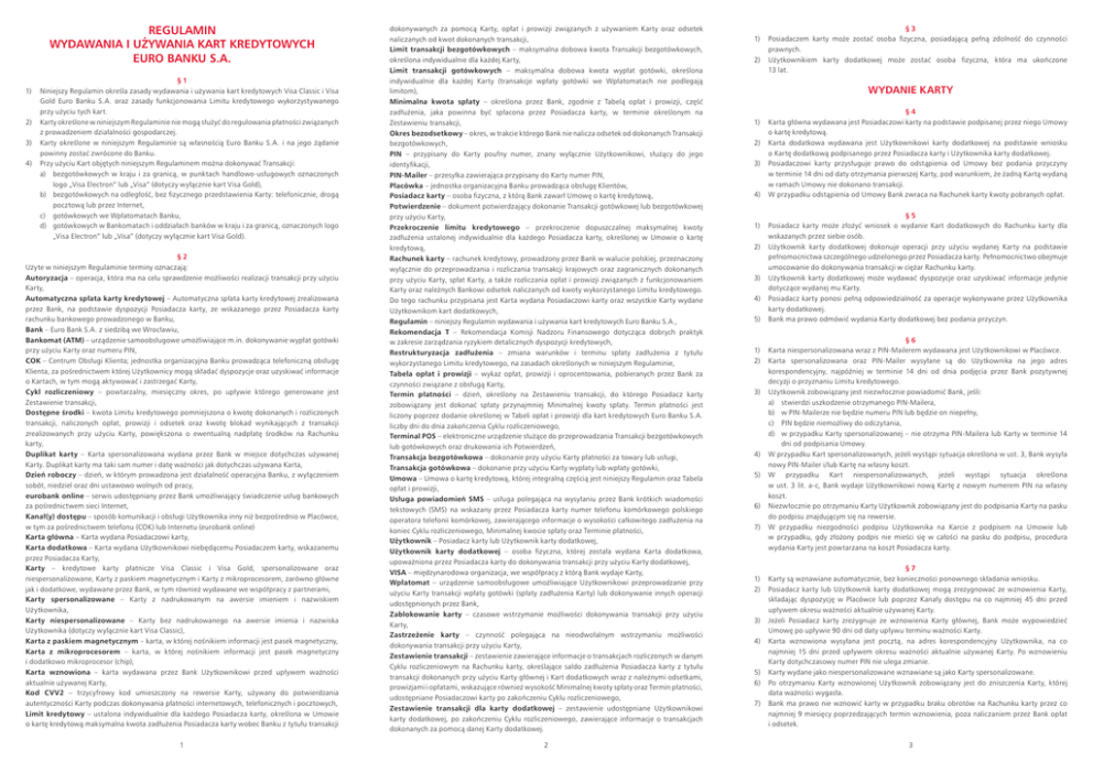 REGULAMIN WYDAWANIA I UŻYWANIA KART KREDYTOWYCH EURO BANKU S.A. §1 1) N iniejszy Regulamin określa zasady wydawania i używania kart kredytowych Visa Classic i Visa Gold Euro Banku S.A. oraz zasady funkcjonowania Limitu kredytowego wykorzystywanego przy użyciu tych kart. 2) K arty określone w niniejszym Regulaminie nie mogą służyć do regulowania płatności związanych z prowadzeniem działalności gospodarczej. 3) K arty określone w niniejszym Regulaminie są własnością Euro Banku S.A. i na jego żądanie powinny zostać zwrócone do Banku. 4) Przy użyciu Kart objętych niniejszym Regulaminem można dokonywać Transakcji: a) bezgotówkowych w kraju i za granicą, w punktach handlowo-usługowych oznaczonych logo „Visa Electron” lub „Visa” (dotyczy wyłącznie kart Visa Gold), b) bezgotówkowych na odległość, bez fizycznego przedstawienia Karty: telefonicznie, drogą pocztową lub przez Internet, c) gotówkowych we Wpłatomatach Banku, d) gotówkowych w Bankomatach i oddziałach banków w kraju i za granicą, oznaczonych logo „Visa Electron” lub „Visa” (dotyczy wyłącznie kart Visa Gold). §2 Użyte w niniejszym Regulaminie terminy oznaczają: Autoryzacja – operacja, która ma na celu sprawdzenie możliwości realizacji transakcji przy użyciu Karty, Automatyczna spłata karty kredytowej – Automatyczna spłata karty kredytowej zrealizowana przez Bank, na podstawie dyspozycji Posiadacza karty, ze wskazanego przez Posiadacza karty rachunku bankowego prowadzonego w Banku, Bank – Euro Bank S.A. z siedzibą we Wrocławiu, Bankomat (ATM) – urządzenie samoobsługowe umożliwiające m.in. dokonywanie wypłat gotówki przy użyciu Karty oraz numeru PIN, COK – Centrum Obsługi Klienta; jednostka organizacyjna Banku prowadząca telefoniczną obsługę Klienta, za pośrednictwem której Użytkownicy mogą składać dyspozycje oraz uzyskiwać informacje o Kartach, w tym mogą aktywować i zastrzegać Karty, Cykl rozliczeniowy – powtarzalny, miesięczny okres, po upływie którego generowane jest Zestawienie transakcji, Dostępne środki – kwota Limitu kredytowego pomniejszona o kwotę dokonanych i rozliczonych transakcji, naliczonych opłat, prowizji i odsetek oraz kwotę blokad wynikających z transakcji zrealizowanych przy użyciu Karty, powiększona o ewentualną nadpłatę środków na Rachunku karty, Duplikat karty – Karta spersonalizowana wydana przez Bank w miejsce dotychczas używanej Karty. Duplikat karty ma taki sam numer i datę ważności jak dotychczas używana Karta, Dzień roboczy – dzień, w którym prowadzona jest działalność operacyjna Banku, z wyłączeniem sobót, niedziel oraz dni ustawowo wolnych od pracy, eurobank online – serwis udostępniany przez Bank umożliwiający świadczenie usług bankowych za pośrednictwem sieci Internet, Kanał(y) dostępu – sposób komunikacji i obsługi Użytkownika inny niż bezpośrednio w Placówce, w tym za pośrednictwem telefonu (COK) lub Internetu (eurobank online) Karta główna – Karta wydana Posiadaczowi karty, Karta dodatkowa – Karta wydana Użytkownikowi niebędącemu Posiadaczem karty, wskazanemu przez Posiadacza Karty, Karty – kredytowe karty płatnicze Visa Classic i Visa Gold, spersonalizowane oraz niespersonalizowane, Karty z paskiem magnetycznym i Karty z mikroprocesorem, zarówno główne jak i dodatkowe, wydawane przez Bank, w tym również wydawane we współpracy z partnerami, Karty spersonalizowane – Karty z nadrukowanym na awersie imieniem i nazwiskiem Użytkownika, Karty niespersonalizowane – Karty bez nadrukowanego na awersie imienia i nazwiska Użytkownika (dotyczy wyłącznie kart Visa Classic), Karta z paskiem magnetycznym – karta, w której nośnikiem informacji jest pasek magnetyczny, Karta z mikroprocesorem – karta, w której nośnikiem informacji jest pasek magnetyczny i dodatkowo mikroprocesor (chip), Karta wznowiona – karta wydawana przez Bank Użytkownikowi przed upływem ważności aktualnie używanej Karty, Kod CVV2 – trzycyfrowy kod umieszczony na rewersie Karty, używany do potwierdzania autentyczności Karty podczas dokonywania płatności internetowych, telefonicznych i pocztowych, Limit kredytowy – ustalona indywidualnie dla każdego Posiadacza karty, określona w Umowie o kartę kredytową maksymalna kwota zadłużenia Posiadacza karty wobec Banku z tytułu transakcji 1 dokonywanych za pomocą Karty, opłat i prowizji związanych z używaniem Karty oraz odsetek naliczanych od kwot dokonanych transakcji, Limit transakcji bezgotówkowych – maksymalna dobowa kwota Transakcji bezgotówkowych, określona indywidualnie dla każdej Karty, Limit transakcji gotówkowych – maksymalna dobowa kwota wypłat gotówki, określona indywidualnie dla każdej Karty (transakcje wpłaty gotówki we Wpłatomatach nie podlegają limitom), Minimalna kwota spłaty – określona przez Bank, zgodnie z Tabelą opłat i prowizji, część zadłużenia, jaka powinna być spłacona przez Posiadacza karty, w terminie określonym na Zestawieniu transakcji, Okres bezodsetkowy – okres, w trakcie którego Bank nie nalicza odsetek od dokonanych Transakcji bezgotówkowych, PIN – przypisany do Karty poufny numer, znany wyłącznie Użytkownikowi, służący do jego identyfikacji, PIN-Mailer – przesyłka zawierająca przypisany do Karty numer PIN, Placówka – jednostka organizacyjna Banku prowadząca obsługę Klientów, Posiadacz karty – osoba fizyczna, z którą Bank zawarł Umowę o kartę kredytową, Potwierdzenie – dokument potwierdzający dokonanie Transakcji gotówkowej lub bezgotówkowej przy użyciu Karty, Przekroczenie limitu kredytowego – przekroczenie dopuszczalnej maksymalnej kwoty zadłużenia ustalonej indywidualnie dla każdego Posiadacza karty, określonej w Umowie o kartę kredytową, Rachunek karty – rachunek kredytowy, prowadzony przez Bank w walucie polskiej, przeznaczony wyłącznie do przeprowadzania i rozliczania transakc