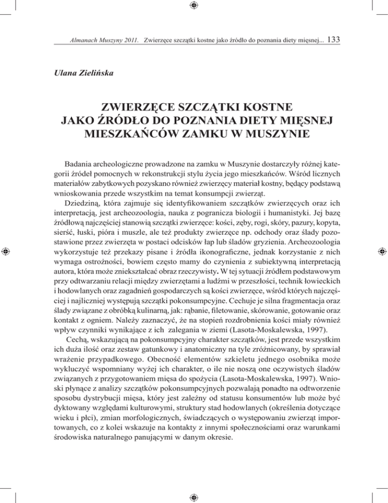 Almanach Muszyny 2011. Zwierzęce szczątki kostne jako źródło do poznania diety mięsnej... 133 Ulana Zielińska Zwierzęce szczątki kostne jako źródło do poznania diety mięsnej mieszkańców zamku w Muszynie Badania archeologiczne prowadzone na zamku w Muszynie dostarczyły różnej kategorii źródeł pomocnych w rekonstrukcji stylu życia jego mieszkańców. Wśród licznych materiałów zabytkowych pozyskano również zwierzęcy materiał kostny, będący podstawą wnioskowania przede wszystkim na temat konsumpcji zwierząt. Dziedziną, która zajmuje się identyfikowaniem szczątków zwierzęcych oraz ich interpretacją, jest archeozoologia, nauka z pogranicza biologii i humanistyki. Jej bazę źródłową najczęściej stanowią szczątki zwierzęce: kości, zęby, rogi, skóry, pazury, kopyta, sierść, łuski, pióra i muszle, ale też produkty zwierzęce np. odchody oraz ślady pozostawione przez zwierzęta w postaci odcisków łap lub śladów gryzienia. Archeozoologia wykorzystuje też przekazy pisane i źródła ikonograficzne, jednak korzystanie z nich wymaga ostrożności, bowiem często mamy do czynienia z subiektywną interpretacją autora, która może zniekształcać obraz rzeczywisty. W tej sytuacji źródłem podstawowym przy odtwarzaniu relacji między zwierzętami a ludźmi w przeszłości, technik łowieckich i hodowlanych oraz zagadnień gospodarczych są kości zwierzęce, wśród których najczęściej i najliczniej występują szczątki pokonsumpcyjne. Cechuje je silna fragmentacja oraz ślady związane z obróbką kulinarną, jak: rąbanie, filetowanie, skórowanie, gotowanie oraz kontakt z ogniem. Należy zaznaczyć, że na stopień rozdrobnienia kości miały również wpływ czynniki wynikające z ich zalegania w ziemi (Lasota-Moskalewska, 1997). Cechą, wskazującą na pokonsumpcyjny charakter szczątków, jest przede wszystkim ich duża ilość oraz zestaw gatunkowy i anatomiczny na tyle zróżnicowany, by sprawiał wrażenie przypadkowego. Obecność elementów szkieletu jednego osobnika może wykluczyć wspomniany wyżej ich charakter, o ile nie noszą one oczywistych śladów związanych z przygotowaniem mięsa do spożycia (Lasota-Moskalewska, 1997). Wnioski płynące z analizy szczątków pokonsumpcyjnych pozwalają ponadto na odtworzenie sposobu dystrybucji mięsa, który jest zależny od statusu konsumentów lub może być dyktowany względami kulturowymi, struktury stad hodowlanych (określenia dotyczące wieku i płci), zmian morfologicznych, świadczących o występowaniu zwierząt importowanych, co z kolei wskazuje na kontakty z innymi społecznościami oraz warunkami środowiska naturalnego panującymi w danym okresie. 134 Ulana Zielińska Badaniom poddano materiał kostny z wykopu VIIE, który obejmował wnętrze jednego z pomieszczeń dostawionych do murów obronnych. Pozyskany zeń materiał archeologiczny sugeruje, że wnętrze to zapewne przez jakiś czas pełniło funkcję gospodarczą, związaną m.in. z przetwarzaniem zboża (zob. Barbara Chudzińska w tym tomie, s. 9). Niestety z 367 analizowanych elementów kostnych około jedna trzecia nie nadawała się do identyfikacji ze względu na brak cech diagnostycznych. Przynależność gatunkową i anatomiczną szczątków kostnych, wiek uboju zwierząt, ich morfologię oraz ślady na powierzchni elementów kostnych ustalono w wyniku analizy makroskopowej. Stopień fragmentacji oraz ślady zaobserwowane na powierzchniach niektórych kości wskazują na pokonsumpcyjny charakter badanego materiału. Znamiona powstałe na skutek obróbki kulinarnej, występujące w postaci filetowania i nacinania nożem, odnotowano na żebrach bydła i świni. Większość żeber bydła i małych przeżuwaczy oraz kości długich bydła nosi ponadto cechy świadczące o tym, że elementy te były rąbane na mniejsze kawałki. Część materiału wykazuje ślady obróbki termicznej w postaci opaleń. Znamiona kontaktu z ogniem manifestujące się jako czarne opalenia mogły powstać zarówno w wyniku opiekania mięsa nad ogniem, jak i w trakcie zalegania kości w pobliżu ogniska. Z kolei działanie na kości wysokiej temperatury, rzędu 900° do 1000° C, powoduje ich całkowite spalenie objawiające się białym zabarwieniem, silnym spękaniem, zmianą kształtu oraz zmniejszeniem wymiarów (Kaczanowski i wsp., 1992). Tak zachowane szczątki zwierzęce znaleziono w warstwie pogorzeliska. Stwierdzono również, że część poddanego analizie materiału kostnego przez jakiś czas zalegała na powierzchni ziemi, nim przykryły go młodsze nawarstwienia. Wskazują na to ślady ogryzania przez psy, które chętnie pojawiały się w miejscach, w których człowiek porcjował i konsumował pożywienie. Kolejnych danych na temat zwyczajów kulinarnych mieszkańców zamku w Muszynie dostarczyła analiza składu gatunkowego, z której wynika, że w konsumpcji preferowano małe przeżuwacze, tzn. owcę i kozę. Nieco rzadziej jadano wołowinę i wieprzowinę (Tab. 1). Na większości stanowisk archeologicznych, datowanych na średniowiecze, gatunkiem dominującym w diecie była świnia (Lasota-Moskalewska, 1997), mając jednak na uwadze górskie położenie zamku, można przypuszczać, że przewaga małych przeżuwaczy wynikała z ich powszechnego występowania w tym środowisku. Ponieważ analizie poddano materiał z pomieszczenia, można też wysunąć przypuszczenie, że kości większych gatunków, takich jak bydło, były częściej usuwane niż szczątki niewielkich rozmiarów, pochodzące właśnie od owiec, kóz i świń. Mogłoby to tłumaczyć odmienny skład gatunkowy niż oczekiwany, jednak są to tylko przypuszczenia. Wśród zbadanych szczątków rozpoznano także trzy elementy kostne konia, jeden psa i kilkanaście kości ptasich. Ponieważ ani koń, ani pies nie są gatunkami hodowanymi w celach konsumpcyjnych, można przypuszczać, że ich obecność w badanym materiale jest przypadkowa. Alma