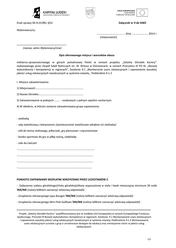 Znak sprawy SR.III.017/41-1/14 Załącznik nr 9 do SIWZ Wykonawca/cy: …………………………………. , dnia …………………… 2014 r. (miejscowość) …………………………………………………………….. (nazwa, adres Wykonawcy/ców) Opis oferowanego miejsca i warunków obozu militarno-sprawnościowego w górach południowej Polski w ramach projektu „Szkolny Ośrodek Kariery” realizowanego przez Zespół Szkół Rolniczych im. W. Witosa w Ostrożanach, w ramach Priorytetu IX PO KL „Rozwój wykształcenia i kompetencji w regionach”, Działanie 9.1 „Wyrównanie szans edukacyjnych i zapewnienie wysokiej jakości usług edukacyjnych świadczonych w systemie oświaty , Poddziałnie 9.1.2 I. Miejsce zakwaterowania: 1) Miejscowość:……………………………………………………………. 2) Nazwa Ośrodka:……………………………………………………….. 3) Zakwaterowanie w pokojach …….. - osobowych z pełnym węzłem sanitarnym. 4) W obiekcie, w którym zostanie zakwaterowana grupa zapewniamy: - stołówkę - salę świetlicową z telewizorem /pomieszczenie świetlicowe odrębne niż stołówka/ - stół do tenisa stołowego, piłkarzyki, gry planszowe i zręcznościowe - boiska sportowe do gry w piłkę nożną, siatkówkę - sale do ćwiczeń -………………………………………………………………………………………………….. -………………………………………………………………………………………………… -………………………………………………………………………………………………… -………………………………………………………………………………………………. PONADTO ZAPEWNIAMY BEZPŁATNE KORZYSTANIE PRZEZ UCZESTNIKÓW Z: - Zadaszonej szałasu góralskiego/chaty góralskiej/altany wyposażonej w stoły i ławki mieszczącej minimum 20 osób TAK/NIE (należy kółkiem zaznaczyć właściwą odpowiedź) - Urządzenia rekreacyjnego typu Bungee TAK/NIE (należy kółkiem zaznaczyć właściwą odpowiedź) - Urządzenia rekreacyjnego Mini Pole Golfowe TAK/NIE (należy kółkiem zaznaczyć właściwą odpowiedź) Projekt „Szkolny Ośrodek Kariery” współfinansowany jest ze środków Unii Europejskiej w ramach Europejskiego Funduszu Społecznego, Priorytet IX Rozwój wykształcenia i kompetencji w regionach. Działanie: 9.1 Wyrównywanie szans edukacyjnych i zapewnienie wysokiej jakości usług edukacyjnych świadczonych w systemie oświaty, Poddziałanie 9.1.2 Wyrównywanie szans edukacyjnych uczniów z grup o utrudnionym dostępie do edukacji oraz zmniejszenie różnic w jakości usług edukacyjnych. 1/2 - Telewizora w każdym pokoju z podstawowym pakietem programowym TAK/NIE (należy kółkiem zaznaczyć właściwą odpowiedź) - Dostępu do Wi-Fi na terenie Ośrodka TAK/NIE (należy kółkiem zaznaczyć właściwą odpowiedź) - Basenu krytego wewnątrz budynku Ośrodka TAK/NIE (należy kółkiem zaznaczyć właściwą odpowiedź) - Basenu odkrytego na terenie Ośrodka TAK/NIE (należy kółkiem zaznaczyć właściwą odpowiedź) - Kortu tenisowego wraz ze sprzętem TAK/NIE (należy kółkiem zaznaczyć właściwą odpowiedź) - Wypożyczalni sprzętu rekreacyjnego – rowerów lub gokartów terenowych /bez silników/ - skorzystanie przez uczestników minimum raz w turnusie TAK/NIE (należy kółkiem zaznaczyć właściwą odpowiedź). - Bilardu TAK/NIE (należy kółkiem zaznaczyć właściwą odpowiedź) UWAGA 1. Zamawiający zastrzega sobie prawo do przeprowadzenia wizji zaoferowanego Ośrodka (podczas wizji należy wskazać konkretne pokoje)oraz pomieszczenia, z których korzystać będą uczestnicy obozu. ………………… ………..dnia …………………. …………………………………………………………………………… (pieczątka i podpis wykonawcy lub upoważnionego przedstawiciela wykonawcy) Projekt „Szkolny Ośrodek Kariery” współfinansowany jest ze środków Unii Europejskiej w ramach Europejskiego Funduszu Społecznego, Priorytet IX Rozwój wykształcenia i kompetencji w regionach. Działanie: 9.1 Wyrównywanie szans edukacyjnych i zapewnienie wysokiej jakości usług edukacyjnych świadczonych w systemie oświaty, Poddziałanie 9.1.2 Wyrównywanie szans edukacyjnych uczniów z grup o utrudnionym dostępie do edukacji oraz zmniejszenie różnic w jakości usług edukacyjnych. 2/2