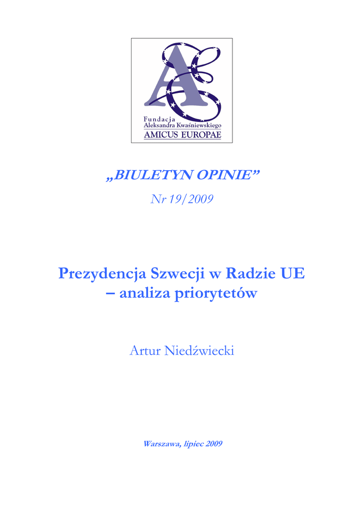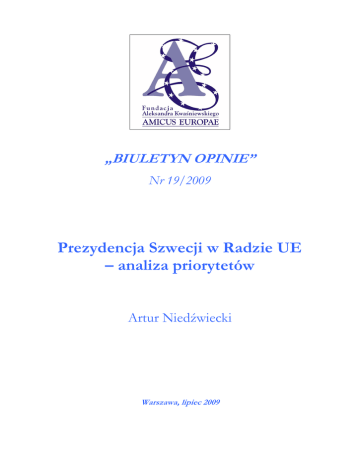 „BIULETYN OPINIE” Nr 19/2009 Prezydencja Szwecji w Radzie UE – analiza priorytetów Artur Niedźwiecki Warszawa, lipiec 2009 „Biuletyn OPINIE” Fundacji Amicus Europae nr 19/2009 _____________________________________________________________________________________________________________________________________________________________________________________________________________________________________________ Wprowadzenie Królestwo Szwecji sprawuje obecnie po raz drugi przewodnictwo w Radzie Unii Europejskiej. Aktualny kontekst międzynarodowy pozostaje jednak zasadniczo odmienny od stanu relacji europejskich w pierwszej połowie 2001 r., gdy Sztokholm obejmował prezydencję jako stosunkowo nowe państwo członkowskie. Wówczas proces integracji europejskiej zogniskowany był na przygotowaniach do reformy instytucjonalnej UE. Wewnętrznie skonsolidowana Unia Europejska negocjowała ponadto warunki najbardziej doniosłego piątego rozszerzenia geograficznego. Obecnie jednak projekt europejski wydaje się dryfować w nieznanym kierunku. W kręgach europejskich sygnalizowana jest potrzeba wskazania trajektorii rozwoju integracji, co w naturalny sposób kieruje oczekiwania w stronę państwa sprawującego przewodnictwo w Radzie UE. Prezydencja Republiki Czeskiej, która zakończyła się w czerwcu br., uwydatniła jednak inercję oraz marazm integracji europejskiej w tej materii. Szwecja w Unii Europejskiej Od czasu akcesji Szwecji do Unii Europejskiej w 1995 r., kierownictwo tego nordyckiego państwa podkreśla, iŜ integracja europejska pozostaje najbardziej dogodną platformą realizacji polityki zagranicznej Sztokholmu1. Konstatacja ta wydaje się jednak nie wypełniać strategii „sytuowania kraju w głównym nurcie integracji europejskiej”. Kreacja szwedzkiej polityki europejskiej polega bowiem na próbie utworzenia spójnej toŜsamości politycznej w obrębie Unii Europejskiej. Jej zasadniczym elementem jest przeświadczenie o własnej podmiotowości w stosunkach międzynarodowych2. Szwecja jako państwo nie odnotowała w perspektywie historycznej doświadczenia utraty niepodległości. Sztokholm dąŜy zatem do wypracowała unikalnej kultury bezpieczeństwa, której fundamentem jest wiara we własne siły oraz moŜliwości oddziaływania na otoczenie międzynarodowe. W opinii ekspertów Szwecja umiejętnie realizuje program „państwa inteligentnego”, które w pełni wykorzystuje wszelkie atuty w polityce międzynarodowej3. Koordynacja polityki europejskiej Sztokholmu polega na rozległych uprawnieniami premiera, który ponosi pełną odpowiedzialność za funkcjonowanie tej płaszczyzny aktywności państwa. Wśród najistotniejszych jego kompetencji na uwagę zasługuje szczególnie określanie całościowej strategii kraju względem UE, wyznaczanie szwedzkich preferencji odnośnie poŜądanej ewolucji projektu europejskiego, dbałość o spoistość polityki europejskiej Szwecji oraz rozwiązywanie konfliktów między szefami poszczególnych resortów na tle spraw europejskich. W kancelarii premiera funkcjonuje Biuro ds. Koordynacji Europejskiej wraz z ministrem ds. Unii Europejskiej. Instytucja ta pomaga określić wytyczne dla Stałego Przedstawicielstwa Szwecji przy 1 C. Bildt, Statement of Government Policy in the Parliamentary Debate on Foreign Affairs, 18 February 2009. 2 M. A. Cichocki, O. Osica, Konsolidacja czy dezintegracja? Bezpieczeństwo w subregionie Morza Bałtyckiego, „Nowa Europa”, Numer specjalny 2009, s. 34. 3 P. Grudziński, Państwo inteligentne. Polska w poszukiwaniu międzynarodowej roli, Toruń 2008. 2 „Biuletyn OPINIE” Fundacji Amicus Europae nr 19/2009 _____________________________________________________________________________________________________________________________________________________________________________________________________________________________________________ Unii Europejskiej. BieŜącymi kwestiami europejskimi zajmuje się departament europejski w Ministerstwie Spraw Zagranicznych. Funkcja zwornika prezentowanego systemu leŜy w gestii kancelarii szefa szwedzkiego rządu. Poszczególne ministerstwa odpowiadają za przygotowanie stanowisk odnośnie konkretnych obszarów integracji europejskiej, które następnie rozpatrywane są przez Radę Ministrów. Szefowie stosownych resortów prezentują teŜ szwedzkie postulaty na forum Rady UE, obradującej w określonej konfiguracji. Na ostateczny kształt stanowiska rządu szwedzkiego w kwestiach europejskich wpływ mają zatem konsultację pomiędzy premierem, szefem właściwego merytorycznie resortu, ministerstwem spraw zagranicznych, ministerstwem finansów oraz szwedzkim parlamentem. Analizując materialną stronę polityki europejskiej Szwecji warto podkreślić, iŜ zasadniczym obszarem zainteresowań tego nordyckiego państwa pozostaje subregion Morza Bałtyckiego, w ramach którego Sztokholm stara się wykazać znaczącą aktywnością. W istocie Bałtyk pełni rolę podstawowej kategorii geopolitycznej dla Szwecji, a takŜe kluczowej determinanty w rozwaŜaniach na temat bezpieczeństwa międzynarodowego. Innym aspektem toŜsamości państwa szwedzkiego w polityce międzynarodowej pozostaje neutralność, która zakazuje prowadzenia polityki wikłania kraju w oficjalne członkostwo w ramach sojuszy militarnych. Strategia ta przekłada się na postawę o charakterze defensywnym oraz działania Szwecji na rzecz rozbudowy indywidualnych zdolności do zagwarantowania bezpieczeństwa. Ze względu na doświadczenia polityki imperialnej, Szwecja uchyla się jednak od postawy izolacjonistycznej poprzez aktywność na forum Unii Europejskiej, politykę „cichego członka” Sojuszu Północnoatlantyckiego oraz zainteresowanie kwestiami globalnymi w ramach Organizacji Narodów Zjednoczonych4. Kluczową agendą Sztokholmu na forum międzynarodowym pozostaje promocja prawa międzynarodowego oraz działań humanitarnych, a takŜe kwestie ochrony środowiska 