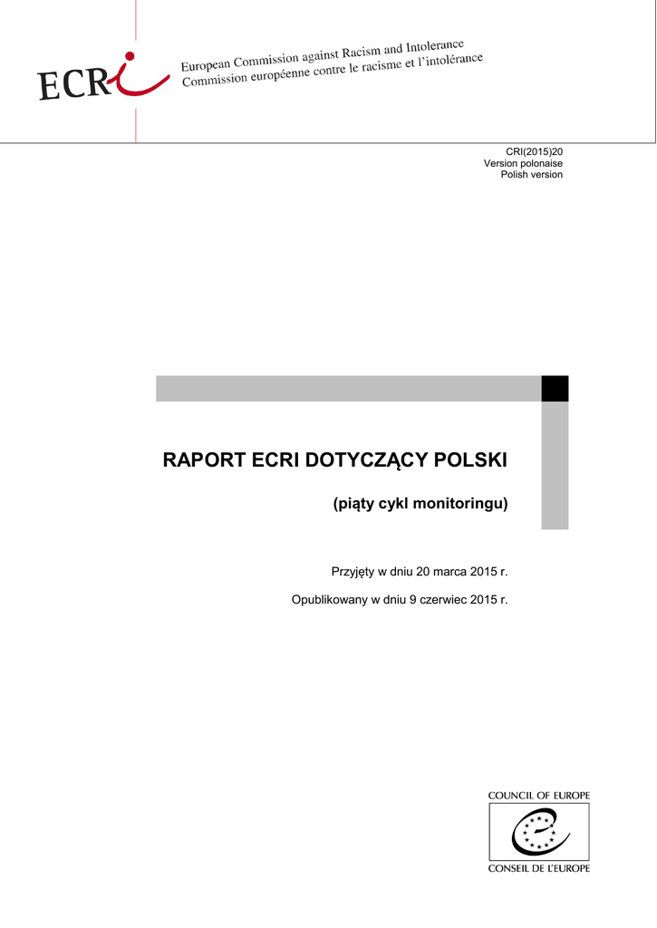 CRI(2015)20 Version polonaise Polish version RAPORT ECRI DOTYCZĄCY POLSKI (piąty cykl monitoringu) Przyjęty w dniu 20 marca 2015 r. Opublikowany w dniu 9 czerwiec 2015 r. ECRI Secretariat Directorate General II - Democracy Council of Europe F-67075 STRASBOURG Cedex Tel.: + 33 (0) 3 90 21 46 62 Fax: + 33 (0) 3 88 41 39 87 E-mail: [email protected] www.coe.int/ecri RAPORT ECRI DOTYCZĄCY POLSKI (piąty cykl monitoringu) Przyjęty w dniu 20 marca 2015 r. Opublikowany w dniu 9 czerwiec 2015 r. Proszę zwrócić uwagę, iż niniejszy dokument stanowi tłumaczenie. W razie wątpliwości należy posługiwać się jego oryginalnymi wersjami w językach angielskim i francuskim. SPIS TREŚCI WSTEP ......................................................................................................................... 7 STRESZCZENIE .......................................................................................................... 9 USTALENIA I ZALECENIA ........................................................................................ 11 I. WSPÓLNE TEMATY ...................................................................................... 11 1. PRAWODAWSTWO PRZECIWKO RASIZMOWI I DYSKRYMINACJI RASOWEJ ......... 11 PROTOKÓŁ NR 12 DO EUROPEJSKIEJ KONWENCJI PRAW CZŁOWIEKA ........... 11 PRAWO KARNE .......................................................................................... 11 PRAWO CYWILNE I ADMINISTRACYJNE ......................................................... 14 NIEZALEŻNE ORGANY WYSPECJALIZOWANE (ZOP NR 2 I 7) .......................... 15 2. RASISTOWSKA I HOMO/TRANSFOBICZNA MOWA NIENAWIŚCI.......................... 17 KWALIFIKACJA HOMO/TRANSFOBICZNEJ MOWY NIENAWIŚCI W KODEKSIE KARNYM .................................................................................................... 17 DYSKURS POLITYCZNY ............................................................................... 17 EKSTREMIZM ............................................................................................. 17 RASIZM W INTERNECIE I W MEDIACH ........................................................... 18 REAKCJA WŁADZ ....................................................................................... 19 3. PRZEMOC NA TLE RASISTOWSKIM I HOMO/TRANSFOBICZNYM ........................ 21 KWALIFIKACJA PRZEMOCY NA TLE HOMO/TRANSFOBICZNYM W KODEKSIE KARNYM .................................................................................................... 21 REAKCJA WŁADZ ....................................................................................... 22 4. POLITYKI INTEGRACYJNE............................................................................ 24 II. TEMATY SZCZEGÓLNE DLA POLSKI .......................................................... 29 1. ZALECENIA 4. CYKLU BĘDĄCE PRZEDMIOTEM TYMCZASOWEJ OCENY ............. 29 PRZYJĘCIE KOMPLEKSOWEGO PRAWA ANTYDYSKRYMINACYJNEGO .............. 29 NIEZALEŻNE ORGANY WYSPECJALIZOWANE (ZOP NR 2 I 7) .......................... 29 RASIZM W CZASIE WYDARZEŃ SPORTOWYCH I MECZÓW PIŁKI NOŻNEJ ........... 29 2. POLITYKI ZWALCZANIA DYSKRYMINACJI I NIETOLERANCJI WOBEC OSÓB LGBT .............................................................................................. 31 DANE........................................................................................................ 31 KWESTIE PRAWNE ..................................................................................... 32 DYSKRYMINACJA W RÓŻNYCH SFERACH ...................................................... 33 ZALECENIA OPARTE NA PRZYJĘTYCH USTALENIACH ....................................... 35 LISTA ZALECEŃ ....................................................................................................... 37 BIBLIOGRAFIA .......................................................................................................... 41 ZAŁĄCZNIK: PUNKT WIDZENIA RZĄDU ................................................................. 45 5 WSTĘP Europejska Komisja przeciwko Rasizmowi i Nietolerancji (ECRI), ustanowiona przez Radę Europy jest niezależnym organem monitorującym przestrzeganie praw człowieka, wyspecjalizowanym w kwestiach związanych z rasizmem i nietolerancją. Członkami Komisji są osoby niezależne i bezstronne, powoływane na podstawie ich autorytetu moralnego i uznanego doświadczenia w zakresie rasizmu, ksenofobii, antysemityzmu i nietolerancji. W ramach swojej działalności mandatowej ECRI prowadzi monitoring poszczególnych krajów, w ramach którego analizuje sytuację w każdym kraju członkowskim w zakresie rasizmu i nietolerancji oraz formułuje sugestie i propozycje sposobu radzenia sobie ze wskazanymi problemami. Monitoring poszczególnych krajów przez ECRI dotyczy w równym stopniu wszystkie państwa członkowskie Rady Europy. Odbywa się w pięcioletnich cyklach, obejmuje 910 krajów rocznie. Raporty z pierwszej rundy zostały ukończone pod koniec 1998 r., raporty z drugiej rundy pod koniec 2002 r., z trzeciej rundy z końcem 2007 r., raporty z czwartej rundy powinny zostać ukończone pod koniec 2014 r. Praca nad raportami z piątej rundy została rozpoczęta w listopadzie 2012 r. Metody pracy nad raportami to analiza dokumentów, wizyty w poszczególnych krajach, a następnie poufny dialog z władzami krajowymi. Raporty ECRI nie są efektem śledztw czy zeznań i dowodów procesowych. Są to analizy oparte na wielu informacjach zebranych z różnych źródeł. Analiza dokumentów opiera się na znacznej liczbie krajowych i międzynarodowych źródeł pisemnych. Wizyty na miejscu dają okazję do spotkań z podmiotami bezpośrednio zainteresowanymi (zarówno rządowymi, jak i pozarządowymi) i mają na celu zebranie szczegółowych informacji. Proces poufnego dialogu z władzami krajowymi pozwala im na przedstawienie, jeśli uznają to za konieczne, komentarzy do projektu raportu, w celu skorygowanie wszelkich możliwych b
