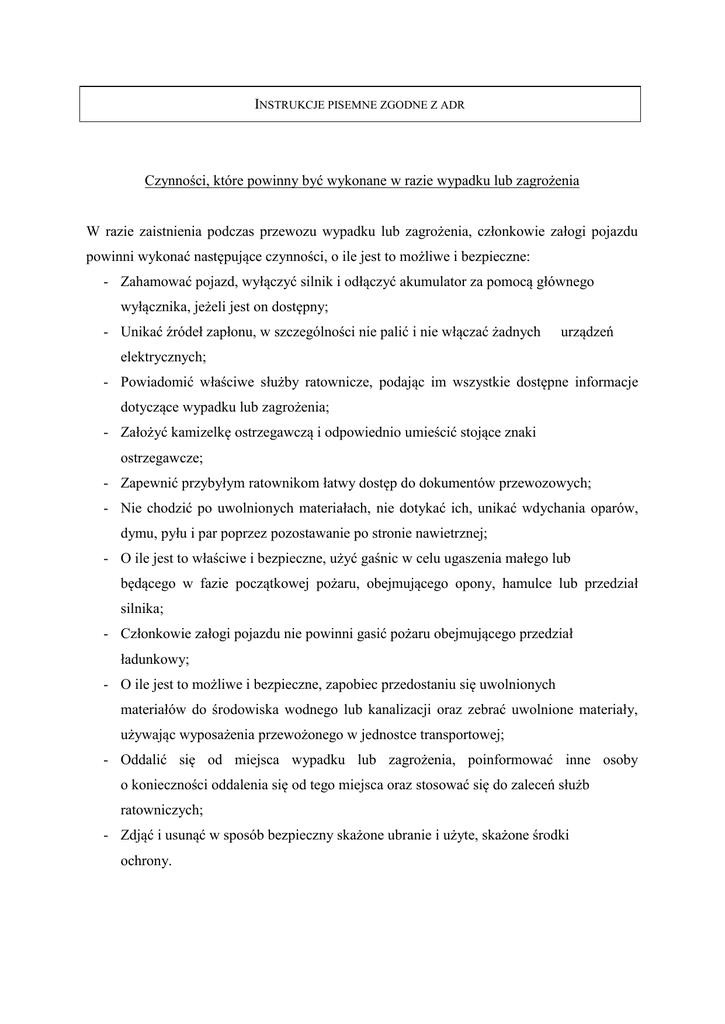 INSTRUKCJE PISEMNE ZGODNE Z ADR Czynności, które powinny być wykonane w razie wypadku lub zagrożenia W razie zaistnienia podczas przewozu wypadku lub zagrożenia, członkowie załogi pojazdu powinni wykonać następujące czynności, o ile jest to możliwe i bezpieczne: - Zahamować pojazd, wyłączyć silnik i odłączyć akumulator za pomocą głównego wyłącznika, jeżeli jest on dostępny; - Unikać źródeł zapłonu, w szczególności nie palić i nie włączać żadnych urządzeń elektrycznych; - Powiadomić właściwe służby ratownicze, podając im wszystkie dostępne informacje dotyczące wypadku lub zagrożenia; - Założyć kamizelkę ostrzegawczą i odpowiednio umieścić stojące znaki ostrzegawcze; - Zapewnić przybyłym ratownikom łatwy dostęp do dokumentów przewozowych; - Nie chodzić po uwolnionych materiałach, nie dotykać ich, unikać wdychania oparów, dymu, pyłu i par poprzez pozostawanie po stronie nawietrznej; - O ile jest to właściwe i bezpieczne, użyć gaśnic w celu ugaszenia małego lub będącego w fazie początkowej pożaru, obejmującego opony, hamulce lub przedział silnika; - Członkowie załogi pojazdu nie powinni gasić pożaru obejmującego przedział ładunkowy; - O ile jest to możliwe i bezpieczne, zapobiec przedostaniu się uwolnionych materiałów do środowiska wodnego lub kanalizacji oraz zebrać uwolnione materiały, używając wyposażenia przewożonego w jednostce transportowej; - Oddalić się od miejsca wypadku lub zagrożenia, poinformować inne osoby o konieczności oddalenia się od tego miejsca oraz stosować się do zaleceń służb ratowniczych; - Zdjąć i usunąć w sposób bezpieczny skażone ubranie i użyte, skażone środki ochrony. Dodatkowe wskazówki dla członków załogi pojazdu dotyczące charakterystyki zagrożeń stwarzanych przez towary niebezpieczne określonej klasy oraz czynności zależnych od zaistniałych okoliczności Nalepki ostrzegawcze Charakterystyka zagrożeń Wskazówki dodatkowe (1) Materiały i przedmioty wybuchowe (2) (3) 1 1.5 1.6 Materiały i przedmioty wybuchowe 1.4 Gazy palne 2.1 Gazy niepalne i nietrujące Mogą posiadać różne właściwości powodujące efekty takie, jak wybuch masowy, rozrzut odłamków, intensywny ogień / promieniowanie cieplne, świecenie, huk lub wydzielanie dymu. Są wrażliwe na wstrząsy i/lub uderzenia i/lub ciepło. Schronić się i pozostać z dala od okien. Niewielkie zagrożenie wybuchem i pożarem. Schronić się. Zagrożenie pożarem. Zagrożenie wybuchem. Mogą znajdować się pod ciśnieniem. Zagrożenie działaniem duszącym. Mogą powodować poparzenia lub odmrożenia. Zagrożenie wybuchem w przypadku ogrzania. Schronić się. Unikać zagłębień terenu. Zagrożenie działaniem duszącym. Mogą znajdować się pod ciśnieniem. Mogą powodować odmrożenia. Zagrożenie wybuchem w przypadku ogrzania. Schronić się. Unikać zagłębień terenu. Zagrożenie zatruciem. Mogą znajdować się pod ciśnieniem. Mogą powodować oparzenia chemiczne lub odmrożenia. Zagrożenie wybuchem w przypadku ogrzania. Użyć maski ucieczkowej. Schronić się. Unikać zagłębień terenu. Zagrożenie pożarem. Zagrożenie wybuchem. Zagrożenie wybuchem w przypadku ogrzania. Schronić się. Unikać zagłębień terenu. 2.2 Gazy trujące 2.3 Materiały ciekłe palne 3 Materiały stałe zapalne, materiały samoreaktywne i materiały wybuchowe stałe odczulone 4.1 Zagrożenie pożarem. Materiały łatwopalne lub palne. Mogą zapalić się na skutek działania ciepła, iskier lub otwartego płomienia. Mogą zawierać materiały samoreaktywne, które mogą rozkładać się egzotermicznie w wyniku dostarczenia ciepła, kontaktu z innymi materiałami (takimi jak kwasy, związku metali ciężkich lub aminy), tarcia lub uderzenia. W wyniku rozkładu mogą wydzielać się szkodliwe i palne pary lub gazy lub może nastąpić samozapalenie. Zagrożenie wybuchem w przypadku ogrzania. Zagrożenie wybuchem materiałów wybuchowych odczulonych w przypadku utraty substancji odczulającej. Materiały samozapalne Zagrożenie pożarem wskutek samozapalenia w przypadku uszkodzenia sztuk przesyłki lub uwolnienia się zawartości. Mogą gwałtownie reagować z wodą. 4.2 Materiały wytwarzające w zetknięciu z wodą gazy palne Zagrożenie pożarem i wybuchem w przypadku kontaktu z wodą. 4.3 Uwolniony materiał powinien być utrzymywany w stanie suchym pod przykryciem. Nalepki ostrzegawcze (1) Materiały utleniające 5.1 Nadtlenki organiczne 5.2 Materiały trujące Charakterystyka zagrożeń (2) Wskazówki dodatkowe (3) Zagrożenie gwałtowną reakcją, pożarem i wybuchem w przypadku kontaktu z materiałami palnymi. Nie dopuszczać do zmieszania z materiałami palnymi (np.: trocinami) Zagrożenie rozkładem egzotermicznym w podwyższonej temperaturze wskutek kontaktu z innymi materiałami (takimi jak kwasy, związki metali ciężkich lub aminy), tarcia lub uderzenia. W wyniku rozkładu mogą wydzielać się szkodliwe i palne pary lub gazy lub może nastąpić samozapalenie. Nie dopuszczać do zmieszania z materiałami palnymi (np.: trocinami) Zagrożenie zatruciem w wyniku wdychania, kontaktu ze skórą lub połknięcia. Zagrożenie w przypadku przedostania się do środowiska wodnego lub kanalizacji. Użyć maski ucieczkowej. 6.1 Materiały zakaźne Zagrożenie zakażeniem. Może spowodować groźną chorobę u ludzi lub u zwierząt. Zagrożenie w przypadku przedostania się do środowiska wodnego lub kanalizacji. 6.2 Materiały promieniotwórcze 7A 7B Zagrożenie wchłonięciem i napromieniowaniem zewnętrznym. Ograniczyć czas narażenia. 7C 7D Materiał rozszczepialny Zagrożenie reakcją łańcuchową. 7E Materiały żrące Zagrożenie poparzeniem chemicznym. Mogą gwałtownie reagować ze sobą, z wodą lub z innymi materiałami Uwolnione materiały mogą wydzielać żrące pary. Zagrożenie w przypadku przedostania się do środowiska wodnego lub kanalizacji. 8 Różne materiał