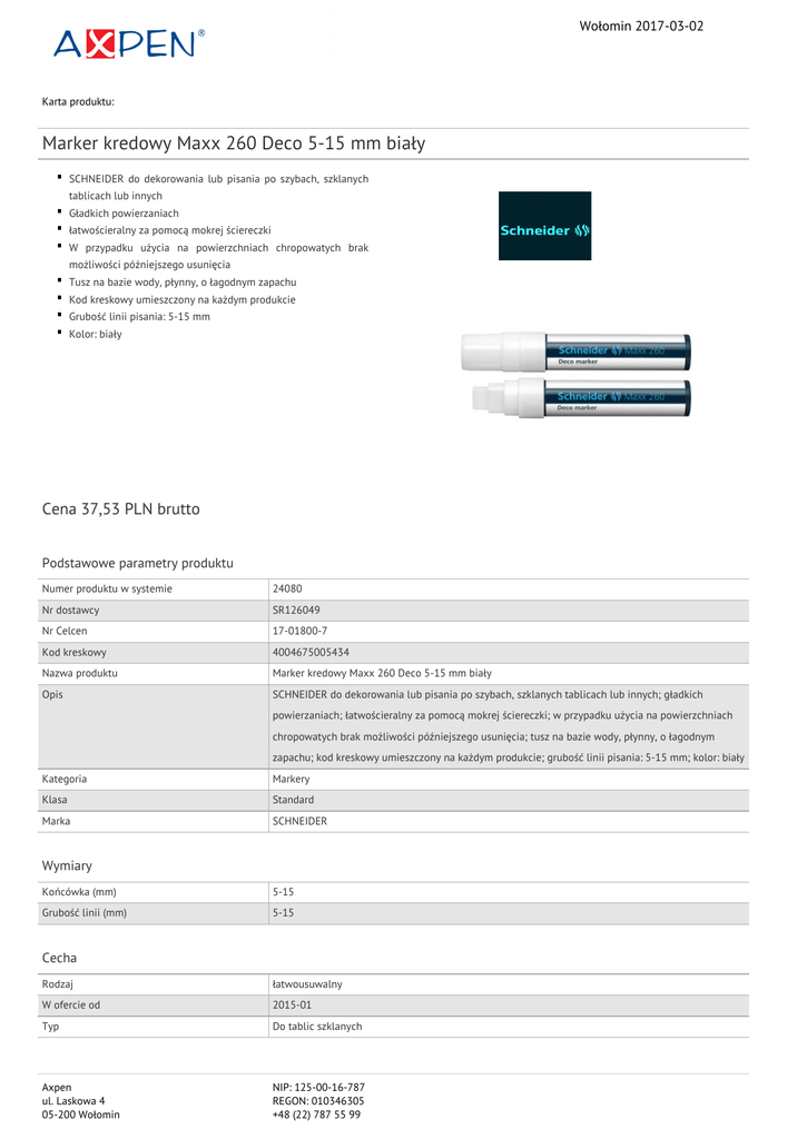 Wołomin 2017-03-02 Karta produktu: Marker kredowy Maxx 260 Deco 5-15 mm biały SCHNEIDER do dekorowania lub pisania po szybach, szklanych tablicach lub innych Gładkich powierzaniach łatwościeralny za pomocą mokrej ściereczki W przypadku użycia na powierzchniach chropowatych brak możliwości późniejszego usunięcia Tusz na bazie wody, płynny, o łagodnym zapachu Kod kreskowy umieszczony na każdym produkcie Grubość linii pisania: 5-15 mm Kolor: biały Cena 37,53 PLN brutto Podstawowe parametry produktu Numer produktu w systemie 24080 Nr dostawcy SR126049 Nr Celcen 17-01800-7 Kod kreskowy 4004675005434 Nazwa produktu Marker kredowy Maxx 260 Deco 5-15 mm biały Opis SCHNEIDER do dekorowania lub pisania po szybach, szklanych tablicach lub innych; gładkich powierzaniach; łatwościeralny za pomocą mokrej ściereczki; w przypadku użycia na powierzchniach chropowatych brak możliwości późniejszego usunięcia; tusz na bazie wody, płynny, o łagodnym zapachu; kod kreskowy umieszczony na każdym produkcie; grubość linii pisania: 5-15 mm; kolor: biały Kategoria Markery Klasa Standard Marka SCHNEIDER Wymiary Końcówka (mm) 5-15 Grubość linii (mm) 5-15 Cecha Rodzaj łatwousuwalny W ofercie od 2015-01 Typ Do tablic szklanych Axpen ul. Laskowa 4 05-200 Wołomin NIP: 125-00-16-787 REGON: 010346305 +48 (22) 787 55 99 Wołomin 2017-03-02 Karta katalogowa produktu cd. Marker kredowy Maxx 260 Deco 5-15 mm biały Produkt Marker kredowy Wspólny słownik zamówień CPV 30192125-3 Pisaki Certyfikaty Nowy produkt w ofercie Standard Hit Standard Kolor Kolor Biały Serdecznie zapraszamy do współpracy Axpen zespół. Axpen ul. Laskowa 4 05-200 Wołomin NIP: 125-00-16-787 REGON: 010346305 +48 (22) 787 55 99