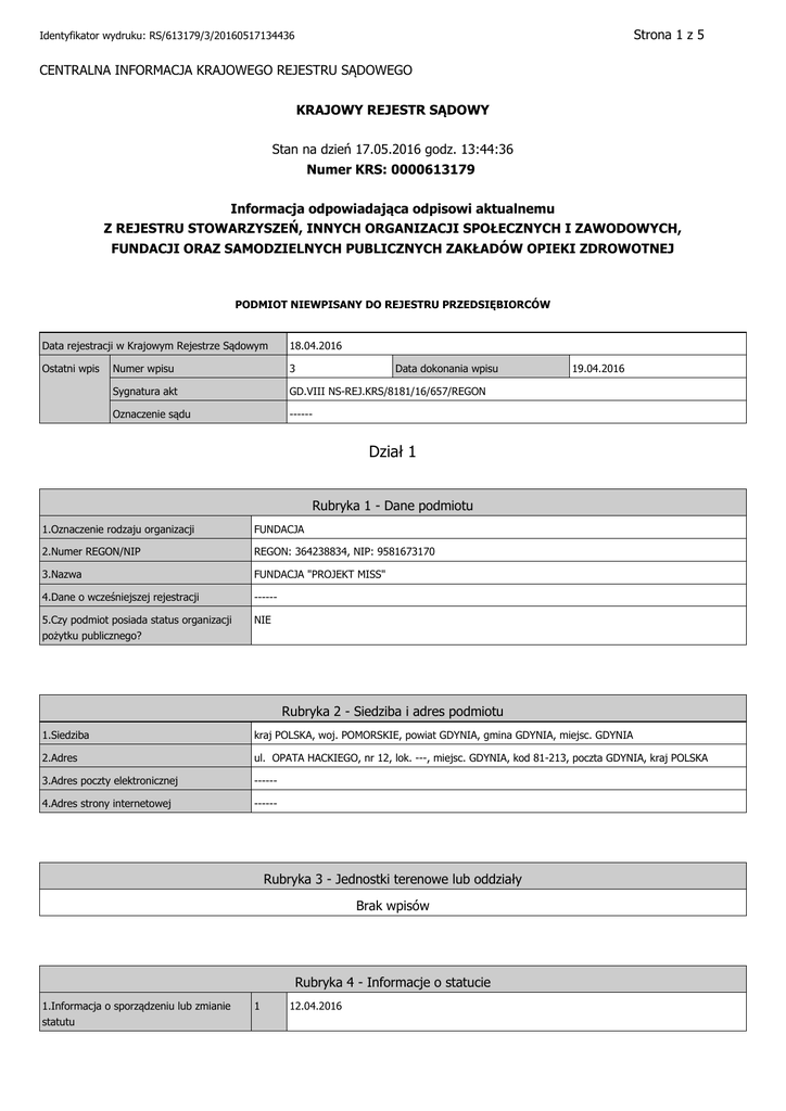 Strona 1 z 5 Identyfikator wydruku: RS/613179/3/20160517134436 CENTRALNA INFORMACJA KRAJOWEGO REJESTRU SĄDOWEGO KRAJOWY REJESTR SĄDOWY Stan na dzień 17.05.2016 godz. 13:44:36 Numer KRS: 0000613179 Informacja odpowiadająca odpisowi aktualnemu Z REJESTRU STOWARZYSZEŃ, INNYCH ORGANIZACJI SPOŁECZNYCH I ZAWODOWYCH, FUNDACJI ORAZ SAMODZIELNYCH PUBLICZNYCH ZAKŁADÓW OPIEKI ZDROWOTNEJ PODMIOT NIEWPISANY DO REJESTRU PRZEDSIĘBIORCÓW Data rejestracji w Krajowym Rejestrze Sądowym 18.04.2016 Ostatni wpis Numer wpisu 3 Sygnatura akt GD.VIII NS-REJ.KRS/8181/16/657/REGON Oznaczenie sądu ------ Data dokonania wpisu 19.04.2016 Dział 1 Rubryka 1 - Dane podmiotu 1.Oznaczenie rodzaju organizacji FUNDACJA 2.Numer REGON/NIP REGON: 364238834, NIP: 9581673170 3.Nazwa FUNDACJA "PROJEKT MISS" 4.Dane o wcześniejszej rejestracji ------ 5.Czy podmiot posiada status organizacji pożytku publicznego? NIE Rubryka 2 - Siedziba i adres podmiotu 1.Siedziba kraj POLSKA, woj. POMORSKIE, powiat GDYNIA, gmina GDYNIA, miejsc. GDYNIA 2.Adres ul. OPATA HACKIEGO, nr 12, lok. ---, miejsc. GDYNIA, kod 81-213, poczta GDYNIA, kraj POLSKA 3.Adres poczty elektronicznej ------ 4.Adres strony internetowej ------ Rubryka 3 - Jednostki terenowe lub oddziały Brak wpisów Rubryka 4 - Informacje o statucie 1.Informacja o sporządzeniu lub zmianie statutu 1 12.04.2016 Strona 2 z 5 Identyfikator wydruku: RS/613179/3/20160517134436 Rubryka 5 1.Czas, na jaki została utworzona organizacja NIEOZNACZONY Rubryka 6 - Sposób powstania podmiotu Brak wpisów Rubryka 7 - Nie dotyczy Brak wpisów Rubryka 8 - Organ sprawujący nadzór 1.Nazwa organu MINISTER KULTURY I DZIEDZICTWA NARODOWEGO Dział 2 Rubryka 1 - Organ uprawniony do reprezentacji podmiotu 1.Nazwa organu uprawnionego do reprezentowania podmiotu ZARZĄD 2.Sposób reprezentacji podmiotu DO SKŁADANIA OŚWIADCZEŃ WOLI W SPRAWACH MAJĄTKOWYCH I NIEMAJĄTKOWYCH W ZAKRESIE ZWYKŁEGO ZARZĄDU, PROWADZENIA BIEŻĄCEJ DZIAŁALNOŚCI I REPREZENTOWANIA FUNDACJI NA ZEWNĄTRZ UPRAWNIENI SĄ PREZES I WICEPREZESI SAMODZIELNIE LUB DWÓCH POZOSTAŁYCH CZŁONKÓW ŁĄCZNIE. Podrubryka 1 Dane osób wchodzących w skład organu 1 2 3 1.Nazwisko / Nazwa lub firma SZOSTAK 2.Imiona ARTUR 3.Numer PESEL/REGON 83010802750 4.Numer KRS **** 5.Funkcja w organie reprezentującym PREZES ZARZĄDU 1.Nazwisko / Nazwa lub firma SZOSTAK 2.Imiona MILENA ANNA 3.Numer PESEL/REGON 86012901427 4.Numer KRS **** 5.Funkcja w organie reprezentującym WICEPREZES ZARZĄDU 1.Nazwisko / Nazwa lub firma LEMAŃSKA 2.Imiona MONIKA MAGDALENA 3.Numer PESEL/REGON 90081212809 4.Numer KRS **** 5.Funkcja w organie reprezentującym WICEPREZES ZARZĄDU Strona 3 z 5 Identyfikator wydruku: RS/613179/3/20160517134436 Rubryka 2 - Organ nadzoru Brak wpisów Rubryka 3 Brak wpisów Dział 3 Rubryka 1 - Nie dotyczy Brak wpisów Rubryka 2 - Wzmianki o złożonych dokumentach Brak wpisów Rubryka 3 - Cel działania organizacji 1.Cel działania CELEM FUNDACJI JEST DZIAŁALNOŚĆ NA RZECZ ROZWOJU SFER ZWIĄZANYCH Z MODĄ, URODĄ, WZORNICTWEM, SZTUKĄ, KULTURĄ, SPORTEM, REKREACJĄ I FITNESSEM. Rubryka 4 - Przedmiot działalności statutowej organizacji pożytku publicznego Brak wpisów Rubryka 5 Brak wpisów Dział 4 Rubryka 1 - Zaległości Brak wpisów Rubryka 2 - Wierzytelności Brak wpisów Strona 4 z 5 Identyfikator wydruku: RS/613179/3/20160517134436 Rubryka 3 - Informacje o oddaleniu wniosku o ogłoszenie upadłości na podstawie art. 13 ustawy z 28 lutego 2003 r. Prawo upadłościowe albo o zabezpieczeniu majątku dłużnika w postępowaniu w przedmiocie ogłoszenia upadłości albo w postępowaniu restrukturyzacyjnym albo po prawomocnym umorzeniu postępowania restrukturyzacyjnego Brak wpisów Rubryka 4 - Umorzenie prowadzonej przeciwko podmiotowi egzekucji z uwagi na fakt, że z egzekucji nie uzyska się sumy wyższej od kosztów egzekucyjnych Brak wpisów Dział 5 Rubryka 1 - Kurator Brak wpisów Dział 6 Rubryka 1 - Likwidacja Brak wpisów Rubryka 2 - Informacja o rozwiązaniu organizacji Brak wpisów Rubryka 3 - Zarząd komisaryczny lub przymusowy lub przedstawiciel do prowadzenia bieżących spraw stowarzyszenia Brak wpisów Rubryka 4 - Informacja o połączeniu lub podziale Brak wpisów Rubryka 5 - Informacja o postępowaniu upadłościowym Brak wpisów Rubryka 6 - Informacja o postępowaniu układowym Brak wpisów Strona 5 z 5 Identyfikator wydruku: RS/613179/3/20160517134436 Rubryka 7 - Informacje o postępowaniach restrukturyzacyjnych lub o postępowaniu naprawczym Brak wpisów Rubryka 8 - Informacja o zawieszeniu działalności gospodarczej Brak wpisów data sporządzenia wydruku 17.05.2016 adres strony internetowej, na której są dostępne informacje z rejestru: https://ems.ms.gov.pl