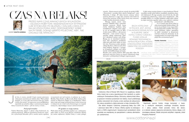 Il e t n i e m u st h av e Czas na relaks! ekspert Violetta hamerska Przed nami czas wakacyjnych wyjazdów – długich pobytów, weekendowych wypadów lub wycieczek po bliższej i dalszej okolicy. Najwyższa pora więc odpowiedzieć sobie na pytanie: dokąd warto pojechać, aby... nie chciało się wracać? A jakie zmiany możemy dostrzec w menu hotelowym? Przede wyjazdu. „Zapracowanym polecam wyjazdy do górskich SPA i skorzystanie z szerokiej oferty odnowy biologicznej”, radzi wszystkim szeroki wybór bufetów szwedzkich, niezależnie od guHamerska. I dodaje: „W takim kurorcie możemy wybrać stów kulinarnych. Do tego specjalne menu fit lub eko, dla osób sportową aktywność w ciągu dnia, ponieważ wiele hoteli ma z nietolerancją pokarmową, a nawet menu bezglutenowe. „Dla świetną bazę sportową: boiska, baseny, korty, trasy rowerowe, porządku dodam, że o wszelkie dodatkowe usługi należy zapytać na etapie rezerwacji, uzgodnić zakres, cenę i poprosić o pisemne a także bardziej ekstremalne atrakcje. Planując wyjazd, zawsze warto potwierdzenie”, radzi Hamerska. przejrzeć dokładnie oferty i sprawdzić A co w sytuacji, gdy chcemy zabrać ze aktualne promocje. Hotele kuszą sobą czworonożnego członka rodziny? „To Baza hotelowa choćby dodatkową bezpłatną dobą, już też nie jest kłopot. Coraz więcej obiekw polsce jest jedną nieodpłatnymi usługami spoza pakietów akceptuje pobyt z pupilem. Ale uwaga: tu czy też specjalną ofertą do SPA. z najnowocześniejszych przed wybraniem miejsca sprawdźmy, A skoro mowa o SPA, to – jak zauważa na jakich warunkach są akceptowane w europie. Obok Hamerska – warto zwrócić uwagę na zwierzęta i koniecznie dostosujmy się do hoteli coraz częściej specjalne zabiegi wykonywane zgodwymagań hotelu, bo to hotel ustala zasady nie z aktualnym nurtem, czyli ekospa. pobytu dla czworonożnych gości”. funkcjonuje Bazują one na naturalnych kosmetyrównież rozwinięta Violetta Hamerska – ekspert w jakości kach i/lub naturalnych produktach, takich jak miód, kozie mleko czy piwo infrastruktura, która usług hotelowych. Od ponad 25 lat zwiąlub wino. Nowością są także specjalne uniezależnia większość zana z branżą hotelową i turystyczną, zabiegi dla dzieci, zwłaszcza tych, które obiektów od kaprysów a od 8 lat profesjonalnie audytuje i ocenia hotele w Polsce. Przewodnicząca kapituły mają problemy alergiczne i wymagapogody. Hotel Przyjazny Rodzinie i pomysłodawją szczególnych zabiegów pod okiem czyni ogólnopolskiej kampanii HPR, która wysoko wykwalifikowanego personelu. Ponadto coraz częściej hotelowe SPA mają także ofertę dla certyfikuje hotele spełniające określone kryteria wypoczynku aktywnych mężczyzn, którzy po różnych szaleństwach mogą i wyposażenia dla rodzin z dziećmi. Najbardziej tajemniczy gość hotelowy w Polsce. skorzystać z profesjonalnych zabiegów regeneracyjnych. REKLAMA J ak lato, to morze, prawda? Często naszym pierwszym wakacyjnym azymutem jest właśnie plaża. Warto jednak pamiętać, że w tym roku nad morzem może być trudno o ofertę „last minute”, bo tegoroczny sezon nad Bałtykiem zapowiada się na bardzo udany i z pewnością przyciągnie tłumy wczasowiczów. Zatem – jeśli nie morze, to może... Pod prąd trendów wczasowiczów jest nad morzem, to jedziemy np. w góry: Beskidy, Tatry, Sudety czy Bieszczady. Wiele atrakcji czeka również na Mazowszu, Śląsku czy w Wielkopolsce. Warto także wziąć pod uwagę zwiedzanie dużych miast (zazwyczaj w wakacje nie ma w nich ruchu biznesowego) czy wyjazdy tematyczne, odpowiadające naszym zainteresowaniom”. W zgodzie ze swoją naturą Violetta Hamerska, ekspert w jakości usług hotelowych, ma ciekawą propozycję: „Polecam sprawdzoną metodę tzw. wyjazdu w przeciwnym kierunku: jeśli w sezonie zawsze najwięcej 116 Wiele zależy od tego, jak lubimy spędzać czas – preferujemy pełen relaks czy może raczej aktywne zwiedzanie? Dzisiaj już można zaplanować obydwie formy w czasie jednego Cottonina Villa & Mineral SPA Resort to wyjątkowy obiekt, który mieści się w sercu zjawiskowych Gór Izerskich, w uzdrowiskowym Świeradowie-Zdroju. Otoczony zielenią hotel oferuje gościom mnóstwo przestrzeni do relaksu. Szum pobliskiego potoku wieczorem koi zmysły, a rano zachęca do aktywności. Do natury przybliża tu także pierwsze w kraju mineralne SPA. Dla dzieci eksperci Cottoniny proponują Baby Eco SPA – pierwsze takie SPA w Polsce. Ofertę oparto na ekologicznych, w 100% organicznych i bezpiecznych produktach, które powstały we współpracy ze specjalistami z zakresu dermatologii i położnictwa. Najmłodsi goście hotelu mogą korzystać z basenu z wodnymi atrakcjami, wodnego brodzika, bawialni i placu zabaw. Hotel posiada menu dla dzieci, a w okresie wakacji zapewnia animatorów, którzy dbają o ich rozwijającą zabawę. Obiekt otrzymał certyfikat i nagrodę „Hotel Przyjazny Rodzinie”. www.cottonina.pl