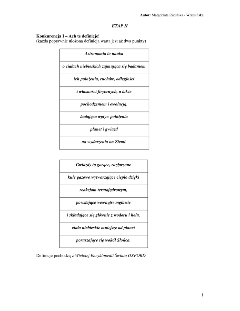 Autor: Małgorzata Rucińska - Wrzesińska ETAP II Konkurencja I – Ach te definicje! (każda poprawnie ułożona definicja warta jest aż dwa punkty) Astronomia to nauka o ciałach niebieskich zajmująca się badaniem ich położenia, ruchów, odległości i własności fizycznych, a także pochodzeniem i ewolucją. badająca wpływ położenia planet i gwiazd na wydarzenia na Ziemi. Gwiazdy to gorące, rozżarzone kule gazowe wytwarzające ciepło dzięki reakcjom termojądrowym, powstające wewnątrz mgławic i składające się głównie z wodoru i helu. ciała niebieskie mniejsze od planet poruszające się wokół Słońca. Definicje pochodzą z Wielkiej Encyklopedii Świata OXFORD 1 Autor: Małgorzata Rucińska - Wrzesińska Konkurencja II – Domino astronomiczne z planetami i nie tylko (prawidłowo ułożone pozwoli dopisać drużynie aż cztery punkty) START Planeta o największej gęstości ZIEMIA MERKURY MARS Planeta o czerwonym zabarwieniu dzięki zawartości związków żelaza w skorupie Największa planeta Układu Słonecznego Planeta okrążona przez układ szerokich pierścieni SATURN URAN WENUS Ósma według oddalenia od Słońca planeta Układu Słonecznego Wokół niego krążą planety NEPTUN SŁOŃCE Planeta położona najbliżej Słońca JOWISZ Planeta o najmniejszej gęstości Planetę tą często nazywa się Gwiazdą Poranną lub Wieczorną META Konkurencja III – Do boju ruszają eksperci (w tej konkurencji można zdobyć aż dziesięć punktów + po dwa punkty za każdą prawidłową odpowiedź) Zadaniem uczniów każdej klasy jest przygotowanie prezentacji multimedialnej na jeden z poniższych tematów: 1) 2) 3) 4) 5) 6) 7) 8) Gwiazdy – od „poczęcia” do „wygaśnięcia”. Merkury, Wenus, Ziemia, Mars – planety ziemskie. Jowisz, Saturn, Uran, Neptun – gazowe olbrzymy. Księżyce planet Układu Słonecznego. Galaktyki – ich różnorodność. Zaćmienia Słońca i Księżyca. Podboje Kosmosu – najważniejsze wydarzenia. Obserwacje astronomiczne dawniej. Uczniowie losują temat (tematy nie mogą się powtarzać) na dwa tygodnie przed ustalonym terminem turnieju i w tym czasie pracują pod kierunkiem nauczyciela, szukają materiałów i przygotowują prezentację, którą przedstawiają na zawodach. W ten sposób wszyscy stają się ekspertami w swojej dziedzinie. Poza tym zadaniem uczniów jest przygotowanie dwóch pytań, na które będą odpowiadać pozostałe drużyny (drużyny nie odpowiadają na pytania dotyczące prezentacji swojej klasy). 2 Autor: Małgorzata Rucińska - Wrzesińska Konkurencja IV – Kram z zadaniami – zadania nietrudne i niełatwe (każde poprawnie rozwiązane warte jest aż trzy punkty) Zadanie 1. Oblicz wartość siły ciężkości działającej na ciało o masie 40 kg umieszczone na powierzchni Księżyca. Średnia wartość przyspieszenia grawitacyjnego na Księżycu wynosi 1,62 m/s2. Zadanie 2. Sztuczny satelita okrąża Ziemię 8 razy w ciągu 12 godzin. Oblicz, ile czasu potrzebuje na wykonanie jednego obiegu wokół Ziemi. Jak się nazywa wielkość, którą obliczyłeś? Zadanie 3. Średnia odległość Ziemi od Słońca wynosi 149,6 mln km. Oblicz, ile czasu potrzebuje światło słoneczne, aby dotrzeć do naszej planety? Prędkość światła wynosi 300000 km/s. Zadanie 4. Na której planecie: Marsie, czy Ziemi ciężar ciała jest mniejszy? Ile razy? Potrzebne dane znajdziesz w „Tablicach fizycznych i astronomicznych”. Zadanie 5. Wiedząc, że światło odbite od powierzchni Księżyca potrzebuje 1,28 s, aby dotrzeć do Ziemi, oblicz średnią odległość Księżyca od naszej planety. Prędkość światła wynosi 300000 km/s. Zadanie 6. Oblicz wartość siły ciężkości działającej na ciało o masie 20 kg umieszczone na powierzchni Marsa. Średnia wartość przyspieszenia grawitacyjnego na Marsie wynosi 3,69 m/s2. Zadanie 7. Oblicz, na jakiej wysokości nad Ziemią siła grawitacji będzie dziewięciokrotnie mniejsza, niż na powierzchni Ziemi. Przyjmij, że średnica równikowa Ziemi wynosi 12 760 km. Zadanie 8. Gdyby ciało o masie 25 kg zostało umieszczone na powierzchni Neptuna, to jego ciężar wyniósłby 275 N. Oblicz wartość przyspieszenia na tej planecie. Zadanie 9. Okres obiegu Merkurego wokół Słońca wynosi 88 dni. Przyjmując, że Merkury obiega Słońce po torze w kształcie okręgu oblicz, z jaką prędkością się porusza. Potrzebne dane znajdziesz w „Tablicach fizycznych i astronomicznych”. Zadanie 10. Gwiazda o nazwie Proxima Centauri jest gwiazdą najbliższą naszego Układu Słonecznego. Jej odległość od Słońca wynosi 4,28 roku świetlnego. Wyraź tę odległość w kilometrach. 3 Autor: Małgorzata Rucińska - Wrzesińska Konkurencja V – Runda pytań do wyboru, po dwa i trzy punkty. Ddecyduj, które wybrać Pytania po dwa punkty 1. Wymień wszystkie planety Układu Słonecznego w kolejności od najbliżej położonej do najbardziej oddalonej od Słońca. 2. Podaj podział planet Układu Słonecznego ze względu na budowę i wymień planety należące do poszczególnych grup. 3. Jak się nazywa siła utrzymująca sztucznego satelitę na orbicie okołoziemskiej? 4. Co to są komety? 5. Jak się nazywa wielkość do pomiaru odległości we Wszechświecie? 6. Ile wynosi okres obiegu Ziemi wokół Słońca? 7. Na czym polega zaćmienie Słońca? 8. Jakie są następstwa ruchu wirowego Ziemi? 9. Jak się nazywał człowiek, który pierwszy stanął na Księżycu? 10. Co to jest siła grawitacji i jak można obliczyć jej wartość? 11. Wymień fazy Księżyca. 12. Z czym kojarzą się Tobie nazwy planet Układu Słonecznego? Jak sądzisz, dlaczego? Pytania po trzy punkty 1. 2. 3. Czy meteoroidy i meteoryty to pojęcia o takim samym znaczeniu? Do czego służą sztuczne satelity Ziemi? Podaj co najmniej pięć przykładów. Jaką nazwę nosił pierwszy sztuczny satelita Ziemi i w którym roku został umieszczony na orbicie okołoziemskiej? 4. Jaki jest kierunek i zw