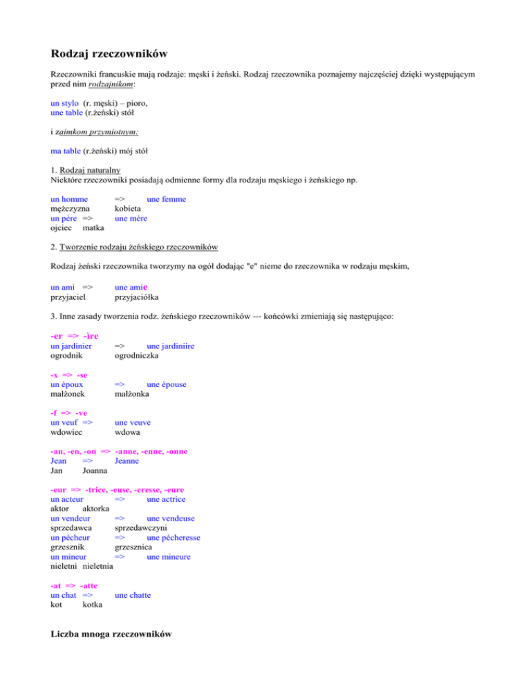 Rzeczowniki francuskie mają rodzaje: męski i żeński. Rodzaj rzeczownika poznajemy najczęściej dzięki występującym