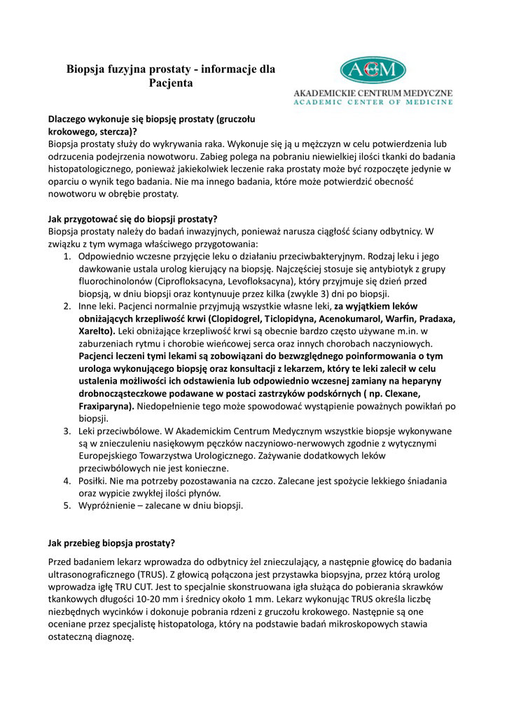 Biopsja fuzyjna prostaty - informacje dla Pacjenta Dlaczego wykonuje się biopsję prostaty (gruczołu krokowego, stercza)? Biopsja prostaty służy do wykrywania raka. Wykonuje się ją u mężczyzn w celu potwierdzenia lub odrzucenia podejrzenia nowotworu. Zabieg polega na pobraniu niewielkiej ilości tkanki do badania histopatologicznego, ponieważ jakiekolwiek leczenie raka prostaty może być rozpoczęte jedynie w oparciu o wynik tego badania. Nie ma innego badania, które może potwierdzić obecność nowotworu w obrębie prostaty. Jak przygotować się do biopsji prostaty? Biopsja prostaty należy do badań inwazyjnych, ponieważ narusza ciągłość ściany odbytnicy. W związku z tym wymaga właściwego przygotowania: 1. Odpowiednio wczesne przyjęcie leku o działaniu przeciwbakteryjnym. Rodzaj leku i jego dawkowanie ustala urolog kierujący na biopsję. Najczęściej stosuje się antybiotyk z grupy fluorochinolonów (Ciprofloksacyna, Levofloksacyna), który przyjmuje się dzień przed biopsją, w dniu biopsji oraz kontynuuje przez kilka (zwykle 3) dni po biopsji. 2. Inne leki. Pacjenci normalnie przyjmują wszystkie własne leki, za wyjątkiem leków obniżających krzepliwość krwi (Clopidogrel, Ticlopidyna, Acenokumarol, Warfin, Pradaxa, Xarelto). Leki obniżające krzepliwość krwi są obecnie bardzo często używane m.in. w zaburzeniach rytmu i chorobie wieńcowej serca oraz innych chorobach naczyniowych. Pacjenci leczeni tymi lekami są zobowiązani do bezwzględnego poinformowania o tym urologa wykonującego biopsję oraz konsultacji z lekarzem, który te leki zalecił w celu ustalenia możliwości ich odstawienia lub odpowiednio wczesnej zamiany na heparyny drobnocząsteczkowe podawane w postaci zastrzyków podskórnych ( np. Clexane, Fraxiparyna). Niedopełnienie tego może spowodować wystąpienie poważnych powikłań po biopsji. 3. Leki przeciwbólowe. W Akademickim Centrum Medycznym wszystkie biopsje wykonywane są w znieczuleniu nasiękowym pęczków naczyniowo-nerwowych zgodnie z wytycznymi Europejskiego Towarzystwa Urologicznego. Zażywanie dodatkowych leków przeciwbólowych nie jest konieczne. 4. Posiłki. Nie ma potrzeby pozostawania na czczo. Zalecane jest spożycie lekkiego śniadania oraz wypicie zwykłej ilości płynów. 5. Wypróżnienie – zalecane w dniu biopsji. Jak przebieg biopsja prostaty? Przed badaniem lekarz wprowadza do odbytnicy żel znieczulający, a następnie głowicę do badania ultrasonograficznego (TRUS). Z głowicą połączona jest przystawka biopsyjna, przez którą urolog wprowadza igłę TRU CUT. Jest to specjalnie skonstruowana igła służąca do pobierania skrawków tkankowych długości 10-20 mm i średnicy około 1 mm. Lekarz wykonując TRUS określa liczbę niezbędnych wycinków i dokonuje pobrania rdzeni z gruczołu krokowego. Następnie są one oceniane przez specjalistę histopatologa, który na podstawie badań mikroskopowych stawia ostateczną diagnozę. Czym różni się biopsja fuzyjna od klasycznej biopsji prostaty? Klasyczna biopsja raka prostaty wiąże się z wieloma ograniczeniami. Głównym z nich jest trudność w uwidocznieniu ognisk złośliwych w ultrasonografii przezodbytniczej. Około 70% ognisk nowotworowych jest niewidocznych w usg. Klasyczna biopsja prostaty pozostaje więc w większości przypadków tzw. biopsją systematyczną (mappingową) czyli „ślepym” poszukiwaniem ognisk rozrostu złośliwego poprzez pobieranie wycinków (zwykle 10-12) z różnych miejsc gruczołu. Wiarygodność tak wykonanej biopsji pozostaje wątpliwa. Ocenia się, że pierwotna biopsja pomija około 21-47% raków prostaty. Rozwiązaniem tego problemu jest możliwość zastąpienia biopsji systematycznej biopsją celowaną, poprzez wcześniejszą identyfikację raka badaniem rezonansu magnetycznego, który dokładnie określa położenie nowotworu w obrębie prostaty. Technika umożliwiająca nałożenie obrazów rezonansu magnetycznego na badanie usg w czasie rzeczywistym nosi nazwę fuzji obrazów. Najnowsze systemy wykorzystujące tzw. fuzję elastyczną, osiągają bardzo wysoką dokładność nałożenia obrazów z odchyleniem nieprzekraczającym 1 mm. Sam przebieg procedury jest z punktu widzenia pacjenta bardzo zbliżony do biopsji klasycznej. Pozwala jednak na nieporównywalnie precyzyjniejsze pobranie materiału z obszarów podejrzanych o raka, jednocześnie redukując liczbę „ślepych” wycinków. W 2015 r. Europejskie Towarzystwo Urologiczne zmieniło wytyczne dotyczące sposobu przeprowadzenia biopsji prostaty. Rekomenduje się, aby każda powtórna biopsja gruczołu krokowego przeprowadzana była w oparciu o badanie rezonansu magnetycznego i stwierdzone w nim nieprawidłowości. Wraz z rozwojem metody i poprawą uwarunkowań ekonomicznych należy się spodziewać, że również biopsje pierwszorazowe będą wykonywane w ten sposób. Bezpieczeństwo i postępowanie po zabiegu Biopsja prostaty jest zabiegiem stosunkowo bezpiecznym, jednak niekiedy mogą wystąpić po niej powikłania. Przez kilka dni po zabiegu może Pan zauważyć niewielkie, samoistnie ograniczające się krwawienia, które mogą mieć charakter: obecności krwi w nasieniu (czerwone lub rdzawe zabarwienie), w moczu lub w stolcu. W zdecydowanej większości nie wymagają one interwencji medycznej. W przypadku masywnego, nieustępującego krwawienia z dróg moczowych lub odbytnicy należy się zgłosić bez skierowania do najbliższego Szpitala. U mniej niż 5% pacjentów może dojść do infekcji układu moczowo-płciowego mimo stosowania profilaktyki przeciwbakteryjnej. Jeśli temperatura ciała przekracza 38 ºC i/lub pojawiają się dreszcze należy się zgłosić do najbliższego Szpitala. U około 0,2% pacjentów może dojść do przejściowego zatrzymania moczu spowodowanego obrzękiem tkanek stercza po biopsji. W przypadku niemożności oddania moczu należy się zgłosić na ostry dyżur urologiczny. W czasie biopsji jest Pan po