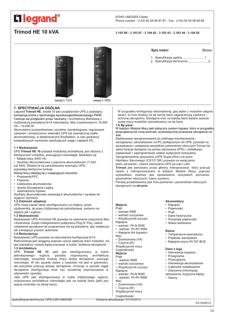 87045 LIMOGES Cedex Phone number : (+33) 05 55 06 87 87 - Fax : (+33) 05 55 06 88 88 Trimod HE 10 kVA 3 103 96 - 3 103 97 - 3 104 42 - 3 103 43 - 3 103 44 - 3 104 02 Spis treści Strona 1. Specyfikacja ogólna...........................1 2. Specyfikacja techniczna.........................2 wersja h 1370 wersja h 1650 1. SPECYFIKACJA OGÓLNA Legrand Trimod HE, model 10 jest urządzeniem UPS z podwójną konwersją online z technologią wysokoczęstotliwościowego PWM. Cechuje się przejściem przez neutralny i Architekturą Modułową z możliwością posiadania N+X redundancji. Moc znamionowa to 10.000 VA – 10.000 W. Akumulatory są bezołowiowe, szczelne, bezobsługowe, regulowane zaworem i umieszczone, wewnątrz UPS lub zewnętrznej szafie akumulatorowej, w dedykowanych Szufladach, w celu gwarancji kompaktowych wymiarów redukujących wagę i napięcie DC. 1.1 Modułowość UPS Trimod HE 10 posiada modułową architekturę, jest złożony z identycznych modułów, pracujących równolegle. Modułami są: • Moduły mocy 3400 VA; • Szuflady Akumulatorowe z pięcioma akumulatorami (7.2Ah lub 9Ah). Moduły te są zainstalowane wewnątrz UPS i posiadają identyczne funkcje. Moduły Mocy składają się z następujących obwodów: • Prostownik/PFC • Falownik • Ładowarka akumulatorów • obwód Zarządzania Logiką • automatyczny bypass Szuflady akumulatorowe zawierają 5 akumulatorów i są łatwe do wyjęcia i wymiany. 1.2 Zdolność adaptacji UPS może zostać łatwo skonfigurowany na miejscu, przez użytkownika, do pracy trójfazowej lub jednofazowej, zarówno na wejściu jak i wyjściu. 1.3 Skalowalność Modułowość UPS Archimod HE pozwala na wykonanie ulepszenia Moc i Autonomia. Dzięki inteligentnemu połączeniu Plug N’ Play, żadne ustawienia sprzętowe lub programowe nie są potrzebne, aby zwiększyć lub zmniejszyć poziom autonomii. 1.4 Redundancja Modułowość UPS pozwala na redundantne konfiguracje N+X. Redundancja jest osiągana poprzez użycie większej ilości modułów, niż jest potrzebna, moduły będą pracować w trybie “dzielenia obciążenia”. 1.5 Architektura UPS Trimod HE 10, jeśli jest skonfigurowany w trybie jednofazowego wyjścia, posiada rozproszoną architekturę równoległą, wszystkie moduły mocy dzielą obciążenie, pracując równolegle. W ten sposób żaden z modułów nie jest w gotowości, ale wszystkie pracują dzieląc obciążenie, chroniąc w sposób ciągły obciążenie (konfiguracja musi być wcześniej zwymiarowana w odpowiedni sposób). Jeśli UPS jest skonfigurowany w trybie trójfazowego wyjścia, rozproszona architektura równoległa jest na każdej fazie (jeśli jest więcej modułów na danej fazie). Specyfikacja techniczna: UPS-LGR-0062/GB W przypadku konfiguracji redundantnej, gdy jeden z modułów ulegnie awarii, to inne moduły na tej samej fazie zagwarantują z asilanie i ochronę obciążeniu. Dostępna moc na każdej fazie będzie zawsze sumą mocy modułów zainstalowany na tej fazie. 1.6 By-pass W każdym Module Mocy jest statyczny system bypass, który w przypadku przeciążenia lub innej anomalii, automatycznie przeniesie obciążenie na sieć. Dedykowane oprogramowanie do zdalnego monitorowania i zarządzania, zainstalowane na PC podłączonym do UPS, pozwala na sprawdzenie i ustawienie wszystkich parametrów roboczych Trimod (te same funkcje dostępne na panelu sterowania UPS) i, dodatkowo, zaplanować i zaprogramować zdalne wyłączenie komputera. Oprogramowanie opcjonalne (UPS SuperviSor) lub karta Interfejsu Sieciowego (CS121 SK) pozwala na wyłączenie wielu serwerów i zdalne sterowanie UPS po sieci LAN. Trimod jest sterowany przez główny mikroprocesor, który pracuje razem z mikroprocesorami w każdym Module Mocy; poprzez wyświetlacz możliwe jest sprawdzenie wszystkich pomiarów, parametrów roboczych i stanu systemu. Poniżej przedstawiona jest lista pomiarów i parametrów roboczych dostępnych na ekranie: Wejście Prąd: • wartość RMS • wartość szczytowa • Współczynnik szczytu Napięcie: • wartość Ph-N RMS • wartość Ph-Ph RMS • Napięcie linii bypassu Moc: • Znamionowa (VA) • Czynna (W) Współczynnik mocy Częstotliwość Wyjście Prąd: • wartość RMS • wartość szczytowa • Współczynnik szczytu Napięcie: • wartość Ph-N RMS • wartość Ph-Ph RMS Moc: • Znamionowa (VA) • Czynna (W) Współczynnik mocy Akumulatory • Napięcie • Pojemność • Prąd • Dane historyczne • Pozostała pojemność • Status ładowania Różne • Temperatura wewnętrzna • Prędkość wentylatora • Napięcie szyny HV DC BUS Dane z logu • Interwencje bypassu • Przegrzania • Przeciążenia • Interwencje akumulatorów • Całkowite rozładowanie • Zdarzenia (informacje, ostrzeżenia, krytyczne błędy) • Alarmy Częstotliwość Ostatnia aktualizacja: 01/10/2013 01/10/2013 1/2 Trimod HE 10 kVA 3 103 96 - 3 103 97 - 3 104 42 - 3 103 43 - 3 103 44 - 3 104 02 1. SPECYFIKACJA OGÓLNA (kontynuacja) Wyjście podczas pracy na akumulatorach (DC-AC) UPS pozwala również na poniższe ustawienia przez wyświetlacz: Wyjście • Napięcie • Częstotliwość • Konfiguracja faz BYPASS • Włączanie • Wymuszanie • prędkość DIP • tryb ECO Wejście • Włączanie synchronizacji częstotliwości (PLL) • Rozszerzony zakres synchronizacji (Rozszerzony PLL) Akumulatory • Rozruch na Akumulatorach • Wartość progu • Automatyczny restart • Maksymalny czas na akumulat The UPS Trimod HE 10 posiada oznaczenie CE zgodnie z Dyrektywami UE 73/23, 93/68, 89/336, 92/31, 93/68 i spełnia następujące normy: • EN 62040-1 “Ogólne zasady bezpieczeństwa elektrycznego” • EN 62040-2 “Kompatybilność elektromagnetyczna i odporność (EMC)” • EN 62040-3 “Osiągi i zasady badań ” Napięcie znamionowe 400 V trójfazowe Moc znamionowa 10.000 VA Moc czynna 10.000 W Zmienność napięcia (statyczna) ± 1% Zmienność napięcia (dynamicz