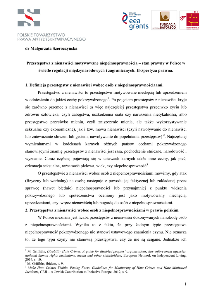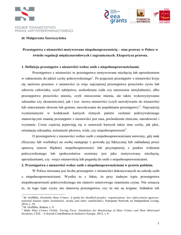 dr Małgorzata Szeroczyńska Przestępstwa z nienawiści motywowane niepełnosprawnością – stan prawny w Polsce w świetle regulacji międzynarodowych i zagranicznych. Ekspertyza prawna. 1. Definicja przestępstw z nienawiści wobec osób z niepełnosprawnościaami. Przestępstwo z nienawiści to przestępstwo motywowane niechęcią lub uprzedzeniem w odniesieniu do jakieś cechy pokrzywdzonego1. Po pojęciem przestępstw z nienawiści kryje się zarówno przemoc z nienawiści (a więc najczęściej przestępstwa przeciwko życiu lub zdrowiu człowieka, czyli zabójstwa, uszkodzenia ciała czy naruszenia nietykalności, albo przestępstwo przeciwko mieniu, czyli zniszczenie mienia, ale także wykorzystywanie seksualne czy ekonomiczne), jak i tzw. mowa nienawiści (czyli nawoływanie do nienawiści lub znieważanie słowem lub gestem, nawoływanie do popełniania przestępstw) 2. Najczęściej wymienianymi w kodeksach karnych różnych państw cechami pokrzywdzonego stanowiącymi znamię przestępstw z nienawiści jest rasa, pochodzenie etniczne, narodowość i wyznanie. Coraz częściej pojawiają się w ustawach karnych także inne cechy, jak płeć, orientacja seksualna, tożsamość płciowa, wiek, czy niepełnosprawność3. O przestępstwie z nienawiści wobec osób z niepełnosprawnościami mówimy, gdy atak (fizyczny lub werbalny) na osobę następuje z powodu jej faktycznej lub zakładanej przez sprawcę (nawet błędnie) niepełnosprawności lub przynajmniej z punktu widzenia pokrzywdzonego lub społeczeństwa oceniony jest jako motywowany niechęcią, uprzedzeniami, czy wręcz nienawiścią lub pogardą do osób z niepełnosprawnościami. 2. Przestępstwa z nienawiści wobec osób z niepełnosprawnościami w prawie polskim. W Polsce nieznana jest liczba przestępstw z nienawiści dokonywanych na szkodę osób z niepełnosprawnościami. Wynika to z faktu, że przy żadnym typie przestępstwa niepełnosprawność pokrzywdzonego nie stanowi ustawowego znamienia czynu. Nie oznacza to, że tego typu czyny nie stanowią przestępstwa, czy że nie są ścigane. Jednakże ich 1 M. Griffiths, Disability Hate Crimes. A guide for disabled peoples’ organisations, law enforcement agencies, national human rights institutions, media and other stakeholders, European Network on Independent Living, 2014, s. 10. 2 M. Griffiths, ibidem, s. 9. 3 Make Hate Crimes Visible. Facing Facts. Guidelines for Monitoring of Hate Crimes and Hate Motivated Incidents, CEJI – A Jewish Contribution to Inclusive Europe, 2012, s. 9. 1 karalność podlega kwalifikacji na zasadach ogólnych, mając na uwadze rodzaj popełnionego czynu, ewentualnie jego skutek (od art. 148 k.k.4 przy zabójstwie do art. 217 § 1 k.k. przy naruszeniu nietykalności), a nie motywację sprawcy, a więc nie są uznawane w polskim prawie karnym za przestępstwa z nienawiści. Co więcej, sądy i prokuratury, pomimo iż są do tego zobowiązane orzecznictwem Europejskiego Trybunału Praw Człowieka5, nie wymieniają w swoich decyzjach pobudek ksenofobicznych sprawcy przy orzekaniu odnośnie do czynu, który takiego znamienia nie zawiera (np. przy zabójstwie, gwałcie, zniszczeniu mienia itp.), a często wręcz nie prowadzą żadnych działań dowodowych w kierunku ustalenia, czy w danym przypadku zaistniało przestępstwo z nienawiści w znaczeniu kryminologicznym. Polski Kodeks karny przewiduje kilka przestępstw z nienawiści i to zarówno odnoszących się do przemocy z nienawiści (art. 119 § 1 k.k., tj. stosowanie przemocy wobec grupy osób lub poszczególnej osoby z powodu jej przynależności narodowej, etnicznej, rasowej, politycznej, wyznaniowej lub z powodu jej bezwyznaniowości; art. 257 k.k., tj. naruszenie nietykalności cielesnej z powodu przynależności pokrzywdzonego do danej grupy narodowej, etnicznej, rasowej, wyznaniowej albo z powodu jego bezwyznaniowości), jak i dotyczących mowy nienawiści (art. 119 § 1 k.k., tj. groźby wobec grupy osób lub poszczególnej osoby z powodu jej przynależności narodowej, etnicznej, rasowej, politycznej, wyznaniowej lub z powodu jej bezwyznaniowości; art. 257 k.k., tj. zniewaga z powodu przynależności narodowej, etnicznej, rasowej, wyznaniowej albo z powodu bezwyznaniowości; oraz art. 256 § 1 k.k., tj. nawoływanie do nienawiści z powyższych powodów), w przypadku których motyw sprawcy stanowi znamię przestępstwa, a więc musi być udowodniony. Jednakże, jak wprost wynika ze sformułowania tych przepisów, dotyczy to tylko motywacji skierowanej przeciwko grupie narodowej, etnicznej, wyznaniowej bądź bezwyznaniowej, a w odniesieniu do art. 119 § 1 k.k. także politycznej. Poza zainteresowaniem organów ścigania, a tym samym i poza danymi statystycznymi, pozostaje motywacja przestępstw z nienawiści popełnianych z innych pobudek ksenofobicznych niż wymienionych w obu powyższych przepisach (a więc ze względu na homofobię, transfobię, niepełnosprawność, nienawiść do osób do osób starszych itp.). 4 Kodeks karny z 6 czerwca 1997 r., Dz. U. nr 88 poz. 553 z późn. zm. Por. wyrok w sprawie Šečić v. Chorwacja z 31 maja 2007 r., nr 40116/02; wyrok w sprawie Abdu v. Bułgaria z 11 marca 2014 r., nr 26827/08. 5 2 Wiedzę o zaistniałych przestępstwach z nienawiści popełnionych wobec osób z niepełnosprawnościami można więc czerpać jedynie z pojedynczych historii medialnych lub od organizacji pozarządowych, do których zgłaszają się osoby pokrzywdzone. Z ostatnio przeprowadzonych badań wynika zresztą, że większość zdarzeń w ogóle nie jest zgłaszana, z jednej strony dlatego, że pokrzywdzeni nie mają zaufania do organów ścigania i wymiaru sprawiedliwości, z drugiej – jako że nie zawsze wiedzą, iż dane zachowania lub słowa są zabronione i podlegają karze6, niemówiąc już o umiejętności dokonania takiego formalnego zgłoszenia, czy często nawet opisania samego zdarzenia (np. w przypadku osób ze znaczną albo głęboką 