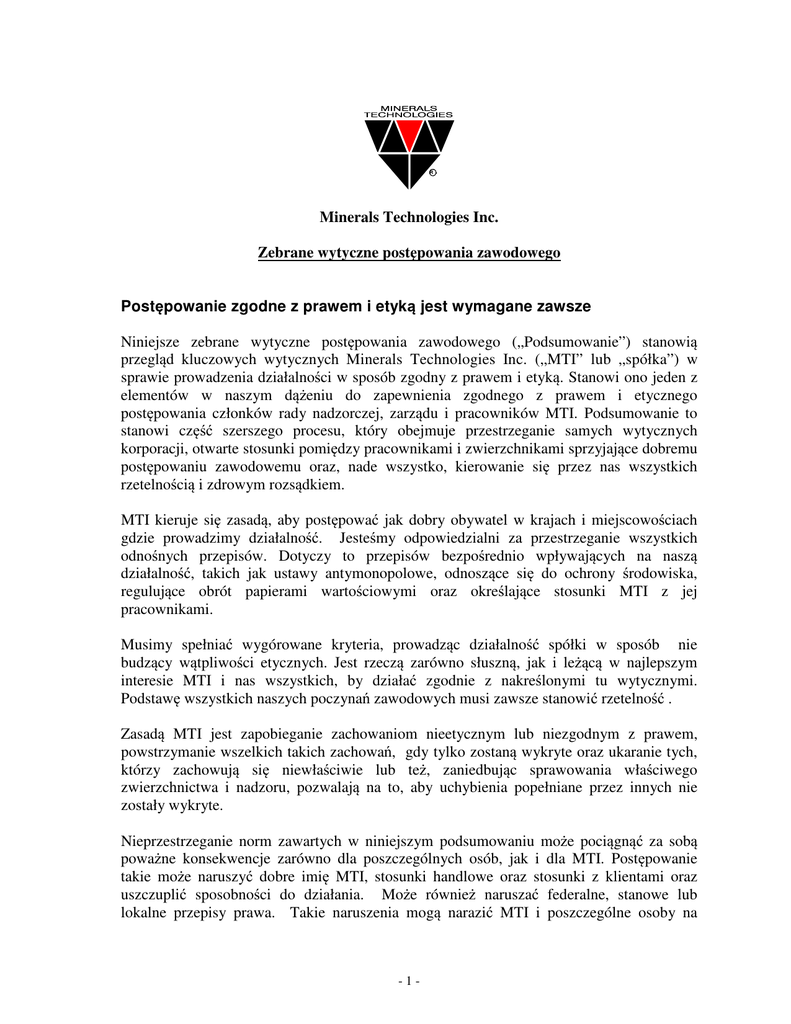 Minerals Technologies Inc. Zebrane wytyczne postępowania zawodowego Postępowanie zgodne z prawem i etyką jest wymagane zawsze Niniejsze zebrane wytyczne postępowania zawodowego („Podsumowanie”) stanowią przegląd kluczowych wytycznych Minerals Technologies Inc. („MTI” lub „spółka”) w sprawie prowadzenia działalności w sposób zgodny z prawem i etyką. Stanowi ono jeden z elementów w naszym dążeniu do zapewnienia zgodnego z prawem i etycznego postępowania członków rady nadzorczej, zarządu i pracowników MTI. Podsumowanie to stanowi część szerszego procesu, który obejmuje przestrzeganie samych wytycznych korporacji, otwarte stosunki pomiędzy pracownikami i zwierzchnikami sprzyjające dobremu postępowaniu zawodowemu oraz, nade wszystko, kierowanie się przez nas wszystkich rzetelnością i zdrowym rozsądkiem. MTI kieruje się zasadą, aby postępować jak dobry obywatel w krajach i miejscowościach gdzie prowadzimy działalność. Jesteśmy odpowiedzialni za przestrzeganie wszystkich odnośnych przepisów. Dotyczy to przepisów bezpośrednio wpływających na naszą działalność, takich jak ustawy antymonopolowe, odnoszące się do ochrony środowiska, regulujące obrót papierami wartościowymi oraz określające stosunki MTI z jej pracownikami. Musimy spełniać wygórowane kryteria, prowadząc działalność spółki w sposób nie budzący wątpliwości etycznych. Jest rzeczą zarówno słuszną, jak i leżącą w najlepszym interesie MTI i nas wszystkich, by działać zgodnie z nakreślonymi tu wytycznymi. Podstawę wszystkich naszych poczynań zawodowych musi zawsze stanowić rzetelność . Zasadą MTI jest zapobieganie zachowaniom nieetycznym lub niezgodnym z prawem, powstrzymanie wszelkich takich zachowań, gdy tylko zostaną wykryte oraz ukaranie tych, którzy zachowują się niewłaściwie lub też, zaniedbując sprawowania właściwego zwierzchnictwa i nadzoru, pozwalają na to, aby uchybienia popełniane przez innych nie zostały wykryte. Nieprzestrzeganie norm zawartych w niniejszym podsumowaniu może pociągnąć za sobą poważne konsekwencje zarówno dla poszczególnych osób, jak i dla MTI. Postępowanie takie może naruszyć dobre imię MTI, stosunki handlowe oraz stosunki z klientami oraz uszczuplić sposobności do działania. Może również naruszać federalne, stanowe lub lokalne przepisy prawa. Takie naruszenia mogą narazić MTI i poszczególne osoby na -1- ściganie sądowe, grzywny, a w przypadku przestępstw popełnianych przez osoby fizyczne, utratę wolności. Pracownik, który narusza którąś z niniejszych wytycznych podlega postępowaniu dyscyplinarnemu, aż do wymówienia stosunku pracy włącznie. Radca prawny MTI został mianowany dyrektorem do spraw praworządności. Dyrektor do spraw praworządności będzie ostatecznie odpowiedzialny za monitorowanie przestrzegania wszelkich odnośnych przepisów prawnych, administracyjnych i regulaminów niniejszego podsumowania oraz wszelkich związanych z tym wytycznych i procedur MTI oraz będzie odpowiadał za zgłaszanie wszelkich istotnych naruszeń do rady kierowniczej spółki oraz komisji audytu przy radzie nadzorczej. Zawsze ilekroć istnieje powód, aby przypuszczać, że doszło do naruszenia wszelkich odnośnych przepisów prawnych, administracyjnych i regulaminów niniejszego podsumowania lub związanych z tym wytycznych spółki, pracownik musi zgłosić tę informację niezwłocznie swojemu zwierzchnikowi lub dyrektorowi do spraw praworządności jak określono poniżej. Jeżeli ktoś uważa, że zwierzchnik, do którego zgłosił naruszenie lub możliwe naruszenie nie podjął właściwego działania, trzeba się zwrócić do dyrektora do spraw praworządności. Dochodzenie zostanie przeprowadzone przez lub pod kierunkiem dyrektora do spraw praworządności. Zabrania się stanowczo prowadzenia wstępnych dochodzeń osobom nie upoważnionym do tego przez dyrektora do spraw praworządności. Zgłoszenia dotyczące naruszeń lub przypuszczalnych naruszeń można składać osobiście lub na piśmie na adres: Minerals Technologies Inc., 622 Third Avenue, New York, New York 10017-6707, Attention: Corporate Compliance Officer. Zgłosznia można również składać anonimowo do Infolinii zaufania spółki prze telefon pod nr 212-878-1858. Zgłoszenia dotyczące naruszeń lub przypuszczalnych naruszeń można składać anonimowo do infolinii praworządności pod nr 1-877-209-3660 lub elektronicznie na stronie http://mineralstech.safe2say.info. Jest prowadzona przez zewnętrznego zleceniobiorcę dla Ponadto pracownicy mogą również składać zapewnienia anonimowości i poufności. poufnie i anonimowo obawy dotyczące wątpliwych praktyk księgowych i dotyczących kontroli księgowej do komisji audytu przy radzie nadzorczej lub do infolinii praworządności.Aby umożliwić stosowne dochodzenie, powinien zostać przedstawiony wystarczająco szczegółowy opis faktów, na których opierają się zarzuty . Spółka ściśle przestrzega zasady, że żaden członek rady nadzorczej, zarządu ani inny pracownik nie może podejmować żadnych czynności w odwecie przeciw osobie, która zgłosiła naruszenie odnośnych przepisów prawnych, administracyjnych i regulaminów, niniejszego podsumowania lub związanych z nim wytycznych lub procedur MTI. Personel kierowniczy i zarząd, w tym dyrektorzy MTI, dyrektor do spraw praworządności oraz przewodniczący i dyrektor naczelny prowadzą „politykę otwartych drzwi”, która umożliwia każdemu pracownikowi przedstawienie swoich obaw bezpośrednio i zadawanie pytań członkom zarządu MTI. -2- Wszyscy pracownicy działający na rzecz spółki muszą zrozumieć i przestrzegać wytycznych i procedur MTI. Pełne teksty tych zasad działalności korporacji są dostępne dla pracowników w bazach danych Lotus Notes spółki lub, na życzenie, z działu prawnego. Pracownicy mają obowiązek zapoznać się i zrozumieć te wytyczne i procedu