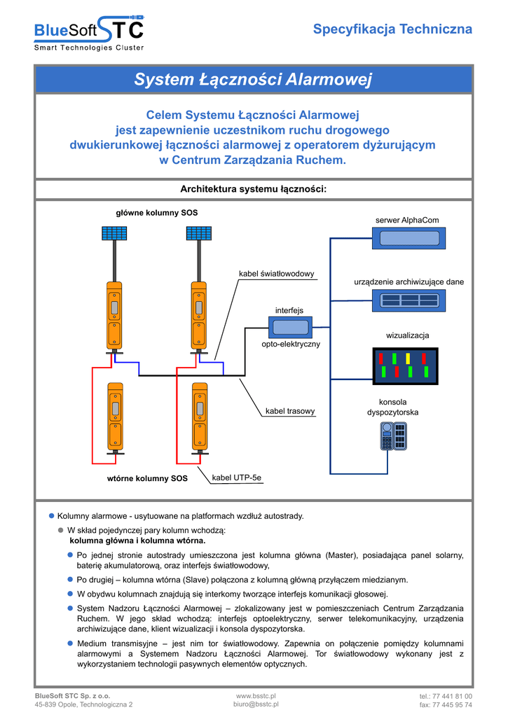 Specyfikacja Techniczna System Łączności Alarmowej Celem Systemu Łączności Alarmowej jest zapewnienie uczestnikom ruchu drogowego dwukierunkowej łączności alarmowej z operatorem dyżurującym w Centrum Zarządzania Ruchem. Architektura systemu łączności: główne kolumny SOS serwer AlphaCom kabel światłowodowy urządzenie archiwizujące dane interfejs opto-elektryczny kabel trasowy wtórne kolumny SOS wizualizacja konsola dyspozytorska kabel UTP-5e Kolumny alarmowe - usytuowane na platformach wzdłuż autostrady. W skład pojedynczej pary kolumn wchodzą: kolumna główna i kolumna wtórna. Po jednej stronie autostrady umieszczona jest kolumna główna (Master), posiadająca panel solarny, baterię akumulatorową, oraz interfejs światłowodowy, Po drugiej – kolumna wtórna (Slave) połączona z kolumną główną przyłączem miedzianym. W obydwu kolumnach znajdują się interkomy tworzące interfejs komunikacji głosowej. System Nadzoru Łączności Alarmowej – zlokalizowany jest w pomieszczeniach Centrum Zarządzania Ruchem. W jego skład wchodzą: interfejs optoelektryczny, serwer telekomunikacyjny, urządzenia archiwizujące dane, klient wizualizacji i konsola dyspozytorska. Medium transmisyjne – jest nim tor światłowodowy. Zapewnia on połączenie pomiędzy kolumnami alarmowymi a Systemem Nadzoru Łączności Alarmowej. Tor światłowodowy wykonany jest z wykorzystaniem technologii pasywnych elementów optycznych. BlueSoft STC Sp. z o.o. 45-839 Opole, Technologiczna 2 www.bsstc.pl [email protected] tel.: 77 441 81 00 fax: 77 445 95 74 Specyfikacja Techniczna System Łączności Alarmowej Celem Systemu Łączności Alarmowej jest zapewnienie uczestnikom ruchu drogowego dwukierunkowej łączności alarmowej z operatorem dyżurującym w Centrum Zarządzania Ruchem. Technologia zastosowana w systemie: System komunikacji głosowej oparto na urządzeniach interkomowych działających w technologii IP (Internet Protocol). Cechą wyróżniającą zaproponowany system interkomowy jest kompletna gama urządzeń wykonawczych zaprojektowanych w technologii IP, posiadających bezpośrednie przyłącze do sieci Ethernet - Stacje Interkomowe nie wymagają dodatkowych urządzeń pośredniczących adoptujących, takich jak bramki IP. Dzięki takiemu rozwiązaniu, drastycznie zmniejsza się liczba urządzeń w systemie, zwiększa się więc niezawodność całego systemu. Moduł komunikacji głosowej - interkom Instrukcja nawiązywania komunikacji głosowej w postaci piktogramu Przycisk do nawiązywania komunikacji głosowej wraz ze zintegrowaną lampką sygnalizacyjną Komunikacja pomiędzy kolumnami alarmowymi a Centrum Zarządzania ruchem jest wykonywana w technologii światłowodowej z wykorzystaniem pasywnych elementów optycznych, co zapewnia wysoką niezawodność systemowi telekomunikacyjnemu. Aktywna Redukcja Hałasu - jest zaimplementowana sprzętowo i jako algorytm programowy w zastosowanych stacjach interkomowych. Wydajny procesor DSP znajdujący się w stacji będzie mierzył sygnał mikrofonu i obliczał poziom hałasu w tym sygnale. Bardzo efektywnie usunie sygnał hałasu, pozostawiając czysta mowę, nawet gdy poziom sygnału mowy znajduje się znacznie poniżej poziomu otaczającego nas hałasu (redukcja nawet o 36dB). Funkcja ta jest bardzo przydatna na obiektach typu autostrady, parkingi, stadiony, dworce autobusowe i kolejowe, w których występuje duże natężenie hałasu, zapewniając dużo bardziej zrozumiałą rozmowę. System Nazdoru Łączności Alarmowej zlokalizowany jest w pomiedzczeniach Centrum Zarządzania Ruchem. W jego skład wchodzą interfejs optoelektryczny, serwer telekomunikacyjny, urządzenia archiwizujące dane, klient wizualizacji i konsola dyspozytorska. Medium transmisyjnym jest tor światłowodowy. Zapewnia on połączenie pomiędzy kolumnami alarmowymi, a Systemem Nadzoru Łączności Alarmowej. Sposób pracy dyspozytora Systemu Łączności Alarmowej: System wzywania pomocy ma zapewnić możliwość wezwania pomocy z każdej stacji na autostradzie. Takie obostrzenie wymaga zastosowanie systemu, w którym żadne z wezwań pomocy nie zostanie utracone. Dlatego też dyspozytor posiada następujące narzędzia działania: Konsolę dyspozytorską – dającą możliwość zarządzania kolejką wezwań pomocy. Kolejkę wezwań pomocy – sortowaną według czasu przyjścia wezwania i jego priorytetu – co daje możliwość nawiązania połączenia głosowego z wybraną stacją z kolejki (niekoniecznie pierwszą która się zgłosiła). Wizualizację – na której jest widoczne z jakiego miejsca zostało wysłane wezwanie pomocy, co daje możliwość przekierowania danej rozmowy bezpośrednio na linie zewnętrzne. Jeżeli dyspozytor uzna to za najlepsze, w danym momencie rozwiązanie. BlueSoft STC Sp. z o.o. 45-839 Opole, Technologiczna 2 www.bsstc.pl [email protected] tel.: 77 441 81 00 fax: 77 445 95 74
