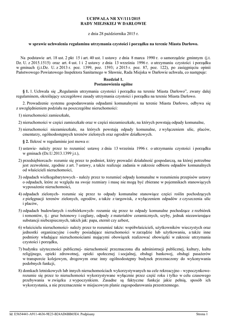UCHWAŁA NR XV/111/2015 RADY MIEJSKIEJ W DARŁOWIE z dnia 28 października 2015 r. w sprawie uchwalenia regulaminu utrzymania czystości i porządku na terenie Miasta Darłowo. Na podstawie art. 18 ust. 2 pkt 15 i art. 40 ust. 1 ustawy z dnia 8 marca 1990 r. o samorządzie gminnym (j.t. Dz. U. z 2015.1515) oraz art. 4 ust. 1 i 2 ustawy z dnia 13 września 1996 r. o utrzymaniu czystości i porządku w gminach (j.t.Dz. U. z 2013 r. poz. 1399, poz. 1593; z 2015 r. poz. 87, poz. 122), po zasięgnięciu opinii Państwowego Powiatowego Inspektora Sanitarnego w Sławnie, Rada Miejska w Darłowie uchwala, co następuje: Rozdział 1. Postanowienia ogólne § 1. 1. Uchwala się „Regulamin utrzymania czystości i porządku na terenie Miasta Darłowo”, zwany dalej regulaminem, określający szczegółowe zasady utrzymania czystości i porządku na terenie Miasta Darłowo. 2. Prowadzenie systemu gospodarowania odpadami komunalnymi na terenie Miasta Darłowo, odbywa się z uwzględnieniem podziału na poszczególne nieruchomości: 1) nieruchomości zamieszkałe, 2) nieruchomości w części zamieszkałe oraz w części niezamieszkałe, na których powstają odpady komunalne, 3) nieruchomości niezamieszkałe, na których powstają odpady komunalne, z wyłączeniem ulic, placów, cmentarzy, ogólnodostępnych terenów zielonych oraz ogrodów działkowych. § 2. Ilekroć w regulaminie jest mowa o: 1) ustawie- należy przez to rozumieć ustawę z dnia 13 września 1996 r. o utrzymaniu czystości i porządku w gminach (Dz.U.2013.1399 j.t.), 2) przedsiębiorcach- rozumie się przez to podmiot, który prowadzi działalność gospodarczą, na której potrzebne jest zezwolenie, zgodnie z art. 7 ustawy, a także realizuje zadania w zakresie odbioru odpadów komunalnych od właścicieli nieruchomości, 3) odpadach wielkogabarytowych - należy przez to rozumieć odpady komunalne w rozumieniu przepisów ustawy o odpadach, które ze względu na swoje rozmiary i masę nie mogą być zbierane w pojemnikach stanowiących wyposażenie nieruchomości, 4) odpadach zielonych- rozumie się przez to odpady komunalne stanowiące części roślin pochodzących z pielęgnacji terenów zielonych, ogrodów, a także z targowisk, z wyłączeniem odpadów z czyszczenia ulic i placów, 5) odpadach budowlanych i rozbiórkowych- rozumie się przez to odpady komunalne pochodzące z rozbiórek i remontów, tj.: gruz betonowy i ceglany, odpady z materiałów ceramicznych, szyby, jednak niezawierające substancji niebezpiecznych, takich jak: papa, eternit czy azbest, 6) właścicielu nieruchomości- należy przez to rozumieć także: współwłaścicieli, użytkowników wieczystych oraz jednostki organizacyjne i osoby posiadające nieruchomości w zarządzie lub użytkowaniu, a także inne podmioty władające nieruchomościami mającymi obowiązek realizować obowiązki w zakresie utrzymania czystości i porządku, 7) budynku użyteczności publicznej- nieruchomość przeznaczona dla administracji publicznej, kultury, kultu religijnego, opieki zdrowotnej, opieki społecznej i socjalnej, obsługi bankowej, obsługi pasażerów w transporcie kolejowym, drogowym oraz inny ogólnodostępny budynek przeznaczony do wykonywania podobnych funkcji, 8) domkach letniskowych lub innych nieruchomościach wykorzystywanych na cele rekreacyjno - wypoczynkowerozumie się przez to nieruchomości wykorzystywane wyłącznie przez część roku i tylko w celu czasowego przebywania w związku z wypoczynkiem. Zasadne są faktyczne funkcje jakie pełnią, sposób ich wykorzystania, a nie przeznaczenie w miejscowym planie zagospodarowania przestrzennego. Id: E5654441-A911-4636-9E23-B24AD6BB65E4. Podpisany Strona 1 Rozdział 2. Wymagania w zakresie utrzymania czystości i porządku na terenie nieruchomości § 3. 1. Właściciele nieruchomości, na których wytwarzane są odpady komunalne, zobowiązani są do prowadzenia selektywnego zbierania odpadów. 2. Odpady komunalne na nieruchomości powinny być zbierane według następujących rodzajów: 1) opakowania ze szkła, 2) papier i tektura, 3) metale, 4) opakowania wielomateriałowe, 5) tworzywa sztuczne, 6) odpady zielone, 7) meble i inne odpady wielkogabarytowe, a także zużyte opony, 8) powstające w gospodarstwach domowych przeterminowane leki i chemikalia oraz zużyte baterie i akumulatory, 9) odpady budowlane i rozbiórkowe, 10) zużyty sprzęt elektryczny i elektroniczny, 11) niesegregowane (zmieszane) odpady komunalne. 3. Odpady komunalne, o których mowa w ust. 2 pkt 3-5, mogą być zbierane i odbierane łącznie. 4. Odpady, o których mowa w ust. 2, z wyłączeniem wymienionych w pkt 7-10 należy zbierać w pojemnikach lub workach, określonych w rozdziale 3. § 4. 1. Właściciele nieruchomości zobowiązani są do uprzątania błota, śniegu, lodu i innych zanieczyszczeń z części nieruchomości służącej do użytku publicznego, w tym z chodników położonych wzdłuż należącej do nich nieruchomości. Właściciel nieruchomości nie jest obowiązany do uprzątnięcia chodnika, na którym jest dopuszczony płatny postój lub parkowanie pojazdów samochodowych. 2. Właściciele nieruchomości mają obowiązek uprzątnięcia zanieczyszczenia wskazanego w ust. 1 w sposób niezanieczyszczający jezdni i dróg dla rowerów. 3. Utrzymanie czystości i porządku wokół pojemnika/worka należy do obowiązku użytkownika posesji. § 5. 1. Mycie pojazdów samochodowych poza myjniami może odbywać się wyłącznie na własnej nieruchomości przy użyciu wody niezawierającej substancji chemicznych. 2. Mycie pojazdów na własnej nieruchomości może być dokonywane wyłącznie w części obejmującej nadwozie pojazdu. 3. Naprawa pojazdów samochodowych poza warsztatami samochodowymi może odbywać się wyłącznie w zakresie obejmującym drobne naprawy własnych samochodów oraz pod warunkiem: 1) niepowodowania negatywnego oddziaływania na środowisko, w tym emisji hałasu lub spalin, 2) gromadz