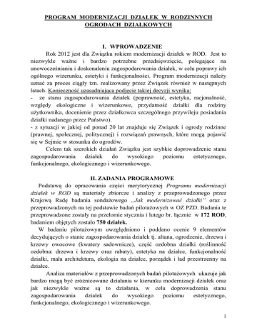 PROGRAM MODERNIZACJI DZIAŁEK W RODZINNYCH OGRODACH DZIAŁKOWYCH I. WPROWADZENIE Rok 2012 jest dla Związku rokiem modernizacji działek w ROD. Jest to niezwykle ważne i bardzo potrzebne przedsięwzięcie, polegające na unowocześnianiu i doskonaleniu zagospodarowania działek, w celu poprawy ich ogólnego wizerunku, estetyki i funkcjonalności. Program modernizacji należy uznać za proces ciągły tzn. realizowany przez Związek również w następnych latach. Konieczność uzasadniająca podjęcie takiej decyzji wynika: - ze stanu zagospodarowania działek (poprawność, estetyka, racjonalność, względy ekologiczne i wizerunkowe, przydatność działki dla rodziny użytkownika, docenienie przez działkowca szczególnego przywileju posiadania działki nadanego przez Państwo). - z sytuacji w jakiej od ponad 20 lat znajduje się Związek i ogrody rodzinne (prawnej, społecznej, politycznej) i rozwiązań prawnych, które mogą pojawić się w Sejmie w stosunku do ogrodów. Celem tak szerokich działań Związku jest szybkie doprowadzenie stanu zagospodarowania działek do wysokiego poziomu estetycznego, funkcjonalnego, ekologicznego i wizerunkowego. II. ZADANIA PROGRAMOWE Podstawą do opracowania części merytorycznej Programu modernizacji działek w ROD są materiały zbiorcze i analizy z przeprowadzonego przez Krajową Radę badania sondażowego „Jak modernizować działki” oraz z przeprowadzonych na tej podstawie badań pilotażowych w OZ PZD. Badania te przeprowadzone zostały na przełomie stycznia i lutego br. łącznie w 172 ROD, badaniem objętych zostało 750 działek. W badaniu pilotażowym uwzględniono i poddano ocenie 9 elementów decydujących o stanie zagospodarowania działek tj. altana, ogrodzenie, drzewa i krzewy owocowe (kwatery sadownicze), część ozdobna działki (roślinność ozdobna: drzewa i krzewy oraz rabaty), estetyka na działce, funkcjonalność działki, mała architektura, ekologia na działce, porządek i ład przestrzenny na działce. Analiza materiałów z przeprowadzonych badań pilotażowych ukazuje jak bardzo mogą być zróżnicowane działania w kierunku modernizacji działek oraz jak niezwykle ważne są to działania, w celu doprowadzenia stanu zagospodarowania działek do wysokiego poziomu estetycznego, funkcjonalnego, ekologicznego i wizerunkowego. 1 W badaniach tych uczestniczyły działki o różnorodnym stanie zagospodarowania, które wymagają zarówno niewielkich zabiegów pielęgnacyjnych i estetycznych oraz takie, które winny zostać poddane w zasadzie kompletnej modernizacji. Program modernizacji działek w ROD uwzględnia konkretne elementy występujące na działkach decydujące o stanie ich zagospodarowania oraz stosowne działania w kierunku ich modernizacji, mianowicie: 1. Altana - ocena jej stanu technicznego, funkcjonalności, estetyki, zgodności z regulaminem ROD (powierzchnia, wysokość, odległości od granic działki) Działania w kierunku modernizacji altany: odświeżanie wyblakłej, zniszczonej przez czynniki atmosferyczne kolorystyki altany, wzbogacanie altany zadaszonym tarasem otwartym, wymiana/remont nawierzchni tarasu, pokrycia dachu altany, konieczność wymiany dachu pokrytego eternitem , gdyż zawiera szkodliwy dla zdrowia ludzkiego azbest, konieczność zamontowywania barierki / balustrady na tarasie, zwłaszcza gdy jest to taras na podwyższeniu i korzystają z niech dzieci, przemalowanie altany na bardziej stonowany odcień, który będzie współgrał z otoczeniem, konieczność gruntownej modernizacji lub rozbiórki w przypadku ,gdzie stan altany został określony jako bardzo zły, nienadający się do użytkowania, konieczność dostosowania altany ponadnormatywnej do wymiarów zgodnych z regulaminem ROD, konieczność przesunięcia altany, która została usytuowana zbyt blisko granic działki (czyli poniżej 3 m). 2. Ogrodzenie - ocena jego stanu technicznego, estetyki, zgodności z regulaminem ROD (wysokość, ażurowość, obecność ostro zakończonych elementów) oraz ustalenia i wnioski w kierunku modernizacji ogrodzenia. Działania w kierunku modernizacji ogrodzenia: konieczność stałej konserwacji ogrodzenia, odświeżanie (pomalowanie) ogrodzenia, wprowadzanie podmurówki pod siatką w przypadku, gdy usytuowana jest ona bezpośrednio na gruncie, 2 renowacja zniszczonej podmurówki, umocowanie słupków metalowych, w celu lepszej stabilizacji ogrodzenia, konieczność wymiany ogrodzenia na nowe w przypadku, gdzie stan jego określony został jako bardzo zły, nienadający się do modernizacji, konieczność usunięcia drutu kolczastego z ogrodzenia, dostosowanie wysokości ogrodzenia do 1 m (zgodnie z regulaminem ROD). 3. Drzewa i krzewy owocowe - ocena ich aktualnego stanu pod względem cięcia, prześwietlania, odmładzania, zgodności z regulaminem ROD (odległości od granic, występowanie odmian i form słabo rosnących), należy poddać ocenie również usytuowanie istniejącej kwatery sadowniczej w odniesieniu do zagospodarowania działki. Działania w kierunku modernizacji kwater sadowniczych: konieczność wykonywania cięcia odmładzającego na starych drzewach owocowych, w celu poprawienia ich kondycji, konieczność wykonywania cięcia prześwietlającego (usuwania pędów chorych, suchych, połamanych), konieczność przeprowadzania cięcia formującego zwłaszcza u młodych drzew owocowych, w celu wytworzenia mocnego pnia i dobrze oświetlonej, silnej korony, zdolnej utrzymać ciężar owoców, konieczność wykonywania inwentaryzacji istniejących nasadzeń i zaplanowanie nowego układu części sadowniczej (z uwzględnieniem nowych nasadzeń i wprowadzeniem form słabo rosnących) w przypadku, gdy obecny wygląd wprowadza chaos i nieład w ogólnej ocenie działki, uzupełnienie istniejącej kwatery sadowniczej nowymi nasadzeniami gatunków owocujących, ze względu na zbyt małą gęstość nasadzeń, usunięcie okazów chorych, uszkodzonych przez czynniki atmosfery