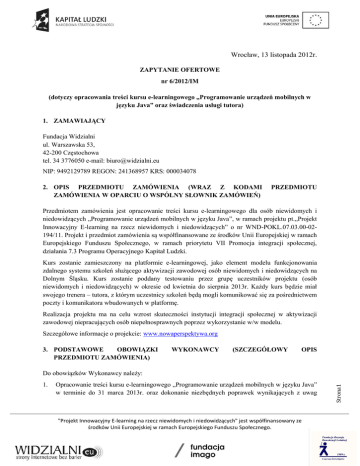 Wrocław, 13 listopada 2012r. ZAPYTANIE OFERTOWE nr 6/2012/IM (dotyczy opracowania treści kursu e-learningowego „Programowanie urządzeń mobilnych w języku Java” oraz świadczenia usługi tutora) 1. ZAMAWIAJĄCY Fundacja Widzialni ul. Warszawska 53, 42-200 Częstochowa tel. 34 3776050 e-mail: [email protected] NIP: 9492129789 REGON: 241368957 KRS: 000034078 2. OPIS PRZEDMIOTU ZAMÓWIENIA (WRAZ Z KODAMI ZAMÓWIENIA W OPARCIU O WSPÓLNY SŁOWNIK ZAMÓWIEŃ) PRZEDMIOTU Przedmiotem zamówienia jest opracowanie treści kursu e-learningowego dla osób niewidomych i niedowidzących „Programowanie urządzeń mobilnych w języku Java”, w ramach projektu pt.„Projekt Innowacyjny E-learning na rzecz niewidomych i niedowidzących” o nr WND-POKL.07.03.00-02194/11. Projekt i przedmiot zamówienia są współfinansowane ze środków Unii Europejskiej w ramach Europejskiego Funduszu Społecznego, w ramach priorytetu VII Promocja integracji społecznej, działania 7.3 Programu Operacyjnego Kapitał Ludzki. Kurs zostanie zamieszczony na platformie e-learningowej, jako element modelu funkcjonowania zdalnego systemu szkoleń służącego aktywizacji zawodowej osób niewidomych i niedowidzących na Dolnym Śląsku. Kurs zostanie poddany testowaniu przez grupę uczestników projektu (osób niewidomych i niedowidzących) w okresie od kwietnia do sierpnia 2013r. Każdy kurs będzie miał swojego trenera – tutora, z którym uczestnicy szkoleń będą mogli komunikować się za pośrednictwem poczty i komunikatora wbudowanych w platformę. Realizacja projektu ma na celu wzrost skuteczności instytucji integracji społecznej w aktywizacji zawodowej niepracujących osób niepełnosprawnych poprzez wykorzystanie w/w modelu. Szczegółowe informacje o projekcie: www.nowaperspektywa.org 3. PODSTAWOWE OBOWIĄZKI PRZEDMIOTU ZAMÓWIENIA) WYKONAWCY (SZCZEGÓŁOWY OPIS 1. Opracowanie treści kursu e-learningowego „Programowanie urządzeń mobilnych w języku Java” w terminie do 31 marca 2013r. oraz dokonanie niezbędnych poprawek wynikających z uwag "Projekt Innowacyjny E-learning na rzecz niewidomych i niedowidzących" jest współfinansowany ze środków Unii Europejskiej w ramach Europejskiego Funduszu Społecznego. Strona1 Do obowiązków Wykonawcy należy: uczestników projektu/ewaluatorów na etapie testowania kursu w okresie od kwietnia do sierpnia 2013r. 2. Świadczenie usługi tutora z zakresu tematyki kursu „Programowanie urządzeń mobilnych w języku Java” podczas testowania kursu w wymiarze średnio 60h na miesiąc przez okres ok. 4 miesięcy (w okresie kwiecień – sierpień 2013r.) Treść kursu powinna zostać opracowana w oparciu o szczegółowe założenia i plany szkoleniowe zawarte w dokumencie – „Wstępna wersja produktu finalnego - Modelu funkcjonowania zdalnego systemu szkoleń wspierających aktywizację osób niewidomych i niedowidzących” pod adresem http://nowaperspektywa.org/dokumenty,m,mg,11 oraz załączonych wytycznych dla autorów materiałów dydaktycznych. Przedmiot zamówienia według kodu CPV: Usługi edukacyjne i szkoleniowe Słownik główny 80000000-4 4. WARUNKI UDZIAŁU WYKONAWCY W POSTĘPOWANIU Warunki konieczne: Wykształcenie wyższe, Doświadczenie zawodowe w opracowywaniu programów szkoleniowych i prowadzeniu szkoleń z zakresu programowania obiektowego i współbieżnego. 5. SPOSÓB PRZYGOTOWANIA OFERTY Oferty należy składać we wskazanym terminie, korzystając z załączonego formularza ofertowego – załącznik nr 1 do Zapytania Ofertowego. Do oferty należy załączyć oświadczenie Wykonawcy, zgodnie z załącznikiem nr 2 do Zapytania Ofertowego. W celu potwierdzenia spełniania warunków udziału w postępowaniu, Wykonawca proszony jest o przedstawienie wraz z ofertą CV, z którego będzie jasno wynikało, iż Wykonawca spełnia przedmiotowe warunki. Niespełnienie chociażby jednego z w/w warunków koniecznych będzie skutkować odrzuceniem oferty Wykonawcy, tj. oferta nie będzie brana pod uwagę przy ocenie. 6. OPIS KRYTERIÓW I SPOSOBU OCENY OFERT Przy wyborze ofert Zamawiający będzie się kierował następującym kryterium: Wykonawca, który poda najniższą cenę brutto otrzyma 70 pkt., natomiast pozostałe oferty otrzymają punktację proporcjonalnie na podstawie wzoru: cena najniższej oferty/cena badanej oferty x 70. Maksymalnie w tym kryterium można uzyskać 70 punktów. "Projekt Innowacyjny E-learning na rzecz niewidomych i niedowidzących" jest współfinansowany ze środków Unii Europejskiej w ramach Europejskiego Funduszu Społecznego. Strona2 a) Kryterium oceny ofert – cena brutto 70% a) Kryterium oceny ofert – doświadczenie zawodowe w opracowywaniu treści kursów/szkoleń i prowadzeniu szkoleń z zakresu programowania obiektowego i współbieżnego 20% Wykonawca, który wykaże się największym doświadczeniem, otrzyma 20 pkt., natomiast pozostałe oferty otrzymają punktację proporcjonalnie na podstawie wzoru: doświadczenie oferty badanej / oferta z największym doświadczeniem x 20. Maksymalnie w tym kryterium można uzyskać 20 punktów. Doświadczenie zawodowe ofert będzie punktowane według poniższej tabeli: Liczba punktów Kryterium 5pkt Za wykazanie do 2 lat doświadczenia zawodowego w opracowywaniu treści kursów/szkoleń i prowadzeniu szkoleń z zakresu programowania obiektowego i współbieżnego 10pkt Za wykazanie powyżej 2 lat do 5 lat doświadczenia zawodowego w opracowywaniu treści kursów/szkoleń i prowadzeniu szkoleń z zakresu programowania obiektowego i współbieżnego 15pkt Za wykazanie powyżej 5 lat doświadczenia zawodowego w opracowywaniu treści kursów/szkoleń i prowadzeniu szkoleń z zakresu programowania obiektowego i współbieżnego b) Kryterium oceny ofert – doświadczenie zawodowe w pracy programisty 10% Wykonawca, który wykaże się największym doświadczeniem, otrzyma 10 pkt., natomiast pozostałe oferty otrzymają punktację proporcjonalnie na podstawie wzoru: do