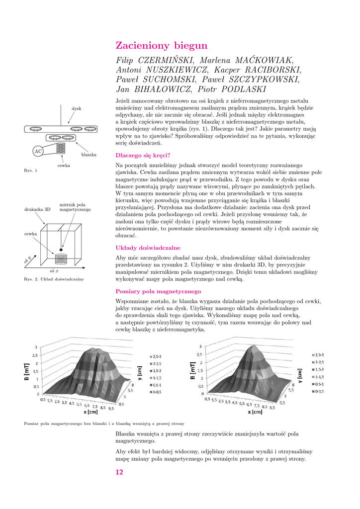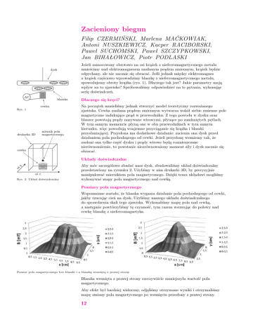 Zacieniony biegun Filip CZERMIŃSKI, Marlena MAĆKOWIAK, Antoni NUSZKIEWICZ, Kacper RACIBORSKI, Paweł SUCHOMSKI, Paweł SZCZYPKOWSKI, Jan BIHAŁOWICZ, Piotr PODLASKI Jeżeli zamocowany obrotowo na osi krążek z nieferromagnetycznego metalu umieścimy nad elektromagnesem zasilanym prądem zmiennym, krążek będzie odpychany, ale nie zacznie się obracać. Jeśli jednak między elektromagnes a krążek częściowo wprowadzimy blaszkę z nieferromagnetycznego metalu, spowodujemy obroty krążka (rys. 1). Dlaczego tak jest? Jakie parametry mają wpływ na to zjawisko? Spróbowaliśmy odpowiedzieć na te pytania, wykonując serię doświadczeń. Dlaczego się kręci? Rys. 1 Na początek musieliśmy jednak stworzyć model teoretyczny rozważanego zjawiska. Cewka zasilana prądem zmiennym wytwarza wokół siebie zmienne pole magnetyczne indukujące prąd w przewodniku. Z tego powodu w dysku oraz blaszce powstają prądy nazywane wirowymi, płynące po zamkniętych pętlach. W tym samym momencie płyną one w obu przewodnikach w tym samym kierunku, więc powodują wzajemne przyciąganie się krążka i blaszki przysłaniającej. Przysłona ma dodatkowe działanie: zacienia ona dysk przed działaniem pola pochodzącego od cewki. Jeżeli przysłonę wsuniemy tak, że zasłoni ona tylko część dysku i prądy wirowe będą rozmieszczone nierównomiernie, to powstanie niezrównoważony moment siły i dysk zacznie się obracać. Układy doświadczalne Rys. 2. Układ doświadczalny Aby móc szczegółowo zbadać nasz dysk, zbudowaliśmy układ doświadczalny przedstawiony na rysunku 2. Użyliśmy w nim drukarki 3D, by precyzyjnie manipulować miernikiem pola magnetycznego. Dzięki temu układowi mogliśmy wykonywać mapy pola magnetycznego nad cewką. Pomiary pola magnetycznego Wspomniane zostało, że blaszka wygasza działanie pola pochodzącego od cewki, jakby rzucając cień na dysk. Użyliśmy naszego układu doświadczalnego do sprawdzenia skali tego zjawiska. Wykonaliśmy mapę pola nad cewką, a następnie powtórzyliśmy tę czynność, tym razem wsuwając do połowy nad cewkę blaszkę z nieferromagnetyka. Pomiar pola magnetycznego bez blaszki i z blaszką wsuniętą z prawej strony Blaszka wsunięta z prawej strony rzeczywiście zmniejszyła wartość pola magnetycznego. Aby efekt był bardziej widoczny, odjęliśmy otrzymane wyniki i otrzymaliśmy mapę zmiany pola magnetycznego po wsunięciu przesłony z prawej strony. 12 Zmiana jest wyraźnie zauważalna. Z naszych obliczeń wynika, że blaszka zmniejszyła wartość pola nad sobą o 32%. Symulacja jakościowa Aby móc przewidzieć wpływ położenia przysłony na obrót dysku, opracowaliśmy jakościową symulację komputerową. Skorzystaliśmy z naszych badań pola nad cewką oraz przedstawionego wyżej, uproszczonego opisu oddziaływania między prądami wirowymi na dysku i blaszce. Wiedząc, jakie pole magnetyczne występuje w określonym miejscu dysku przy określonym położeniu przysłony, mogliśmy przewidzieć względną zmianę momentu siły, jaka działa na dysk w zależności od położenia przesłony. Rysunek 3 przedstawia przykładowy wynik symulacji. Rys. 3. Na osi poziomej odległość przesłony od środka dysku, na pionowej moment siły. Wyniki naszej symulacji komputerowej okazały się bardzo podobne do wyników doświadczalnych. Podsumowanie Wiemy już teraz, dlaczego dysk się kręci, możemy też zbadać wpływ rozmaitych parametrów układu na jego obrót. Z naszych badań wynikają następujące zależności: • kierunek obrotu dysku zależy od tego, z której strony dysku wsuniemy przesłonę; • zmiana położenia blaszki, zarówno wsunięcie, jak przesunięcie w bok, zmienia częstotliwość obrotów dysku; • częstotliwość obrotów dysku jest proporcjonalna do przewodności materiału przysłony; • moment siły działający na krążek jest tym większy, im większe jest natężenie prądu płynącego przez cewkę; • częstotliwość obrotów dysku zależy od częstotliwości prądu na cewce. Niezależność zdarzeń w modelu klasycznym W teorii prawdopodobieństwa mówimy o modelu klasycznym, gdy zbiór wszystkich zdarzeń elementarnych Ω jest zbiorem skończonym i wszystkie zdarzenia jednoelementowe są jednakowo prawdopodobne. W modelu klasycznym dla każdego zdarzenia losowego A ⊂ Ω prawdopodobieństwo tego zdarzenia jest równe: P (A) = |A| . |Ω| Zdarzenia losowe A, B ⊂ Ω są niezależne, gdy P (A ∩ B) = P (A)P (B). Zdarzenie losowe A będziemy nazywali nietrywialnym, gdy 0 < P (A) < 1. 13 Rozważmy model klasyczny, w którym |Ω| = n > 1 i takie zdarzenie losowe B ⊂ Ω, że |B| = k > 0. Czytelnikowi sugerujemy przeprowadzenie dowodu (np. metodą nie wprost) następującego faktu: jeżeli NWD(k, n) = 1, tzn. liczby k oraz n są względnie pierwsze, to nie istnieje nietrywialne zdarzenie losowe A, które jest niezależne z B. Z tego faktu wynika wniosek: jeżeli |Ω| = n jest liczbą pierwszą, to nie istnieją dwa zdarzenia losowe A, B ⊂ Ω, które są nietrywialne i niezależne. Czyżby grający w amerykańską ruletkę o 37 polach o tym nie wiedzieli? Edward STACHOWSKI