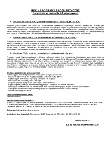 REVI - PROGRAMY PROFILAKTYCZNE Ćwiczenia w grupach 5-6 osobowych 1. Program ReviActive PLK – profilaktyka lędźwiowo – krzyżowa (50 – 55 min.) Program profilaktyczny dla osób ze schorzeniami lędźwiowo-krzyżowego odcinka kręgosłupa. Celem jest wzmocnienie osłabionych mięśni posturalnych oraz rozciągnięcie mięśni przykurczonych dolnego odcinka kręgosłupa. Ćwiczenia czynne wolne i z oporem, izometryczne, koordynacyjne, równoważne oraz korekcyjne pozwolą zarówno na zwiększenie siły mięśni podtrzymujących kręgosłup, wyrobienie nawyku prawidłowej postawy jak i skorygowanie jej wad. Zajęcia uzupełnione są ćwiczeniami oddechowymi oraz terapią ułożeniową (pozycje bezbolesne). 2. Program ReviActive POS – profilaktyka odcinka szyjnego (50 – 55 min.) Program profilaktyczny dla osób ze schorzeniami szyjnego odcinka kręgosłupa. Celem jest wzmocnienie osłabionych mięśni posturalnych oraz rozciągnięcie mięśni przykurczonych górnego odcinka kręgosłupa. Zajęcia skupiają uwagę na rozluźnieniu mięśni szyi i karku, rozciągnięciu mięśni obręczy barkowej i klatki piersiowej oraz zwiększeniu siły górnej części tułowia. Dodatkowo wprowadzane są ćwiczenia oddechowe oraz ćwiczenia wyrabiające nawyk prawidłowej postawy ciała w pracy (np. przy komputerze). 3. ReviRelax PRR – program rozluźniająco – relaksujący (45 – 50 min.) Program rozluźniająco-antystresowy, którego głównym celem jest rozluźnienie kręgosłupa, uwolnienie ciała od nadmiernych napięć mięśniowych oraz wyciszenie całego organizmu. Nauka efektywnego rozluźniania mięśni oraz kontroli oddechu ułatwi pozbyć się długotrwałego, mającego swe korzenie w codziennym stresie, bólu mięśni i kręgosłupa. W czasie zajęć pojawią się elementy treningu autogennego Schulza, techniki relaksacji mięśni Jacobsona oraz leżanki relaksacyjne z systemu ćwiczeń jogi i pilates. Zajęcia prowadzone przy muzyce, która ma działanie terapeutyczne, rozładują stres, dodadzą radości i energii do działania. Dla kogo programy są przeznaczone? Nasze zajęcia zostały opracowane szczególnie z myślą o osobach: - aktywnych zawodowo, nie mających czasu zadbać o swoje zdrowie - spędzających dużo czasu w pozycji siedzącej lub stojącej - narażonych na codzienny stres i emocje - chcących poznać lepiej swoje ciało i żyć z nim w harmonii - mających predyspozycje do schorzeń kręgosłupa i chcącym już dziś im zapobiec - cierpiących na chroniczne lub nawracające bóle kręgosłupa i napięcia mięśni różnego pochodzenia - pragnących spróbować nowych rozwiązań jako uzupełnienie dotychczasowych terapii - czynnie uprawiających sport Zalecana częstotliwość zajęć: 2 razy w tygodniu Jak się przygotować do zajęć? Prosimy o zaopatrzenie się w strój sportowy, nie krępujący ruchów oraz obuwie zmienne - najlepiej tradycyjne klapki. W szatni znajdującej się w części rehabilitacyjnej przychodni znajdują się przebieralnie oraz szafki ubraniowe zamykane na kluczyk dostępny w Rejestracji za pozostawieniem dokumentu tożsamości. Skierowanie lekarskie: nie wymagane Umówienie terminu zajęć: Rejestracja NZOZ Revimed, tel. 58 345 44 10; 58 345 10 30 ZAPRASZAMY! ILOŚĆ MIEJSC OGRANICZONA!!!