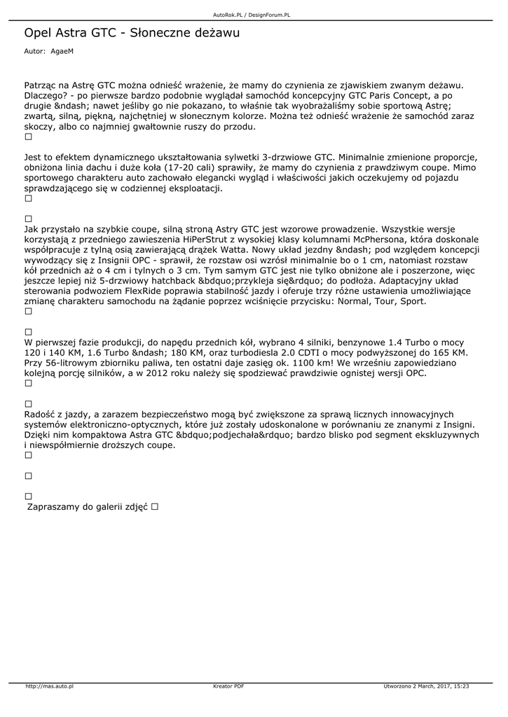 AutoRok.PL / DesignForum.PL Opel Astra GTC - Słoneczne deżawu Autor: AgaeM Patrząc na Astrę GTC można odnieść wrażenie, że mamy do czynienia ze zjawiskiem zwanym deżawu. Dlaczego? - po pierwsze bardzo podobnie wyglądał samochód koncepcyjny GTC Paris Concept, a po drugie – nawet jeśliby go nie pokazano, to właśnie tak wyobrażaliśmy sobie sportową Astrę; zwartą, silną, piękną, najchętniej w słonecznym kolorze. Można też odnieść wrażenie że samochód zaraz skoczy, albo co najmniej gwałtownie ruszy do przodu. Jest to efektem dynamicznego ukształtowania sylwetki 3-drzwiowe GTC. Minimalnie zmienione proporcje, obniżona linia dachu i duże koła (17-20 cali) sprawiły, że mamy do czynienia z prawdziwym coupe. Mimo sportowego charakteru auto zachowało elegancki wygląd i właściwości jakich oczekujemy od pojazdu sprawdzającego się w codziennej eksploatacji. Jak przystało na szybkie coupe, silną stroną Astry GTC jest wzorowe prowadzenie. Wszystkie wersje korzystają z przedniego zawieszenia HiPerStrut z wysokiej klasy kolumnami McPhersona, która doskonale współpracuje z tylną osią zawierającą drążek Watta. Nowy układ jezdny – pod względem koncepcji wywodzący się z Insignii OPC - sprawił, że rozstaw osi wzrósł minimalnie bo o 1 cm, natomiast rozstaw kół przednich aż o 4 cm i tylnych o 3 cm. Tym samym GTC jest nie tylko obniżone ale i poszerzone, więc jeszcze lepiej niż 5-drzwiowy hatchback „przykleja się” do podłoża. Adaptacyjny układ sterowania podwoziem FlexRide poprawia stabilność jazdy i oferuje trzy różne ustawienia umożliwiające zmianę charakteru samochodu na żądanie poprzez wciśnięcie przycisku: Normal, Tour, Sport. W pierwszej fazie produkcji, do napędu przednich kół, wybrano 4 silniki, benzynowe 1.4 Turbo o mocy 120 i 140 KM, 1.6 Turbo – 180 KM, oraz turbodiesla 2.0 CDTI o mocy podwyższonej do 165 KM. Przy 56-litrowym zbiorniku paliwa, ten ostatni daje zasięg ok. 1100 km! We wrześniu zapowiedziano kolejną porcję silników, a w 2012 roku należy się spodziewać prawdziwie ognistej wersji OPC. Radość z jazdy, a zarazem bezpieczeństwo mogą być zwiększone za sprawą licznych innowacyjnych systemów elektroniczno-optycznych, które już zostały udoskonalone w porównaniu ze znanymi z Insigni. Dzięki nim kompaktowa Astra GTC „podjechała” bardzo blisko pod segment ekskluzywnych i niewspółmiernie droższych coupe. Zapraszamy do galerii zdjęć http://mas.auto.pl Kreator PDF Utworzono 2 March, 2017, 15:23
