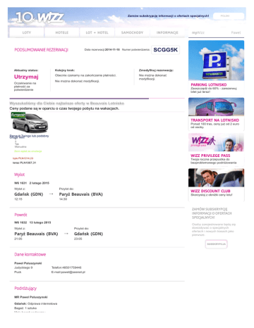 Zamów subskrypcję informacji o ofertach specjalnych! LOTY HOTELE LOT + HOTEL PODSUMOWANIE REZERWACJI SAMOCHODY Data rezerwacji:2014-11-18 Numer potwierdzenia: INFORMACJE Kolejny krok: Zmodyfikuj rezerwację: Utrzymaj Obecnie czekamy na zakończenie płatności. Nie można dokonać modyfikacji. Oczekiwanie na płatność za potwierdzenie Pawel Pawel myWizz myWizz SCGG5K Aktualny status: Nie można dokonać modyfikacji. POLSKI PARKING LOTNISKO Zaoszczędź do 60% - zarezerwuj bilet już teraz! Wyszukaliśmy dla Ciebie najtańsze oferty w Beauvais Lotnisko Ceny podane są w oparciu o czas twojego pobytu na wakacjach. TRANSPORT NA LOTNISKO Ponad 100 tras, ceny już od 2 euro od osoby. Renault Twingo lub podobny Grupa: Mini 4 3 Tak Manualna Zero opłat za anulacje WIZZ PRIVILEGE PASS było PLN1214,23 Twoja roczna przepustka do bezproblemowego podróżowania teraz PLN1067,31 Wylot W6 1631 2 lutego 2015 Wylot z: Gdańsk (GDN) Przylot do: → 12:15 Paryż Beauvais (BVA) WIZZ DISCOUNT CLUB Skorzystaj z obniżki ceny lotu! 14:30 ZAMÓW SUBSKRYPCJĘ INFORMACJI O OFERTACH SPECJALNYCH! Powrót W6 1632 13 lutego 2015 Wylot z: Przylot do: Paryż Beauvais (BVA) 21:05 → Gdańsk (GDN) Osoby zarejestrowane będą się dowiadywać o specjalnych ofertach i nowych trasach jako pierwsze. 23:05 SUBSKRYPCJA Dane kontaktowe Pawel Paluszynski Judyckiego 9 Telefon:48501759446 Puck E-mail:[email protected] Podróżujący MR Pawel Paluszynski Gdańsk: Odprawa internetowa Bagaż: 1 sztuka Mały bagaż podręczny Mały bagaż podręczny Potrzebujesz hotelu w mieście Paryż Paryż Beauvais: Odprawa internetowa Bagaż: 1 sztuka Mały bagaż podręczny od 111.72 PLN / noc Żadnych opłat rezerwacyjnych MR Krzysztof Jetke Pay at the hotel Gdańsk: Odprawa internetowa Najlepsza Cena Mały bagaż podręczny Paryż Beauvais: Odprawa internetowa Mały bagaż podręczny ZAREZERWUJ TERAZ Podsumowanie płatności Lot powrotny Gdańsk (GDN) →Paryż Beauvais (BVA) 196,00 zł Bagaż 122,00 zł WIZZ Discount Club 139,00 zł Opłata manipulacyjna 140,00 zł Łączna cena 597,00 zł Wyszukaliśmy dla Ciebie najtańsze oferty w Beauvais Lotnisko PLN72 już od za dzień ZOBACZ DOSTĘPNE AUTA » MASZ PYTANIE? TELECENTRUM Często zadawane pytania Copyright © 2004-2012 Wizz Air © 2000-2012 Navitaire z Polski: 703 60 39 93 4.26 zł/min numery lokalne do innych krajów Zasady poufności