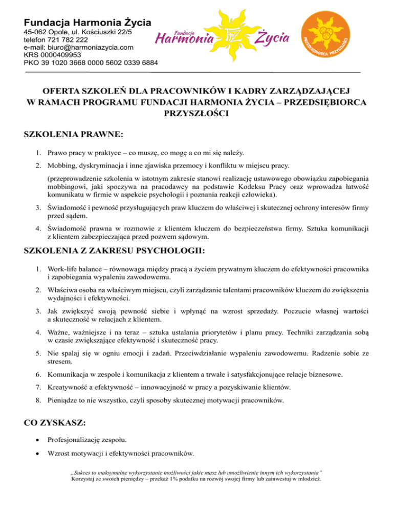 Fundacja Harmonia Życia 45-062 Opole, ul. Kościuszki 22/5 telefon 721 782 222 e-mail: [email protected] KRS 0000409953 PKO 39 1020 3668 0000 5602 0339 6884 OFERTA SZKOLEŃ DLA PRACOWNIKÓW I KADRY ZARZĄDZAJĄCEJ W RAMACH PROGRAMU FUNDACJI HARMONIA ŻYCIA – PRZEDSIĘBIORCA PRZYSZŁOŚCI SZKOLENIA PRAWNE: 1. Prawo pracy w praktyce – co muszę, co mogę a co mi się należy. 2. Mobbing, dyskryminacja i inne zjawiska przemocy i konfliktu w miejscu pracy. (przeprowadzenie szkolenia w istotnym zakresie stanowi realizację ustawowego obowiązku zapobiegania mobbingowi, jaki spoczywa na pracodawcy na podstawie Kodeksu Pracy oraz wprowadza łatwość komunikatu w firmie w aspekcie psychologii i poznania reakcji człowieka). 3. Świadomość i pewność przysługujących praw kluczem do właściwej i skutecznej ochrony interesów firmy przed sądem. 4. Świadomość prawna w rozmowie z klientem kluczem do bezpieczeństwa firmy. Sztuka komunikacji z klientem zabezpieczająca przed pozwem sądowym. SZKOLENIA Z ZAKRESU PSYCHOLOGII: 1. Work-life balance – równowaga między pracą a życiem prywatnym kluczem do efektywności pracownika i zapobiegania wypaleniu zawodowemu. 2. Właściwa osoba na właściwym miejscu, czyli zarządzanie talentami pracowników kluczem do zwiększenia wydajności i efektywności. 3. Jak zwiększyć swoją pewność siebie i wpłynąć na wzrost sprzedaży. Poczucie własnej wartości a skuteczność w relacjach z klientem. 4. Ważne, ważniejsze i na teraz – sztuka ustalania priorytetów i planu pracy. Techniki zarządzania sobą w czasie zwiększające efektywność i skuteczność pracy. 5. Nie spalaj się w ogniu emocji i zadań. Przeciwdziałanie wypaleniu zawodowemu. Radzenie sobie ze stresem. 6. Komunikacja w zespole i komunikacja z klientem a trwałe i satysfakcjonujące relacje biznesowe. 7. Kreatywność a efektywność – innowacyjność w pracy a pozyskiwanie klientów. 8. Pieniądze to nie wszystko, czyli sposoby skutecznej motywacji pracowników. CO ZYSKASZ: Profesjonalizację zespołu. Wzrost motywacji i efektywności pracowników. „Sukces to maksymalne wykorzystanie możliwości jakie masz lub umożliwienie innym ich wykorzystania” Korzystaj ze swoich pieniędzy – przekaż 1% podatku na rozwój swojej firmy lub zainwestuj w młodzież. Fundacja Harmonia Życia 45-062 Opole, ul. Kościuszki 22/5 telefon 721 782 222 e-mail: [email protected] KRS 0000409953 PKO 39 1020 3668 0000 5602 0339 6884 Wzrost znajomości prawa wpływający na przyspieszenie procedur toczących się w firmie. Wiedzę dotyczącą prawnego zabezpieczenia interesów firmy. Bezpłatną realizację ustawowego obowiązku zapobiegania dyskryminacji w miejscu pracy. Techniki i narzędzia usprawniające pracę i komunikację gotowe do wprowadzenia w firmie. INFORMACJE UZUPEŁNIAJĄCE: Wszystkie szkolenia ukierunkowane są na podwyższenie poziomu wiedzy zawodowej uczestników i wykształcenie profesjonalnych umiejętności praktycznych. Fundacja dysponuje własną salą szkoleniową wraz z niezbędnym wyposażeniem multimedialnym. Szkolenia mogą być stacjonarne, jedno lub kilkudniowe. Organizujemy również szkolenia wyjazdowe. Dopasowujemy każde ze szkoleń indywidualnie do potrzeb firmy, po wcześniejszym omówieniu szczegółów. UCZESTNICTWO W SZKOLENIU Aby otrzymać bezpłatne szkolenia w ramach programu Przedsiębiorca Przyszłości, wystarczy skorzystać z bezpłatnej możliwości wspierania Organizacji Pożytku Publicznego. Należy przekazać 1% podatku swojego przedsiębiorstwa i/lub pracowników na rzecz Fundacji Harmonia Życia KRS 0000409953 i udokumentować wpłatę. Równowartość kwoty 1% podatku przeliczana jest na ilość godzin szkoleniowych oraz koszt dojazdu. MŁODZIEŻ – NAJLEPSZA INWESTYCJA Jeżeli nie potrzebują Państwo szkoleń dla swojej Firmy, mimo to z całego serca prosimy o wpłaty 1% podatku, który zostanie przeznaczony na programy: Radosne Macierzyństwo i Edukacja Przyszłości. Spełnijmy wspólnie marzenia najmłodszych. Pomóżmy im rozwijać swój potencjał oraz wzrastać w zdrowiu, radości i miłości. PODOBAJĄ CI SIĘ NASZE DZIAŁANIA? PRZYŁĄCZ SIĘ DO NAS I WSPIERAJ PROGRAMY FUNDACJI HARMONIA ŻYCIA POPRZEZ: Wpłaty na numer konta PKO 39 1020 3668 0000 5602 0339 6884 Wynajem sali szkoleniowych „Sukces to maksymalne wykorzystanie możliwości jakie masz lub umożliwienie innym ich wykorzystania” Korzystaj ze swoich pieniędzy – przekaż 1% podatku na rozwój swojej firmy lub zainwestuj w młodzież.