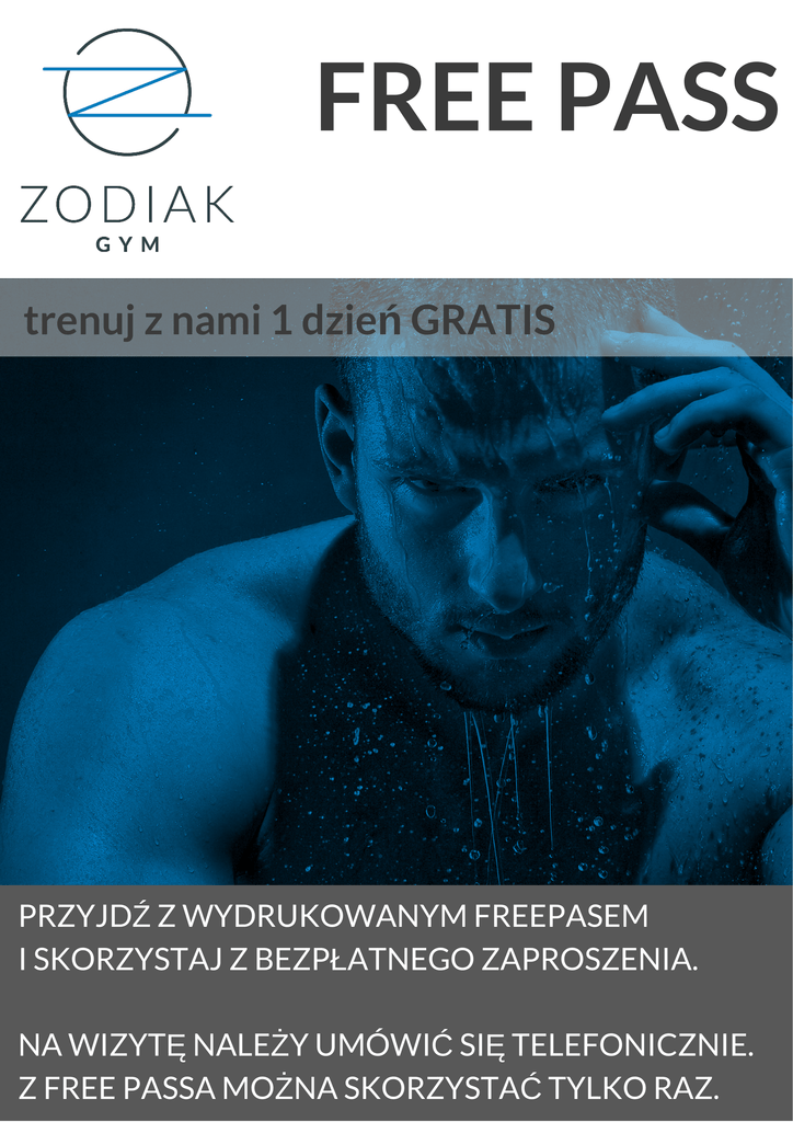FREE PASS trenuj z nami 1 dzień GRATIS PRZYJDŹ Z WYDRUKOWANYM FREEPASEM I SKORZYSTAJ Z BEZPŁATNEGO ZAPROSZENIA. NA WIZYTĘ NALEŻY UMÓWIĆ SIĘ TELEFONICZNIE. Z FREE PASSA MOŻNA SKORZYSTAĆ TYLKO RAZ. FREE PASS ZASADY KORZYSTANIA 1. Brak limitów godzinowych korzystania z klubu w okresie obowiązywania FREE PASS'A. 2. Klient w ramach FREE PASS'A może korzystać ze wszystkich stref klubu, sauny, a także zajęć grupowych po wcześniejszej rezerwacja telefonicznej, celem ustalenia wolnych miejsc na zajęciach. 3. Klientowi przysługuje oprowadzenie po klubie z przedstawicielem Działu Sprzedaży oraz wprowadzenie do ćwiczeń z instruktorem – instruktaż wprowadzający (uwzględniający pokazanie sprzętu i zasad jego obsługi); wymagana wcześniejsza rezerwacja telefoniczna celem ustalenia godzin z instruktorem. 4. Po treningu następuje ponowne spotkanie z przedstawicielem Działu Sprzedaży, przedstawienie oferty klubu. 5. W trakcie wykonywania ćwiczeń w klubie ZODIAK GYM obowiązuje paragraf 4 regulaminu klubu ZODIAK GYM. 6. Ćwiczenia należy wykonywać w stroju sportowym i w obuwiu sportowym (zmiennym). 7. Informacje dodatkowe: należy mieć ze sobą ręcznik, kłódkę do szafki w szatni, klapki pod prysznic. Kłódkę oraz ręczniki można zakupić w recpecji klubu.