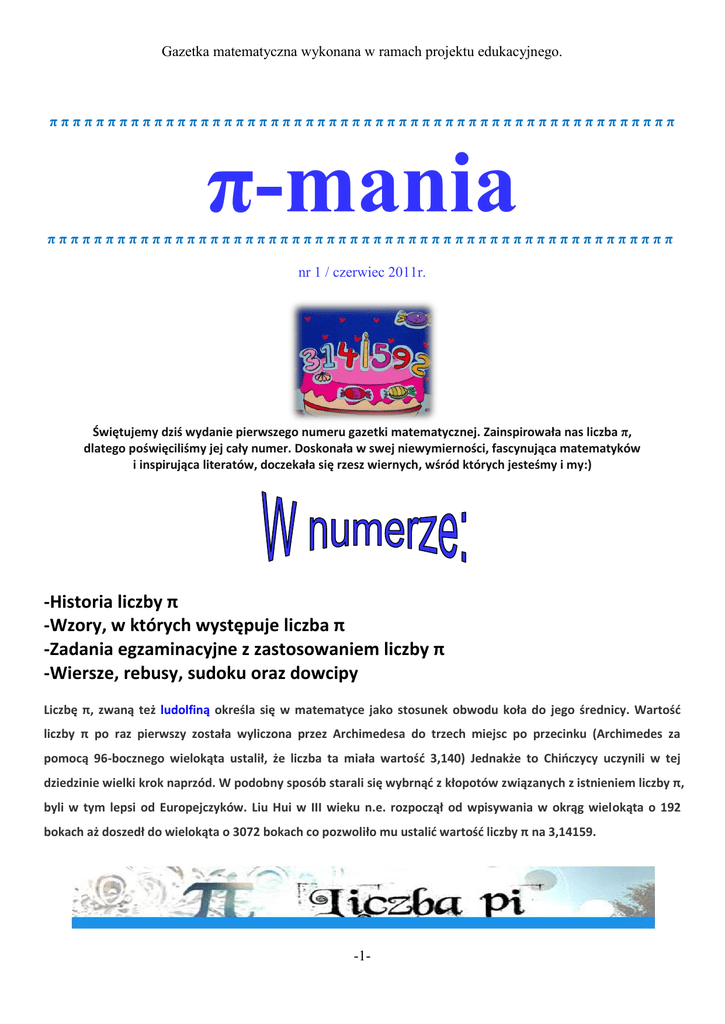 Gazetka matematyczna wykonana w ramach projektu edukacyjnego. ππππππππππππππππππππππππππππππππππππππππππππππππππππππ π-mania ππππππππππππππππππππππππππππππππππππππππππππππππππππππ nr 1 / czerwiec 2011r. Świętujemy dziś wydanie pierwszego numeru gazetki matematycznej. Zainspirowała nas liczba π, dlatego poświęciliśmy jej cały numer. Doskonała w swej niewymierności, fascynująca matematyków i inspirująca literatów, doczekała się rzesz wiernych, wśród których jesteśmy i my:) -Historia liczby π -Wzory, w których występuje liczba π -Zadania egzaminacyjne z zastosowaniem liczby π -Wiersze, rebusy, sudoku oraz dowcipy Liczbę π, zwaną też ludolfiną określa się w matematyce jako stosunek obwodu koła do jego średnicy. Wartośd liczby π po raz pierwszy została wyliczona przez Archimedesa do trzech miejsc po przecinku (Archimedes za pomocą 96-bocznego wielokąta ustalił, że liczba ta miała wartośd 3,140) Jednakże to Chioczycy uczynili w tej dziedzinie wielki krok naprzód. W podobny sposób starali się wybrnąd z kłopotów związanych z istnieniem liczby π, byli w tym lepsi od Europejczyków. Liu Hui w III wieku n.e. rozpoczął od wpisywania w okrąg wielokąta o 192 bokach aż doszedł do wielokąta o 3072 bokach co pozwoliło mu ustalid wartośd liczby π na 3,14159. -1- Gazetka matematyczna wykonana w ramach projektu edukacyjnego. Historia liczby π Archimedes określił wartośd liczby π jako 3 i 1/7 , obecnie jednak wiemy że owa liczba nie wyraża stosunku długości okręgu do średnicy dokładnie. Dowiedziono bowiem, że stosunek ten nie może byd w ogóle wyrażony żadnym ułamkiem skooczonym. Możemy natomiast napisad go w postaci ułamka dziesiętnego z takim bądź innym przybliżeniem, zależnie od żądanej dokładności. Jeden z matematyków XVI stulecia, Ludolf z Lejdy, obliczył stosunek długości okręgu do średnicy z 35 cyframi dziesiętnymi. Rekord Ludolfa pobił w roku 1873 matematyk Shanks, który obliczył wartośd π z 707 cyframi po przecinku. Shanksa z kolei prześcignęli w 1946 roku Ferguson z uniwersytetu w Manchester i niezależnie od niego Wrench z Waszyngtonu, którzy wyrachowali 808 cyfr rozwinięcia dziesiętnego liczby π, wykrywając przy tym błąd Shanksa począwszy od 528 miejsca po przecinku. Obecnie elektronowe maszyny liczące podają wynik π wynoszący ponad 2000 cyfr po przecinku. (W. Krysicki, M. Mikosz – Tajemnice liczb ) π w poezji stanowi inspirację dla wierszokletów i poetów. Co ambitniejsi tworzą utwory, w których długośd każdego kolejnego słowa jest równa kolejnej cyfrze w rozwinięciu dziesiętnym liczby π. Przedstawiamy Wam fragment wiersza Wisławy Szymborskiej oraz dwa wierszyki pozwalające zapamiętad rozwinięcie dziesiętne liczby π. Podziwu godna liczba Pi trzy koma jeden cztery jeden. Wszystkie jej dalsze cyfry też są początkowe, pięd dziewięd dwa ponieważ nigdy się nie kooczy. Nie pozwala się objąd sześd pięd trzy pięd spojrzeniem osiem dziewięd obliczeniem siedem dziewięd wyobraźnią, a nawet trzy dwa trzy osiem żartem, czyli porównaniem cztery sześd do czegokolwiek dwa sześd cztery trzy na świecie. Najdłuższy ziemski wąż po kilkunastu metrach się urywa podobnie, chod trochę później, czynią węże bajeczne. Korowód cyfr składających się na liczbę Pi nie zatrzymuje się na brzegu kartki, potrafi ciągnąd się po stole, przez powietrze, przez mur, liśd, gniazdo ptasie, chmury, prosto w niebo, przez całą nieba wzdętośd i bezdennośd… Kud i orad wiersz Kazimierza Cwojdzioskiego, zachowano dawną pisownię. Kud i orad W dzieo zawzięcie Bo plonów niema bez trudu Złocisty szczęścia okręcie Kołyszesz... Kud. My nie czekajmy cudu. Robota To potęga ludu. Kto z woli i myśli zapragnie Pi spisad cyfry, ten zdoła… 3,14 159 26535 897 9 3 2384 6 264 3,14 159 265 35 (autor aforyzmu nieznany) (Wisława Szymborska) Głupota jest jak liczba pi - niewymierna i nieskooczona. zamyslony9 © -2- Gazetka matematyczna wykonana w ramach projektu edukacyjnego. GIMNAZJALISTO! Na tej stronie znajdziesz wzory, w których występuje liczba π. Przydadzą Ci się one na egzaminie. KOŁO: P=πr2 - wzór na pole koła o promieniu r L=2πr - wzór na obwód koła o promieniu r r PIERŚCIEŃ KOŁOWY: P=πR2-πr2 = π(R2- r2) - wzór na pole pierścienia kołowego o promieniu R i r. L=2πR+2πr = 2π(R+r) - wzór na obwód pierścienia kołowego o promieniu R i r. r R WYCINEK KOŁOWY: α - kąt środkowy r - promieo Pw = DŁUGOŚD ŁUKU OKRĘGU: L= BRYŁY OBROTOWE: WALEC: r – promieo podstawy h – wysokośd walca Pc=2πr2+2πrh - wzór na pole całkowite walca V=πr2h - wzór na objętośd walca STOŻEK: l - tworząca stożka r – promieo podstawy h – wysokośd stożka Pc=πr2+πrl - wzór na pole całkowite stożka V= πr2h - wzór na objętośd stożka KULA: R - promieo P=4πR2 - wzór na pole powierzchni kuli V= πR3 - wzór na objętośd kuli -3- Gazetka matematyczna wykonana w ramach projektu edukacyjnego. Zadania z egzaminów gimnazjalnych, w których występuje liczba π. ZADANIE Z EGZAMINU W 2008 R. Kosz na śmieci ma kształt walca o średnicy dna 28 cm i wysokości 40 cm. Oblicz, jaką pojemnośd ma ten kosz. Przyjmij, że π = 3,14. Wynik zaokrąglij do 1 litra. Zapisz obliczenia. Rozwiązanie: Skoro średnica wynosi 28 cm, to promieo jest równy 14 cm. Korzystając ze wzoru na objętośd walca V = πr2h, otrzymujemy: V = 3,14 · 142 · 40 = 3,14 ·196 · 40 = 24617,6 [cm3] = 24,6176 [dm3] ≈ 25 [litrów] Odpowiedź: Pojemnośd kosza wynosi 25 litrów. ZADANIE Z EGZAMINU W 2005 R. Dziecko nasypuje piasek do foremek w kształcie stożka o promieniu podstawy 5 cm i tworzącej 13 cm . Następnie przesypuje go do wiaderka w kształcie walca o wysokości 36 cm i promieniu dwa razy większym niż promieo foremki. Jaką częśd wiaderka wyp