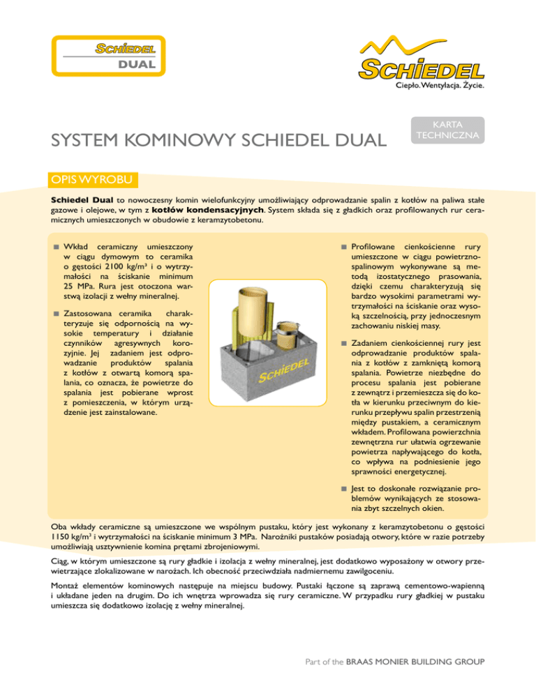 SYSTEM KOMINOWY SCHIEDEL DUAL KARTA TECHNICZNA OPIS WYROBU Schiedel Dual to nowoczesny komin wielofunkcyjny umożliwiający odprowadzanie spalin z kotłów na paliwa stałe gazowe i olejowe, w tym z kotłów kondensacyjnych. System składa się z gładkich oraz profilowanych rur ceramicznych umieszczonych w obudowie z keramzytobetonu. n Wkład ceramiczny umieszczony w ciągu dymowym to ceramika o gęstości 2100 kg/m³ i o wytrzymałości na ściskanie minimum 25 MPa. Rura jest otoczona warstwą izolacji z wełny mineralnej. n Zastosowana ceramika charakteryzuje się odpornością na wysokie temperatury i działanie czynników agresywnych korozyjnie. Jej zadaniem jest odprowadzanie produktów spalania z kotłów z otwartą komorą spalania, co oznacza, że powietrze do spalania jest pobierane wprost z pomieszczenia, w którym urządzenie jest zainstalowane. n Profilowane cienkościenne rury umieszczone w ciągu powietrznospalinowym wykonywane są metodą izostatycznego prasowania, dzięki czemu charakteryzują się bardzo wysokimi parametrami wytrzymałości na ściskanie oraz wysoką szczelnością, przy jednoczesnym zachowaniu niskiej masy. n Zadaniem cienkościennej rury jest odprowadzanie produktów spalania z kotłów z zamkniętą komorą spalania. Powietrze niezbędne do procesu spalania jest pobierane z zewnątrz i przemieszcza się do kotła w kierunku przeciwnym do kierunku przepływu spalin przestrzenią między pustakiem, a ceramicznym wkładem. Profilowana powierzchnia zewnętrzna rur ułatwia ogrzewanie powietrza napływającego do kotła, co wpływa na podniesienie jego sprawności energetycznej. n Jest to doskonałe rozwiązanie problemów wynikających ze stosowania zbyt szczelnych okien. Oba wkłady ceramiczne są umieszczone we wspólnym pustaku, który jest wykonany z keramzytobetonu o gęstości 1150 kg/m3 i wytrzymałości na ściskanie minimum 3 MPa. Narożniki pustaków posiadają otwory, które w razie potrzeby umożliwiają usztywnienie komina prętami zbrojeniowymi. Ciąg, w którym umieszczone są rury gładkie i izolacja z wełny mineralnej, jest dodatkowo wyposażony w otwory przewietrzające zlokalizowane w narożach. Ich obecność przeciwdziała nadmiernemu zawilgoceniu. Montaż elementów kominowych następuje na miejscu budowy. Pustaki łączone są zaprawą cementowo-wapienną i układane jeden na drugim. Do ich wnętrza wprowadza się rury ceramiczne. W przypadku rury gładkiej w pustaku umieszcza się dodatkowo izolację z wełny mineralnej. Part of the BRAAS MONIER BUILDING GROUP KARTA TECHNICZNA PRZEZNACZENIE, ZAKRES I WARUNKI STOSOWANIA Schiedel Dual to system kominowy przeznaczony do odprowadzania spalin z kotłów na paliwa stałe, gazowe i olejowe, w tym z kotłów kondensacyjnych. System kominowy Schiedel Dual klasyfikuje się zgodnie z: (ciąg dymowy) - EN 13063-1: T600 N1 D3 G100 T400 N1 D3 G50 - EN 13063-2: T400* N1 W2 O50 T200 N1 W2 O00 *- bez elementów elastomerowych (ciąg powietrzno-spalinowy) - EN 13063-2: T200 P1 W2 O00 T200 N1 W2 O00 - EN 13063-3: T200 P1 W2 O00 T200 N1 W2 O00 T600/T400/T200 N1/P1 D/W 2/3 G (xx)/O(xx) – klasa temperaturowa – klasa ciśnieniowa – klasa odporności na działanie kondensatu – klasa odporności na korozję – odporność (G) lub brak odporności (O) na pożar sadzy i odległość od elementów z materiałów łatwopalnych Dla ciągu powietrzno-spalinowego minimalna wysokość komina od przyłączenia ostatniego górnego kotła do wylotu komina wynosi 2 m. Maksymalne wysokości komina powyżej dachu ponad najwyższe boczne podparcie dla komina Schiedel Dual przedstawia tabela 1. wysokość komina ponad dach Wys. komina [m] obmurowany 12 cm obłożony łupkiem/blachą obłożony tynkiem 2 cm 0< H ≤8 1.75 0.90 1.30 8< H ≤ 20 1.70 0.65 0.95 Tabela 1. Przewody kominowe wykonuje się jako konstrukcje samonośne, oddzielone od elementów nośnych budynku. Szczegółowe warunki budowy komina znajdują się w jego instrukcji montażu. Zewnętrzna powierzchnia komina powinna być otynkowana tynkiem cementowo-wapiennym o grubości 2 cm. Part of the BRAAS MONIER BUILDING GROUP KARTA TECHNICZNA Oznakowanie zgodnie z normą EN-13063-1:2005+A1:2007 „Kominy – systemy kominowe z glinianymi / ceramicznymi kanałami spalinowymi. Część 1:Wymagania i metody badań odporności na pożar sadzy” i EN 13063-2:2005 Kominy – systemy kominowe z glinianymi / ceramicznymi kanałami spalinowymi. Część 2:Wymagania i metody badań w warunkach wilgotnych. (dla ciągu dymowego) 1085 Schiedel Sp. z o.o. ul. Wschodnia 24, PL 45-449 Opole 11 1085-CPR-0344 1085-CPR-0348 1085-CPR-0345 1085-CPR-0349 EN 13063-1:2005+A1:2007 EN 13063-2:2005+A1:2007 SCHIEDEL DUAL T600 N1 D3 G100 T400 N1 D 3 G50 T400* N1 W2 O50 T200 N1 W2 O00 Odporność ogniowa przy działaniu ognia od wewnątrz na zewnątrz............T600 G100, T400 G50 Szczelność...................................................................................... N1 Opory przepływu przez kanał wewnętrzny i kształtkę.....0,0015 m Opór przenikania ciepła..................... w zależności od średnicy Odporność na szoki termiczne................................................ N1 Wytrzymałość na ściskanie kanału wewnętrznego......≥ 10 MN/m2 Maksymalna wysokość kanału wewnętrznego..............≥ 50 kN Wytrzymałość na ściskanie materiałów łączących: - kit kwasoodporny...........................................................≥ M 10 - zaprawa montażowa.....................................................≥ M 2,5 Wytrzymałość na ściskanie obudowy zewnętrznej...........50 m Odporność na składniki chemiczne, korozję, szczelność, przecieki.................................................................... D3 Odporność na przemienne zamarzanie i odmarzanie.....odporny Odporność ogniowa....................................................................... NPD Odporność na szoki termiczne................... T400* O50,T20