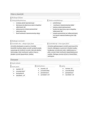Tekst w AutoCAD Rodzaje tekstu Tekst jednoliniowy Tekst wieloliniowy mniejszy obiekt (pamięciowo) wieloliniowy łatwiejszy do edycji przy użyciu skryptów, właściwości itd. możliwości zaawansowanej edycji większy obiekt (pamięciowo) jednoznaczna zmiana parametrów tylko jedna linia trudny do edycji przy użyciu skryptów, właściwości itd. brak możliwości zaawansowanej edycji zmiana parametrów we właściwościach, nie zawsze odzwierciedlana przez cały obiekt Rodzaje czcionek Czcionki shx – shape type font Czcionki ttf – true type font Czcionka zbudowana w oparciu o kształty AutoCAD, możliwa edycja czcionki, grubośd pisaka używanego do kreślenia czcionki, taka jak obiektu tekstowego. Brak możliwości wyboru kroju w obrębie czcionki (pogrubione, italika). Czcionka wykorzystująca czcionki systemowe firm trzecich, (dostępne w systemie). Grubośd pisaka kreślącego czcionka jest stała i zdefiniowana w pliku czcionki. Brak możliwości edycji/dodawania znaków. Obsługa czcionek ttf jest w AutoCADzie wolniejsza. Ćwiczenie Style tekstu num_pom rozmiar: 15 czcionka:Arial pochylenie:0 szerokośd: 1.0 budowlane opisy rozmiar: 15 rozmiar: 15 czcionka:Arial czcionka:Arial pochylenie:0 pochylenie:0 szerokośd: 1.0 szerokośd: 1.0