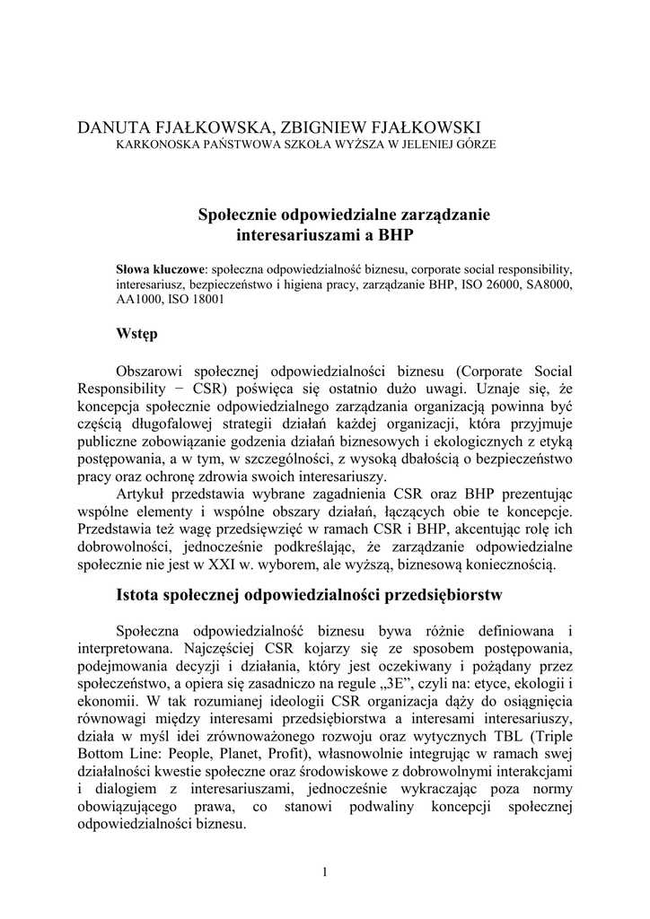 DANUTA FJAŁKOWSKA, ZBIGNIEW FJAŁKOWSKI KARKONOSKA PAŃSTWOWA SZKOŁA WYŻSZA W JELENIEJ GÓRZE Społecznie odpowiedzialne zarządzanie interesariuszami a BHP Słowa kluczowe: społeczna odpowiedzialność biznesu, corporate social responsibility, interesariusz, bezpieczeństwo i higiena pracy, zarządzanie BHP, ISO 26000, SA8000, AA1000, ISO 18001 Wstęp Obszarowi społecznej odpowiedzialności biznesu (Corporate Social Responsibility − CSR) poświęca się ostatnio dużo uwagi. Uznaje się, że koncepcja społecznie odpowiedzialnego zarządzania organizacją powinna być częścią długofalowej strategii działań każdej organizacji, która przyjmuje publiczne zobowiązanie godzenia działań biznesowych i ekologicznych z etyką postępowania, a w tym, w szczególności, z wysoką dbałością o bezpieczeństwo pracy oraz ochronę zdrowia swoich interesariuszy. Artykuł przedstawia wybrane zagadnienia CSR oraz BHP prezentując wspólne elementy i wspólne obszary działań, łączących obie te koncepcje. Przedstawia też wagę przedsięwzięć w ramach CSR i BHP, akcentując rolę ich dobrowolności, jednocześnie podkreślając, że zarządzanie odpowiedzialne społecznie nie jest w XXI w. wyborem, ale wyższą, biznesową koniecznością. Istota społecznej odpowiedzialności przedsiębiorstw Społeczna odpowiedzialność biznesu bywa różnie definiowana i interpretowana. Najczęściej CSR kojarzy się ze sposobem postępowania, podejmowania decyzji i działania, który jest oczekiwany i pożądany przez społeczeństwo, a opiera się zasadniczo na regule „3E”, czyli na: etyce, ekologii i ekonomii. W tak rozumianej ideologii CSR organizacja dąży do osiągnięcia równowagi między interesami przedsiębiorstwa a interesami interesariuszy, działa w myśl idei zrównoważonego rozwoju oraz wytycznych TBL (Triple Bottom Line: People, Planet, Profit), własnowolnie integrując w ramach swej działalności kwestie społeczne oraz środowiskowe z dobrowolnymi interakcjami i dialogiem z interesariuszami, jednocześnie wykraczając poza normy obowiązującego prawa, co stanowi podwaliny koncepcji społecznej odpowiedzialności biznesu. 1 Zamiar jednoznacznego zdefiniowania CSR jest bardzo trudny, gdyż, jak ujął to J. Gustafson „…nie ma jednego rozmiaru CSR, który pasuje wszystkim” [13]. W różnych krajach, będą to inne priorytety i wartości, które będą kształtować działania firmy deklarującej swą społeczną wrażliwość. A i nawet w jednym kraju czy w jednej organizacji – determinanty tych działań zmieniają się i w czasie oraz w gospodarczej i personalnej przestrzeni. Analizy różnorodności definicyjnej pojęcia CSR podjął się w 2006 roku, w jednej ze swych prac, A. Dalhsrud, zestawiając ze sobą 37 definicji. Jego analiza wyłania cechy wspólne poszczególnych definicji. Okazuje się, że większość z nich ujmuje następujące elementy: aspekt środowiskowy, społeczny i ekonomiczny, potrzebę angażowania interesariuszy i prowadzenia z nimi dialogu oraz dobrowolność inicjatyw CSR podejmowanych przez biznes [1]. Nie ma zatem jednej dobrej definicji CSR – ale termin ten scala koncepcje globalnego obywatelstwa i odnosi się do bieżącego zaangażowania się biznesu na rzecz etycznego postępowania oraz do przyczyniania się do rozwoju ekonomicznego przy jednoczesnym demonstrowaniu szacunku dla ludzi podnoszeniu jakości życia ich i ich rodzin, społeczności lokalnych, narodów i środowiska i społeczeństwa jako całości. Z powyższym bardzo dobrze koresponduje opis odpowiedzialnego biznesu dokonany przez Komisję Europejską w dokumencie Zielona Księga (Green Paper), wg której CSR, to „…koncepcja, według której przedsiębiorstwa dobrowolnie decydują się przyczyniać do poprawy życia społeczeństwa oraz czystości środowiska poprzez stosowanie otwartych i przejrzystych praktyk gospodarczych, opartych na przestrzeganiu zasad etycznych i współpracy ze wszystkimi interesariuszami” [10]. Działanie w sposób odpowiedzialny społecznie nie jest już dzisiaj menedżerskim wyborem. Stało się wymaganiem społeczeństw na całym świecie. Powody nadania CSR tak dużej biznesowej oraz naukowej rangi to, m.in.: 1. Szybkie zmiany zachodzące w rzeczywistości społeczno-gospodarczej: − upadek komunizmu i wycofywanie się rządów z prowadzenia przedsiębiorstw; zmiana form własności, − poszukiwania moralnych źródeł kapitalizmu oraz dyskusje nad jego etycznym statusem, − wywieranie na firmy prywatne coraz większej presji by zaczęły odgrywać znacznie większą niż dotychczas rolę w tworzeniu warunków dla „lepszego życia na świecie”, − respektowanie słuszności twierdzenia, że skoro społeczeństwo ustanawia w ostateczności zasady funkcjonowania biznesu, to w sytuacji stwierdzenia ich nieadekwatności do oczekiwań społeczeństwa, mogą one (a nawet muszą) zostać zmienione (zasada prawowitości), − respektowanie zasady, że nawet jeśli biznes nie jest odpowiedzialny za rozwiązywanie wszystkich społecznych kwestii, to każde 2 przedsiębiorstwo jest odpowiedzialne za te problemy, które samo spowodowało lub wywołało [34]. 2. Pogarszający się wizerunek biznesu w oczach opinii społecznej; seria spektakularnych afer gospodarczych nagłośnionych przez media i nasilanie się zainteresowania klientów praktykami zarządzania, które związane jest ze społecznymi problemami wynikających z nadużycia władzy przez zarządy firm. 3. Wzrost świadomości konsumentów i siły organizacji ich reprezentujących; wzrost znaczenia organizacji związkowych. 4. Częste zmiany przepisów prawnych dotyczących prowadzenia działalności gospodarczej i tzw. okołobiznesowej; zmiany w sposobie konkurowania oraz wzrost drapieżnej i nieetycznej konkurencji. 5. Demokratyzacja życia politycznego, gospodarczego i społecznego; rozwój społeczeństwa obywatelskiego; nacisk na etyczne prowadzenie działalnoś