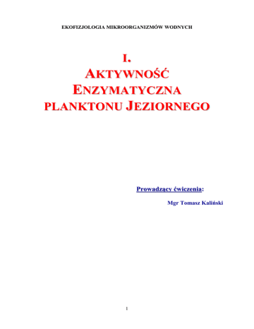 EKOFIZJOLOGIA MIKROORGANIZMÓW WODNYCH I. AKTYWNOŚĆ ENZYMATYCZNA PLANKTONU JEZIORNEGO Prowadzący ćwiczenia: Mgr Tomasz Kaliński 1 Aktywność enzymatyczna mikroplanktonu Uwagi ogólne Aktywność ektoenzymów (m. inn. fosfatazy alkalicznej, aminopeptydazy, β- i α-glukozydazy, N-acetylo-glukozaminazy), enzymów pozakomórkowych (extracellular enzymes) oraz niektórych enzymów wewnątrzkomórkowych (m. inn. esterazy i ureazy) jest, obok szybkości produkcji pierwotnej i wtórnej oraz tempa respiracji, jednym z podstawowych parametrów charakteryzujących aktywność metaboliczną mikroplanktonu. Eksperymentalne określenie aktywności enzymu w wodzie polega na dodaniu do badanej próbki jednego ze standardowych substratów enzymatycznych i pomiarze tempa przyrostu w niej stężenia barwnego lub fluoryzującego produktu reakcji uwalnianego przez badany enzym. Jednakże ze względu na dużą zmienność fizykochemicznych i biologicznych naturalnych środowisk wodnych, ilości i jakości enzymów wytwarzanych przez mikroorganizmy wodne, a także na nie zawsze określone podobieństwo substratu standardowego do substratów naturalnych pomiar rzeczywistej aktywności określonego enzymu in situ jest niezwykle trudny a czasem wręcz niewykonalny. Dlatego też w badaniach ekofizjologicznych rutynowo określa się przede wszystkim tzw. potencjalną aktywność maksymalną enzymu (V max). Wartość ta charakteryzuje maksymalną aktywność enzymu w badanej próbce wody w określonych warunkach pomiaru i przy całkowitym wysyceniu substratem dodanym do badanej próbki centrum aktywnych enzymu. 2 Stężenie substratu wysycające badany enzym w badanej próbce wody jest zwykle nieznane. Jego doświadczalne wyznaczenie, a oszacowanie, jest warunkiem koniecznym dla ustalenia przynajmniej prawidłowych warunków pomiaru Vmax. Zarówno ilość i jakość enzymu jak również pula jego naturalnych substratów podlegają w środowiskach wodnych ciągłym i dynamicznym zmianom. Dlatego też stężenie substratu konieczne do wysycenia badanego enzymu w próbkach pobranych z różnych środowisk rzadko bywa podobne. W krańcowych przypadkach, może wahać się ono nawet o rząd wielkości. W praktyce więc zbyt mała (niewysycająca) ilość substratu dodanego do badanych próbek przed pomiarem zaniża w sposób istotny wartość V max, zaś duży jego nadmiar może czasami znacząco hamować aktywność niektórych enzymów. Dokładne doświadczalne wyznaczenie stężenia standardowego substratu wysycającego badany enzym umożliwia procedura opisana w rozdziale “Kinetyka reakcji enzymatycznej”. Na potrzeby ćwiczeń aktywność badanych enzymów zewnątrzkomórkowych zostanie zmierzona w dwóch frakcjach: frakcji < 3.0 µm – zawierającej głównie aktywność związaną z bakteriami swobodnie pływającymi i autotroficznym pikoplanktonem oraz frakcji całkowitej – zawierającą także aktywność większych organizmów planktonowych i bakterii osiadłych. W celu określenia aktywności we frakcji > 3 µm należy od Vmax enzymu zmierzonego we frakcji całkowitej odjąć Vmax enzymu zmierzonego we frakcji < 3.0 µm. W celu uzyskania frakcji < 3.0 µm należy przesączyć 50 ml próby przez filtr poliwęglanowy o średnicy porów 3.0 µm. 3 Kinetyka reakcji enzymatycznej Uwagi ogólne Zasada pomiaru Szybkość rozkładu enzymatycznego substratów przez większość enzymów hydrolitycznych (np. fosfatazy, aminopeptydazy, itp.) opisuje równanie Michaelis’a-Menten: Vmax x [S] V= Km + [S] Zależność opisaną wzorem obrazuje wykres przedstawiony na Rys. 1. Vmax v (nmol/L/godz) 60 50 1/2 Vmax 40 30 20 Km 10 0 0 50 100 150 200 250 [s] (µmol/L) Rys. 1. Zależność szybkości reakcji enzymatycznej od stężenia substratu. 4 v= szybkość reakcji Vmax = szybkość maksymalna reakcji zachodząca, kiedy wszystkie centra aktywne enzymu zostały wysycone substratem. V max zależy of ilości i aktywności enzymu w badanych próbkach. Km = stężenie substratu, przy którym zachodzi połowiczna szybkość maksymalna reakcji (1/2 Vmax). Km charakteryzuje powinowactwo enzymu do substratu (im mniejsza wartość tym większe powinowactwo). Km nie zależy od ilości badanego enzymu w próbce; na jego wartość może wpływać szereg warunków fizykochemicznych środowiska reakcji enzymatycznej (np. obecność stymulatorów i/lub inhibitorów enzymu) [S] = stężenie substratu enzymatycznego Parametry charakteryzujące powyższe równanie wylicza się na podstawie określonej eksperymentalnie zależności szybkości reakcji enzymatycznej (v) od stężenia substratu [S] dodanego do badanych próbek. 5 Aktywność L-Leucyno-Aminopeptydazy (AMP) Zasada oznaczania Aktywność L-leucyno-aminopeptydazy może zostać określona z wykorzystaniem sztucznego substratu L-leucyny-7-amido-4-metylkumaryny (LAMK), którego hydroliza przez aminopeptydazę prowadzi do uwolnienia silnie fluorescencyjnego rodnika 7-amino-metylkumaryny (AMK). Fluorescencję mierzy się przy ekscytacji 380 nm i emisji 440 nm. L-leucyno- aminopeptydaza LAMK L-leucyna + 7-amino-metylkumaryna (silnie fluorescencyjna) Odczynniki 1. Substrat: L-Leucyna-7-amido-4-metylkumaryna (LAMK; m.cz. 324.8) 2. Produkt reakcji: 7-amino-metylkumaryna (AMK; m.cz. 175.2) 3. Etanol 95% (m.cz. 46.0) Przygotowanie odczynników i roztworów Standard 10 nM AMK Rozpuścić 17.52 mg AMK w 10 ml alkoholu etylowego. Roztwór substratu LAMK Odważyć 16.240 mg L-leucyno-7-amido-4-metylkumaryny i w kolbce 25 ml rozpuścić w alkoholu etylowym i dopełnić do kreski. 1 ml tak przyrządzonego roztworu zawiera 2 µM substratu. Po dodaniu 0.1ml tego roztworu do 3.9 ml próbki finalna koncentracja będzie 50 µM. 6 Oznaczenie Kalibracja Roztwory kalibracyjne sporządza się dodając do 3.9 ml wody destylowanej 0.1 ml odpowiedniego stężenia AMK etanolu tak aby ostatecznie uzyskać stężenia 0.5, 1.0, 2.5, 5, 10, 20, 50, 100, 200 nM. Roztwór wyjściowy 2 mM. Próbki wody Należy 