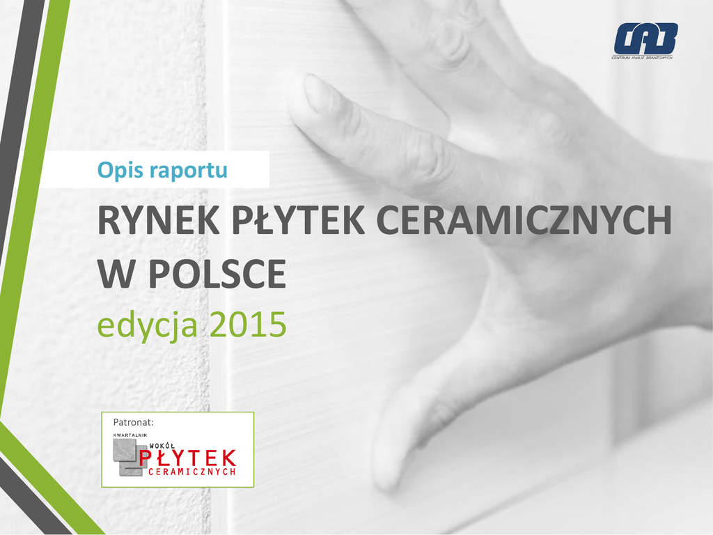 Opis raportu RYNEK PŁYTEK CERAMICZNYCH W POLSCE edycja 2015 Patronat: 1.1. Produkcja płytek ceramicznych w Unii Europejskiej Wstęp Raport "Rynek płytek ceramicznych w Polsce edycja 2015" to opracowanie Centrum Analiz Branżowych skierowane do producentów, importerów oraz dystrybutorów płytek ceramicznych w Polsce. Raport składa się z sześciu rozdziałów, w których zaprezentowano najważniejsze aspekty opisujące rynek ceramiki: W pierwszym rozdziale przedstawiono pozycję polskiej branży płytek ceramicznych na tle innych krajów UE. W kolejnym rozdziale zaprezentowane zostały najnowsze wyniki produkcji płytek ceramicznych w Polsce. Poza danymi nt. wartości oraz ilości wyprodukowanych płytek, przedstawiono także wyniki wiodących producentów. W trzecim rozdziale opisana została aktywność eksportowa polskich producentów. Przedstawiono tu dane dotyczące wielkości oraz głównych kierunkach eksportu płytek z Polski. Rozdział czwarty poświęcony został aktywności zagranicznych dostawców płytek w Polsce. Zaprezentowano wyniki nt. wielkości importu w ostatnich latach, w tym zmiany wielkości importu z głównych krajów. W kolejnym rozdziale zaprezentowano dane nt. sprzedaży płytek ceramicznych w Polsce, w tym w podziale na sprzedaż producentów krajowych oraz zagranicznych dostawców. Raport kończy się prognozą sprzedaży płytek przez polskich producentów w 2015 roku. 2 Spis treści Definicja rynku, metodologia Streszczenie 1. Polska branża płytek ceramicznych na tle Unii Europejskiej 4 6 9 1.1. Produkcja płytek ceramicznych w Unii Europejskiej 1.2. Najwięksi producenci płytek ceramicznych w Unii Europejskiej 2. Produkcja płytek ceramicznych w Polsce 13 2.1. Charakterystyka polskiej branży płytek ceramicznych 2.2. Wartość produkcji płytek ceramicznych w Polsce 2.3. Wiodący producenci płytek ceramicznych w Polsce 2.4. Wielkość oraz struktura produkcji płytek ceramicznych w Polsce 3. Eksport płytek ceramicznych 3.1. Polscy eksporterzy na tle pozostałych krajów UE 21 3.2. Wartość eksportu płytek ceramicznych z Polski 3.3. Wielkość oraz struktura eksportu płytek ceramicznych z Polski 3.4. Główne kierunki eksportu płytek ceramicznych z Polski 4. Import płytek ceramicznych 30 4.1. Wartość importu płytek ceramicznych 4.2. Wielkość oraz struktura importu płytek ceramicznych 4.3. Import płytek ceramicznych według kraju pochodzenia 5. Sprzedaż płytek ceramicznych w Polsce 5.1. Wartość sprzedaży płytek ceramicznych w Polsce 5.2. Wielkość sprzedaży płytek ceramicznych w Polsce 5.3. Struktura sprzedaży płytek ceramicznych w Polsce wg kraju pochodzenia 5.4. Ceny płytek ceramicznych w Polsce 6. Prognoza sprzedaży płytek ceramicznych w Polsce w 2015 roku 37 42 3 Spis tabel i wykresów 1/2 Wielkość oraz dynamika produkcji płytek ceramicznych w UE w latach 2008-2013 (w mld euro) Wartość produkcji płytek ceramicznych wiodących krajów UE w 2013 roku (w mln euro) Procentowy udział wiodących krajów w wartości produkcji płytek ceramicznych w UE w roku 2009 oraz 2013 Wartość produkcji płytek ceramicznych w Polsce w latach 2004-2014 (w mln euro) Wartość produkcji płytek ceramicznych w Polsce w latach 2012-2014 (w mld PLN) Przychody ze sprzedaży wiodących producentów płytek ceramicznych w Polsce w latach 2011-2014 (w mln zł) Szacunkowe przychody ze sprzedaży płytek ceramicznych wiodących producentów w Polsce w 2014 roku (w mln zł) Wielkość oraz dynamika produkcji sprzedanej płytek ceramicznych w Polsce w latach 2010-2014 (w mln m²) Różnica między produkcją wytworzoną i sprzedaną w Polsce w 2013 r. (w mln m²) Wielkość produkcji sprzedanej płytek ceramicznych w Polsce w latach 2011-2014 ze względu na pokrycie (w mln m²) Struktura produkcji sprzedanej płytek ceramicznych w Polsce w latach 2012-2014 ze względu na pokrycie (w mln m²) Najwięksi eksporterzy płytek ceramicznych w UE w 2014 roku (w mln euro) Wartość eksportu płytek ceramicznych z Polski w latach 2004-2014 (w mln euro) Wielkość oraz dynamika eksportu płytek ceramicznych z Polski w latach 2010-2014 (w mln m²) Wielkość eksportu płytek ceramicznych z Polski w latach 2010-2014 w podziale na pokrycie (w mln m²) Struktura eksportu płytek ceramicznych z Polski w latach 2010-2014 Udział eksportu w wielkości produkcji sprzedanej płytek ceramicznych w Polsce w latach 2012-2014 Wartość eksportu płytek ceramicznych z Polski do największych odbiorców w latach 2012-2014 (w mln euro Wielkość eksportu płytek ceramicznych z Polski do największych odbiorców w latach 2012-2014 (w mln m²) Wielkość eksportu płytek szkliwionych z Polski do największych odbiorców w latach 2012-2014 (w mln m²) Wielkość eksportu płytek nieszkliwionych z Polski do największych odbiorców w latach 2012-2014 (w mln m²) 4 Spis tabel i wykresów 2/2 Wartość importu płytek ceramicznych do Polski w latach 2004-2014 (w mln euro) Wielkość oraz dynamika importu płytek ceramicznych w latach 2010-2014 (w mln m²) Wielkość importu płytek ceramicznych do Polski w latach 2010-2014 w podziale na pokrycie (w mln m²) Struktura importu płytek ceramicznych do Polski w latach 2010-2014 Wartość importu płytek ceramicznych do Polski według kraju pochodzenia w latach 2012-2014 (w mln euro) Wielkość importu płytek ceramicznych do Polski według kraju pochodzenia w latach 2012-2014 (w mln m²) Wielkość importu płytek szkliwionych do Polski wg kraju pochodzenia w latach 2012-2014 (w mln m²) Wielkość importu płytek nieszkliwionych do Polski wg kraju pochodzenia w latach 2012-2014 (w mln m²) Szacunkowa wartość sprzedaży płytek ceramicznych w Polsce w latach 2004-2014 (w mln euro) Szacunkowa wielkość sprzedaży płytek ceramicznych w Polsce w latach 2010-2014 (w mln m²) Struktura sprzedaży płytek ceramicznych w Polsce w latach 2011-2014 wg kraju pochodzenia (w %) Struktura sprzedaży płytek ceramicznych w Polsce w lat