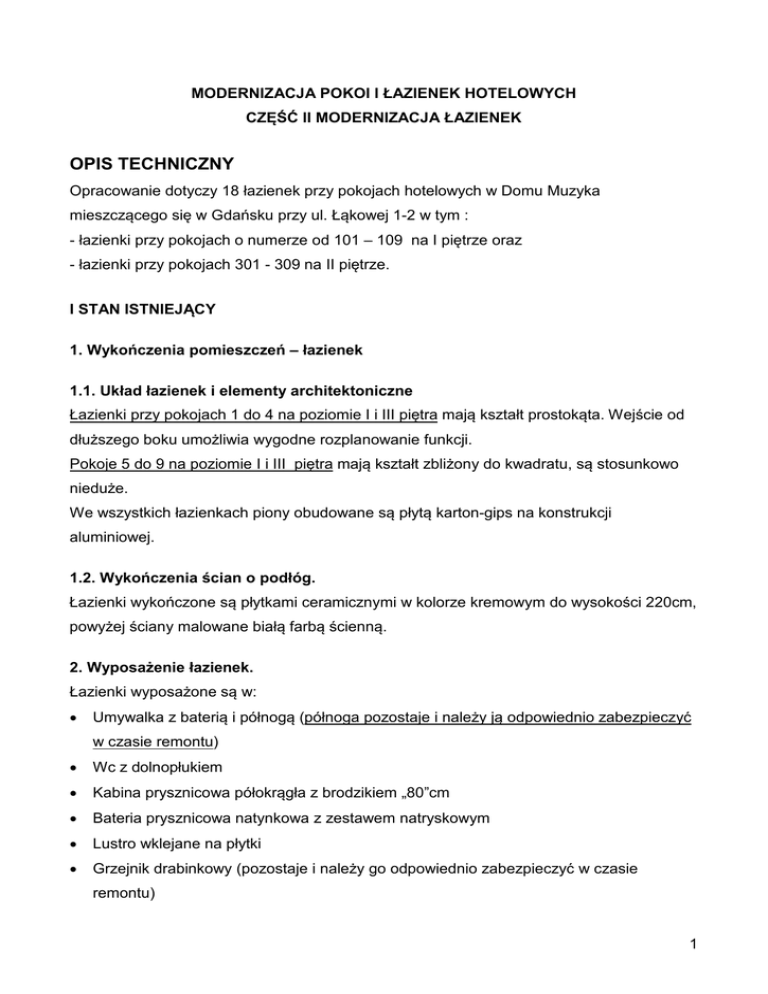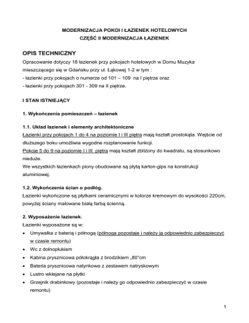 MODERNIZACJA POKOI I ŁAZIENEK HOTELOWYCH CZĘŚĆ II MODERNIZACJA ŁAZIENEK OPIS TECHNICZNY Opracowanie dotyczy 18 łazienek przy pokojach hotelowych w Domu Muzyka mieszczącego się w Gdańsku przy ul. Łąkowej 1-2 w tym : - łazienki przy pokojach o numerze od 101 – 109 na I piętrze oraz - łazienki przy pokojach 301 - 309 na II piętrze. I STAN ISTNIEJĄCY 1. Wykończenia pomieszczeń – łazienek 1.1. Układ łazienek i elementy architektoniczne Łazienki przy pokojach 1 do 4 na poziomie I i III piętra mają kształt prostokąta. Wejście od dłuższego boku umożliwia wygodne rozplanowanie funkcji. Pokoje 5 do 9 na poziomie I i III piętra mają kształt zbliżony do kwadratu, są stosunkowo nieduże. We wszystkich łazienkach piony obudowane są płytą karton-gips na konstrukcji aluminiowej. 1.2. Wykończenia ścian o podłóg. Łazienki wykończone są płytkami ceramicznymi w kolorze kremowym do wysokości 220cm, powyżej ściany malowane białą farbą ścienną. 2. Wyposażenie łazienek. Łazienki wyposażone są w: • Umywalka z baterią i półnogą (półnoga pozostaje i należy ją odpowiednio zabezpieczyć w czasie remontu) • Wc z dolnopłukiem • Kabina prysznicowa półokrągła z brodzikiem „80”cm • Bateria prysznicowa natynkowa z zestawem natryskowym • Lustro wklejane na płytki • Grzejnik drabinkowy (pozostaje i należy go odpowiednio zabezpieczyć w czasie remontu) 1 • Półki i wieszaki na ręczniki • Suszarka do włosów II STAN PROJEKTOWY 1. Wykończenie łazienek. 1.1. Łazienki 1 do 4 Ściany – po usunięciu istniejących płytek ściany należy wyrównać. Podłogę, ściany w kabinie prysznicowej i pas ścian przy podłodze wysokości 20 cm wyizolowane folią w płynie. Ściany i podłogę wyłożone płytką gresową Domino Grande w kolorze beżu i brązu zgodnie z projektami poszczególnych łazienek. Fugi Mapei KERACOLOR SF (lub innej odpornej na zabrudzenia) w kolorze płytek i szerokości 1,5 mm. Narożniki wypukłe wykończone listwą narożną ze stali nierdzewnej polerowanej. Ściany powyżej poziomu płytek malowane farbą akrylowa matową ścienną odporną na szorowanie firmy Decoral w kolorze białym. Sufit malowany na kolor biały. Elektryka : Układ punktów elektrycznych – zmiana w lokalizacji kinkietu, gniazdek wtykowych i suszarki zgodnie z rysunkami „rozmieszczenie punktów elektrycznych”. Osprzęt elektryczny firmy Kos Vena w kolorze kości słoniowej /krem. Oprawy oświetleniowe – we wszystkich łazienkach kinkiety zostaną zastąpione oprawą łazienkową Italux MARCO MB4801-2A. Plafony na suficie pozostają bez zmian i na czas remontu należy je zdemontować i zabezpieczyć. Ogrzewanie: Istniejące grzejniki drabinkowe pozostają w obecnej lokalizacji. Drzwi : Drzwi do łazienek pozostają i zostaną przemalowane farbą akrylową, wykończenie satyna: - od strony pokoi na kolor taki sam jak kolor ścian w danym pokoju - od strony łazienki na kolor biały. 2 1.2. Łazienki 5-9 Ściany – po usunięciu istniejących płytek ściany należy wyrównać. Podłogę, ściany w kabinie prysznicowej i pas ścian przy podłodze wysokości 20 cm wyizolowane folią w płynie. Ściany i podłogę wyłożone płytką gresową Domino Grande w kolorze beżu i brązu zgodnie z projektem poszczególnych łazienek. Fugi Mapei KERACOLOR SF (lub innej odpornej na zabrudzenia) w kolorze płytek i szerokości 1,5 mm. Narożniki wypukłe wykończone listwą narożną ze stali nierdzewnej polerowanej. Ściany powyżej poziomu płytek malowane farbą akrylowa matową ścienną odporną na szorowanie firmy Decoral w kolorze białym. Sufit malowany na kolor biały. Elektryka : Układ punktów elektrycznych – zmiana w lokalizacji kinkietu, gniazdek wtykowych i suszarki zgodnie z rysunkami „rozmieszczenie punktów elektrycznych”. Osprzęt elektryczny firmy Kos Vena w kolorze kości słoniowej /krem. Oprawy oświetleniowe – w wszystkich łazienkach kinkiety zostaną zastąpione oprawą łazienkową Italux MARCO MB4801-2A. Plafony na suficie pozostają bez zmian i na czas remontu należy je zdemontować i zabezpieczyć. W łazienkach przy pokojach 106 i 306 na suficie nad kabiną prysznicową należy zastosować dodatkowe oświetlenie w postaci natynkowej oprawy led, bryzgoszczelnej o IP 44 – Qazqa Saygo o średnicy 14,5 cm http://www.lampyiswiatlo.pl/lampa-scienna-sufitowa-saygo-okragla-led.html. Ogrzewanie: Istniejące grzejniki drabinkowe pozostają, należy je tylko obniżyć o 30 cm w stosunku do obecnej lokalizacji. Drzwi : Drzwi do łazienek pozostają i zostaną przemalowane farbą akrylową, wykończenie satyna: - od strony pokoi na kolor taki sam jak kolor ścian w danym pokoju - od strony łazienki na kolor biały. 3 1.3. Zabudowy i przebudowy z płyty karton – gipsowej. W pokojach 5-9 z uwagi na zastosowania wucetowej spłuczki do zabudowy i prostokątnej kabiny prysznicowej konieczna jest nieznaczne powiększenie/ pomniejszenie obudów szachtów kominowych. Zabudowy te należy wykonać z wodoodpornej płyty karton-gips. 2. Wyposażenie. Łazienki 1-4 : 1. Brodzik Competia 80x100x14h Sched-Pol 2. Ściana boczna do kabiny prysznicowej- Kermi Atea, do montażu bez brodzika 103/200 cm Srebrny błyszczący Szkło przezroczyste z KermiClean 3. Syfon do brodzika bez dziurek 4. Bateria natryskowa HG Ecostat Comfort 5. Wąż natryskowy HG 160 cm 6. Słuchawka natryskowa HG Crometa 7. Umywalka asymetryczna Koło Style, zamontować do niej istniejącą półnogę 8. Syfon do umywalki 9. Bateria umywalkowa KFA Malachit 10. Miska wisząca - Koło Style 11. Deska WC Koło Style 12. Zestaw instalacyjny do WC Duofix H98 podtynkowy Geberit 13. Przycisk spłukujący do WC Geberit Kappa 21 do Stelaży Geberit UP 200–białosrebrny z możliwością spłukiwania małą i dużą ilością wody 14. Wspornik Duofix kpl Geberit 15. Zestaw do izolacji akustycznej muszli wiszącej 16. Lustro wklejane pod wymiar na ścianie między p