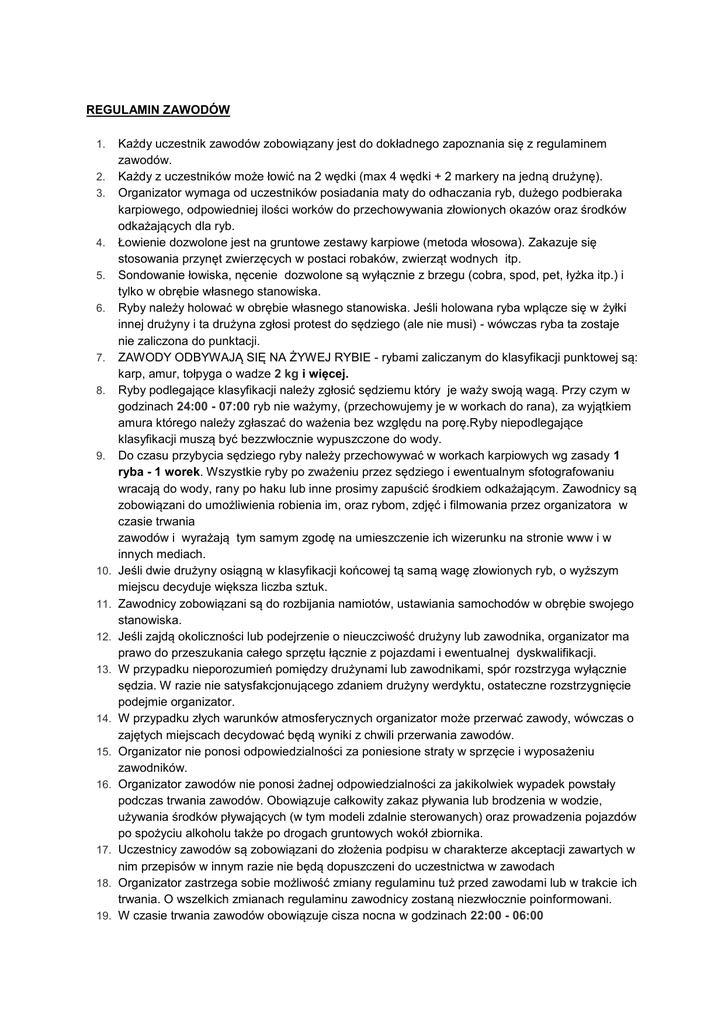 REGULAMIN ZAWODÓW 1. 2. 3. 4. 5. 6. 7. 8. 9. 10. 11. 12. 13. 14. 15. 16. 17. 18. 19. Każdy uczestnik zawodów zobowiązany jest do dokładnego zapoznania się z regulaminem zawodów. Każdy z uczestników może łowić na 2 wędki (max 4 wędki + 2 markery na jedną drużynę). Organizator wymaga od uczestników posiadania maty do odhaczania ryb, dużego podbieraka karpiowego, odpowiedniej ilości worków do przechowywania złowionych okazów oraz środków odkażających dla ryb. Łowienie dozwolone jest na gruntowe zestawy karpiowe (metoda włosowa). Zakazuje się stosowania przynęt zwierzęcych w postaci robaków, zwierząt wodnych itp. Sondowanie łowiska, nęcenie dozwolone są wyłącznie z brzegu (cobra, spod, pet, łyżka itp.) i tylko w obrębie własnego stanowiska. Ryby należy holować w obrębie własnego stanowiska. Jeśli holowana ryba wplącze się w żyłki innej drużyny i ta drużyna zgłosi protest do sędziego (ale nie musi) - wówczas ryba ta zostaje nie zaliczona do punktacji. ZAWODY ODBYWAJĄ SIĘ NA ŻYWEJ RYBIE - rybami zaliczanym do klasyfikacji punktowej są: karp, amur, tołpyga o wadze 2 kg i więcej. Ryby podlegające klasyfikacji należy zgłosić sędziemu który je waży swoją wagą. Przy czym w godzinach 24:00 - 07:00 ryb nie ważymy, (przechowujemy je w workach do rana), za wyjątkiem amura którego należy zgłaszać do ważenia bez względu na porę.Ryby niepodlegające klasyfikacji muszą być bezzwłocznie wypuszczone do wody. Do czasu przybycia sędziego ryby należy przechowywać w workach karpiowych wg zasady 1 ryba - 1 worek. Wszystkie ryby po zważeniu przez sędziego i ewentualnym sfotografowaniu wracają do wody, rany po haku lub inne prosimy zapuścić środkiem odkażającym. Zawodnicy są zobowiązani do umożliwienia robienia im, oraz rybom, zdjęć i filmowania przez organizatora w czasie trwania zawodów i wyrażają tym samym zgodę na umieszczenie ich wizerunku na stronie www i w innych mediach. Jeśli dwie drużyny osiągną w klasyfikacji końcowej tą samą wagę złowionych ryb, o wyższym miejscu decyduje większa liczba sztuk. Zawodnicy zobowiązani są do rozbijania namiotów, ustawiania samochodów w obrębie swojego stanowiska. Jeśli zajdą okoliczności lub podejrzenie o nieuczciwość drużyny lub zawodnika, organizator ma prawo do przeszukania całego sprzętu łącznie z pojazdami i ewentualnej dyskwalifikacji. W przypadku nieporozumień pomiędzy drużynami lub zawodnikami, spór rozstrzyga wyłącznie sędzia. W razie nie satysfakcjonującego zdaniem drużyny werdyktu, ostateczne rozstrzygnięcie podejmie organizator. W przypadku złych warunków atmosferycznych organizator może przerwać zawody, wówczas o zajętych miejscach decydować będą wyniki z chwili przerwania zawodów. Organizator nie ponosi odpowiedzialności za poniesione straty w sprzęcie i wyposażeniu zawodników. Organizator zawodów nie ponosi żadnej odpowiedzialności za jakikolwiek wypadek powstały podczas trwania zawodów. Obowiązuje całkowity zakaz pływania lub brodzenia w wodzie, używania środków pływających (w tym modeli zdalnie sterowanych) oraz prowadzenia pojazdów po spożyciu alkoholu także po drogach gruntowych wokół zbiornika. Uczestnicy zawodów są zobowiązani do złożenia podpisu w charakterze akceptacji zawartych w nim przepisów w innym razie nie będą dopuszczeni do uczestnictwa w zawodach Organizator zastrzega sobie możliwość zmiany regulaminu tuż przed zawodami lub w trakcie ich trwania. O wszelkich zmianach regulaminu zawodnicy zostaną niezwłocznie poinformowani. W czasie trwania zawodów obowiązuje cisza nocna w godzinach 22:00 - 06:00 20. Psy ras niebezpiecznych mają być w kagańcach i na uwięzi. 21. W przypadku nie przestrzegania regulaminu organizator ma prawo zdyskwalifikować zawodników. 22. Losowanie stanowisk - organizator przewiduje możliwość wyciągnięcia tylko jednego losu z numerem stanowiska. 23. W przypadkach nieprzewidzianych organizator zastrzega sobie możliwość korekty lokalizacji części stanowisk 24. Oprócz tego regulaminu, każdy zawodnik - uczestnik jest zobowiązany do przestrzegania regulaminu obowiązującego na łowisku. Zgłoszenie połowu: Oficjalnym dokumentem jest karta połowów, w której znajdują się regulamin zawodów oraz; * imię i nazwisko zawodnika, który złowił rybę, * nr stanowiska, * data i godzina ważenia, * waga połowu, * gatunek ryby, * podpis zawodnika i poświadczającego Pozostałe ustalenia. Zawody mają charakter towarzyski i wszystkich obowiązują zasady koleżeństwa i Fair play. Każda z drużyn po zakończeniu zawodów zobowiązana jest do dokładnego posprzątania stanowiska (w tym niedopałki papierosów), i dostarczenia worków w wyznaczone miejsce. Śmieci prosimy w miarę możliwości kompresować tak aby zajmowały jak najmniej miejsca, (opakowań szklanych nie tłuc).Spożycie nie jest całkowicie zabronione, prosimy jednak o umiar i kulturalne zachowanie w trakcie i po - szczególnie w trakcie. Pamiętajmy, oprócz ambicji sportowych które są niewątpliwie bardzo ważne, liczy się także dobra zabawa. Życzymy więc sukcesów w zawodach, a przede wszystkim wielu miłych wspomnień. Zapisani zawodnicy; 1. Piotr Stawarz i Zbigniew Kowalczyk 2. Piotr Niedźwiedź i Grzegorz Rączka 3. Paweł Krzyśko i Szpila Mateusz 4. Marek Wisz i Przemysław Jamuła 5. Jerzy Najchmann i partner 6. Dariusz Mysliwiec i Piotr Myśliwiec 7. Klaudiusz Dobrzewski i Piotr Walek 8. Paweł Porada i Przemysław Walczyk 9. Seweryn Lelek i Robert Kubicz 10. Robert Cisek i Aleksander Kazimierski 11. Konrad Sowa i Grzegorz Gąska 12. Krzysztof Chmiel i Grzegorz Grochowski 13. Andrzej Lis i Sławomir Kochman 14. Leszek Waloszyński i partner