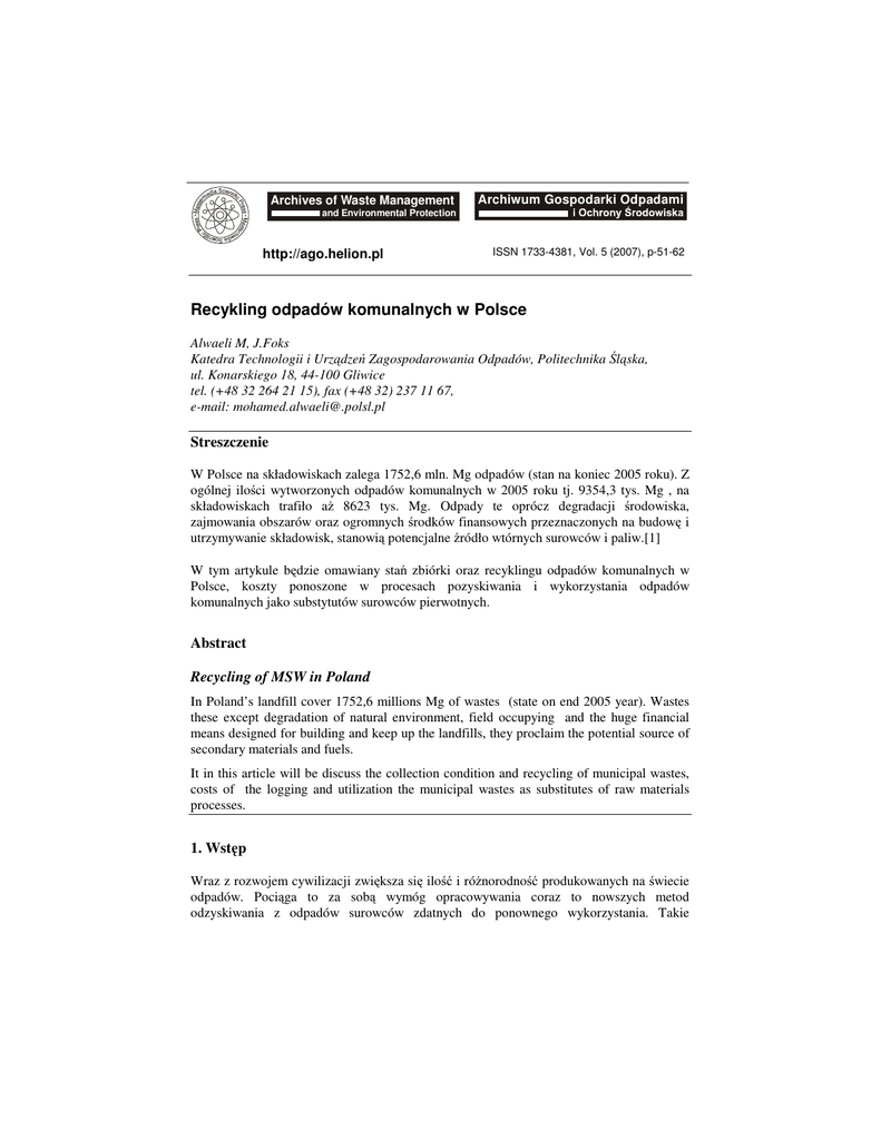 Archives of Waste Management Archiwum Gospodarki Odpadami and Environmental Protection http://ago.helion.pl ISSN 1733-4381, Vol. 5 (2007), p-51-62 Recykling odpadów komunalnych w Polsce Alwaeli M, J.Foks Katedra Technologii i Urządzeń Zagospodarowania Odpadów, Politechnika Śląska, ul. Konarskiego 18, 44-100 Gliwice tel. (+48 32 264 21 15), fax (+48 32) 237 11 67, e-mail: [email protected] Streszczenie W Polsce na składowiskach zalega 1752,6 mln. Mg odpadów (stan na koniec 2005 roku). Z ogólnej ilości wytworzonych odpadów komunalnych w 2005 roku tj. 9354,3 tys. Mg , na składowiskach trafiło aż 8623 tys. Mg. Odpady te oprócz degradacji środowiska, zajmowania obszarów oraz ogromnych środków finansowych przeznaczonych na budowę i utrzymywanie składowisk, stanowią potencjalne źródło wtórnych surowców i paliw.[1] W tym artykule będzie omawiany stań zbiórki oraz recyklingu odpadów komunalnych w Polsce, koszty ponoszone w procesach pozyskiwania i wykorzystania odpadów komunalnych jako substytutów surowców pierwotnych. Abstract Recycling of MSW in Poland In Poland’s landfill cover 1752,6 millions Mg of wastes (state on end 2005 year). Wastes these except degradation of natural environment, field occupying and the huge financial means designed for building and keep up the landfills, they proclaim the potential source of secondary materials and fuels. It in this article will be discuss the collection condition and recycling of municipal wastes, costs of the logging and utilization the municipal wastes as substitutes of raw materials processes. 1. Wstęp Wraz z rozwojem cywilizacji zwiększa się ilość i różnorodność produkowanych na świecie odpadów. Pociąga to za sobą wymóg opracowywania coraz to nowszych metod odzyskiwania z odpadów surowców zdatnych do ponownego wykorzystania. Takie 52 Archiwum Gospodarki Odpadami i Ochrony Środowiska, vol. 5(2007) składniki odpadów komunalnych jak makulatura, szkło, tworzywa sztuczne, metale czy tekstylia mogą być odzyskiwane i poddawane dalszej przeróbce, a następnie ponownie użyte. Racjonalna gospodarka odpadami komunalnymi stanowi jeden z najpoważniejszych problemów współczesnej cywilizacji. Zauważany w ostatnich latach rozwój gospodarczy oraz postęp techniczny spowodował, iż człowiek stał się największym producentem odpadów. Współczesny model cywilizacji charakteryzuje się wzrostem wykorzystania surowców pierwotnych w celu podnoszenia komfortu życia oraz systematycznym zwiększaniem produkcji. Wynikiem takich działań jest wzrost ilości wytwarzanych odpadów. Recykling obok redukcji u źródła, stanowi jedną z technik przeciwdziałania powstawaniu odpadów prowadzącą do ograniczenia strumienia odpadów skierowanych na składowiska oraz ich uciążliwości dla środowiska. Recyklingiem objęte są głównie: złom metali żelaznych i nieżelaznych, szkło, makulatura, tworzywa sztuczne, które w trakcie produkcji i użytkowania utraciły w całości lub częściowo właściwości surowców pierwotnych. Odpady te za pomocą odpowiednio dobranych procesów można wykorzystać jako substytuty surowców pierwotnych [2] Wzrastająca produkcja stałych odpadów komunalnych osiągnęła punkt w którym musi ulec zmianie polityki postępowania z odpadami przez, wprowadzenie programów minimalizacji odpadów. Minimalizacja, polegająca na redukcji u źródeł oraz recyklingu odpadów do ponownego użytkowania jak również do produkcji nowych wyrobów.[3-5] Recykling odpadów komunalnych jest globalnym problemem. Pod koniec XX i na początku XXI wieku stał się centrum zainteresowania wielu prac. Prace na temat recyklingu były prowadzone przez różnych autorów takich jak: (Charles R. Rhyner 1998), (Vinod K. Sharma, Pieter van Beukering , Barnali Nag 1994), (Giuseppe Di Vita 2006), (Brenton L. Fletcher, Michael E. Mackay 2005), (E. Hsu, C.-M. Kuo 2005) oraz (A. Haque, I.M. Mujtaba, J.N.B. Bell 2000). Autorzy prac analizowali różne modele mikroekonomiczne, które rozważały opłacalność ekonomiczną recyklingu odpadów komunalnych jak również sposoby zmniejszenia wartości aktualnej i przyszłych kosztów związanych z gospodarką odpadami.[611] 2. Zbiórka odpadów tworzywa sztuczne, makulatury, szkła oraz opakowania metalowe Składniki odpadów komunalnych jak makulatura, szkło, tworzywa sztuczne, metale mogą być selektywne zbierane i poddawane dalszej przeróbce, a następnie ponownie użyte. W ostatnich latach zaobserwowano wzrost selektywnej zbiorki odpadów w Polsce. Jak widać na poniższym wykresie (Rys.1.1) ilość zbieranych odpadów z tworzyw sztucznych wzrasta z każdym rokiem. W latach 2002-2005 wzrost ten wyniósł ok. 10 tys. Mg rocznie. Archiwum Gospodarki Odpadami i Ochrony Środowiska, vol. 1(2005) 53 41,3 2005 2004 31,3 2003 25 2002 17 2001 13 0 10 20 30 40 tys. Mg Rys. 1.1: Wyselekcjonowane tworzywa sztuczne w latach 2001-2005 [12-16] Pomimo, że zbieranie makulatury nie jest dla społeczeństwa już tak opłacalne jak kiedyś, to ilość ta wzrasta z każdym rokiem (Rys. 1.2). Ilość wyselekcjonowanej makulatury w latach 2001-2003 waha się w granicach 42-45 tys. Mg, natomiast w roku 2004 nastąpił wzrost aż o 21,7 tys. Mg, a w roku 2005 o 29,1 tys. Mg. 2005 95,8 66,7 2004 45 2003 2002 43 2001 42 0 20 40 60 80 100 tys. Mg Rys. 1.2: Wyselekcjonowana makulatura w latach 2001-2005 [12-16] 54 Archiwum Gospodarki Odpadami i Ochrony Środowiska, vol. 5(2007) Ilość zebranego szkła w roku 2001 wyniosła 86 tys. ton, po czym w roku 2002 nastąpił gwałtowny spadek do 48 tys. Mg W kolejnych latach liczba ta rosła, w roku 2003 o 12 tys. Mg, w 2004 o 13,4 tys. Mg, a w roku 2005 aż o 25,8 tys. Mg. 99,2 2005 73,4 2004 60 2003 48 2002 86 2001 0 20 40 60 80 100 tys. Mg Rys. 1.3: Wyselekcjonowane szkło w latach 2001-2005 [12-16] Najczęściej występującym metalem w odpadach komunalnych jest stop aluminium. Ze względu na małą masę wykorzystywany jest do p