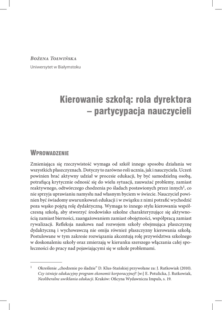 Bożena Tołwińska Uniwersytet w Białymstoku Kierowanie szkołą: rola dyrektora – partycypacja nauczycieli Wprowadzenie Zmieniająca się rzeczywistość wymaga od szkół innego sposobu działania we wszystkich płaszczyznach. Dotyczy to zarówno roli ucznia, jak i nauczyciela. Uczeń powinien brać aktywny udział w procesie edukacji, by być samodzielną osobą, potrafiącą krytycznie odnosić się do wielu sytuacji, zauważać problemy, zamiast reaktywnego, odtwórczego chodzenia po śladach postawionych przez innych1, co nie sprzyja uprawianiu namysłu nad własnym byciem w świecie. Nauczyciel powinien być świadomy uwarunkowań edukacji i w związku z nimi potrafić wychodzić poza wąsko pojętą rolę dydaktyczną. Wymaga to innego stylu kierowania współczesną szkołą, aby stworzyć środowisko szkolne charakteryzujące się aktywnością zamiast bierności, zaangażowaniem zamiast obojętności, współpracą zamiast rywalizacji. Refleksja naukowa nad rozwojem szkoły obejmująca płaszczyznę dydaktyczną i wychowawczą nie omija również płaszczyzny kierowania szkołą. Postulowane w tym zakresie rozwiązania akcentują rolę przywództwa szkolnego w doskonaleniu szkoły oraz zmierzają w kierunku szerszego włączania całej społeczności do pracy nad pojawiającymi się w szkole problemami. 1 Określenie „chodzenie po śladzie” D. Klus-Stańskiej przywołane za: J. Rutkowiak (2010). Czy istnieje edukacyjny program ekonomii korporacyjnej? [w:] E. Potulicka, J. Rutkowiak, Neoliberalne uwikłania edukacji. Kraków: Oficyna Wydawnicza Impuls, s. 19. 106 Bożena Tołwińska Celem artykułu jest ukazanie nowego podejścia do kierowania szkołą, którego istotą jest dzielenie się przywództwem, partycypacja nauczycieli, jako odpowiedzi na problemy wynikające ze współczesnej kultury. Rzeczywista partycypacja nauczycieli, nie pozorna czy jedynie formalna lub incydentalna, byłaby szansą na rozwiązywanie trudnych problemów szkoły. Czy jednak obie strony relacji są na to przygotowane? W artykule przedstawię wybrane bariery partycypacji wynikające z podzielanych przekonań dotyczących roli dyrektora, a także zewnętrznych czynników związanych z charakterem obecnej polityki oświatowej. Formy partycypacji Trend ten jest zbieżny z tym, co dzieje się również w innych organizacjach, poza edukacją. Cechą współczesnego zarządzania organizacjami jest zwiększanie stopnia włączania pracowników w życie organizacji. W literaturze przedmiotu używa się również terminów „partycypacja” i „delegowanie uprawnień”. Za terminami tymi kryje się proces angażowania pracowników w podejmowanie decyzji, zwiększania przepływu informacji pomiędzy kierownictwem a pracownikami, co sprzyja lepszemu wykorzystaniu umiejętności pracowników, a także ich rozwijaniu poprzez zmienność zadań. Korzystnie wpływa to również na zwiększanie satysfakcji z wykonywanej pracy, poprzez stwarzanie okazji do udziału w podejmowaniu decyzji, które będą miały wpływ na życie pracownika (Armstrong, 2001, s. 637). Inne formy partycypacji to między innymi informowanie o planach kierownictwa, a jeszcze szerszy zakres to przyzwalanie na to, aby pracownicy brali udział w opracowywaniu planów, oddolne rozwiązywanie problemów pozwalające wykorzystywać wiedzę i opinie pracowników, uwzględnianie propozycji zmian wysuwanych oddolnie (tamże). Udział pracowników w procesie kierowania organizacją może mieć różny poziom – od zupełnego jego braku i wyłącznego decydowania przez kierownictwo do pełnego udziału, kiedy to pracownicy podejmują samodzielne decyzje. Te skrajne formy raczej nie występują w praktyce. Istnieją natomiast formy pośrednie, które zależą od postaw, zaangażowania, a także umiejętności obu stron – pracowników i kierownictwa. Pracownicy mogą być jedynie informowani o podjętych decyzjach, decyzje mogą być z nimi konsultowane lub kierownictwo organizacji może praktykować wspólne podejmowanie decyzji przez obie strony (tamże, s. 640). Jest to proces, który od obu stron relacji, zarówno od kierownika, jak i od pracownika, wymaga określonego nastawienia. Kierownik powinien być gotowy do podzielenia się uprawnieniami kierowniczymi m.in. prawem do podejmowania decyzji. Poza tym musi być przekonany i okazywać to, że włączanie pracowników w kierowanie stanowi dla niego wartość w pracy kierowniczej. Od pracowników wymaga to natomiast większego zaangażowania w życie organizacji. Kierowanie szkołą: rola dyrektora – partycypacja nauczycieli 107 Partycypacja nauczycieli w kierowaniu szkołą Jeszcze szerzej patrzą na proces partycypacji A. Hargreaves i D. Fink (zob. Michalak, 2010a, s. 75). Autorzy ci uważają, że delegowanie uprawnień, zadań i obowiązków na rzecz nauczycieli nie jest wystarczające, lecz w szkole powinna się odbywać „dystrybucja przywództwa”. Oznacza to, przyjmowanie tej roli nie tylko przez dyrektora, ale również przez nauczycieli. Pociąga to za sobą rozwój każdego z nich, zaangażowanie i odpowiedzialność. Szczególnie warta podkreślenia jest zmiana przekonań – od przekonania o jednoosobowej odpowiedzialności dyrektora do przekonania, że „razem mogą więcej” (tamże). Wielu badaczy procesów kierowania współczesną szkołą podkreśla konieczność wprowadzenia nowego paradygmatu. Jak twierdzi M. Coleman (1994, s. 147), należy dążyć do tego, aby kierowanie placówką oświatową było bardziej kolegialne, czyli z udziałem nauczycieli w większym zakresie. Zadania kierownicze powinny być rozmieszczone w całej strukturze organizacyjnej szkoły i sprzyjać samodzielnemu podejmowaniu działań przez nauczycieli. Ich większy udział w procesie kierowania może sprzyjać widzeniu spraw szkoły szerzej, myśleniu o jej powodzeniu całościowo, a nie tylko o sprawach, które dotyczą wyłącznie własnej praktyki za drzwiami klasy. Szkoła moż