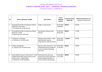 WYKAZ PRZYZNANYCH DOTACJI OTWARTY KONKURS OFERT 2015 – OCHRONA I PROMOCJA ZDROWIA (rozdysponowano: 12.000,00 zł) L.p. Nazwa organizacji, siedziba Tytuł zadania Termin realizacji zadania Przyznana kwota dotacji (zł) Opinia merytoryczna (ilość punktów z karty oceny) 1 Chrześcijańska Służba Charytatywna Oddział Śląski Filia w Skoczowie ul. Osiedlowa 26, 43-430 Skoczów Zadbaj o swoje zdrowie 07.05.2015- 900,00 30.09.2015 82/100 2 Chrześcijańska Służba Charytatywna Oddział Śląski Filia w Wiśle ul. Spacerowa 9, 43-460 Wisła Interaktywna Wystawa Expo Zdrowie 01.05.2015- 800,00 30.06.2015 77/100 3 Fundacja Św. Antoniego ul. Kościelna 21, 43-450 Ustroń Poprawa zdrowia dzieci z rodzin 20.04.2015 - 1 100,00 dysfunkcyjnych poprzez 30.09.2015 zorganizowany wypoczynek letni 90/100 4 Fundacja Wskazówka ul. Targowa 11/2, 43-430 Skoczów Baw się z nami, Seniorami! - czyli 01.03.2015- 800,00 międzypokoleniowa współpraca 17.06.2015 na rzecz promocji aktywnego stylu życia 76/100 5 Joanici Dzieło Pomocy ul. Ratuszowa 5, 11-100 Lidzbark Warmiński/ Stowarzyszenie Joanici Dzieło Pomocy - Oddział Śląski ul. Misyjna 8, 43-445 Dzięgielów Rozszerzony kurs pierwszej pomocy dla uczniów wybranych szkół ponadgimnazjalnych na terenie Powiatu Cieszyńskiego 78/100 01.02.2015- 800,00 31.12.2015 WYKAZ PRZYZNANYCH DOTACJI OTWARTY KONKURS OFERT 2015 – OCHRONA I PROMOCJA ZDROWIA (rozdysponowano: 12.000,00 zł) 6 Klub Nordic Walking "WŁÓCZYKIJE" Skoczów ul. Mickiewicza 9, 43-430 Skoczów Łączymy pokolenia dla zdrowia seniora 01.03.2015- 800,00 30.09.2015 74/100 7 Polskie Stowarzyszenie na Rzecz Osób z Upośledzeniem Umysłowym Koło w Cieszynie ul. Mickiewicza 13, 43-400 Cieszyn W zdrowym ciele zdrowy duch! - 14.08.2015- 800,00 zielona szkoła na sportowo i 05.10.2015 ekologicznie 74/100 8 Regionalny Klub Morsów Śląska Cieszyńskiego Leśnica 107, 43-438 Brenna Zdrowy jak mors 01.09.2015- 0,00 31.12.2015 70/100; Zadanie znalazło się na liście rezerwowej z uwagi na ograniczone środki finansowe 9 Stowarzyszenie Amazonek ul. Bielska, 43-400 Cieszyn Program poprawy zdrowia Amazonek 16.02.2015- 750,00 30.11.2015 79/100 10 Stowarzyszenie Lokalna Grupa Rybacka "Żabi Kraj" ul. Mickiewicza 9, 43-430 Skoczów Spożywanie ryb wpływa pozytywnie na zdrowie 01.07.2015- 800,00 30.09.2015 71/100 11 Stowarzyszenie na Rzecz Harmonijnego Rozwoju Dzieci i Młodzieży "Nasze Dzieci" ul. Wojska Polskiego 3, 43-400 Cieszyn "Wybieram zdrowie" Powiatowy przegląd małych form teatralnych dla uczniów z niepełnosprawnością intelektualną 20.01.2015- 0,00 30.06.2015 74/100; Zadanie znalazło się na liście rezerwowej z uwagi na ograniczone środki finansowe WYKAZ PRZYZNANYCH DOTACJI OTWARTY KONKURS OFERT 2015 – OCHRONA I PROMOCJA ZDROWIA (rozdysponowano: 12.000,00 zł) 12 Stowarzyszenie na Rzecz Harmonijnego Rozwoju Dzieci i Młodzieży "Nasze Dzieci" ul. Wojska Polskiego 3, 43-400 Cieszyn Program Aktywności Sportowej - 01.09.2015- 0,00 spotkanie II 30.11.2015 74/100 Zadanie znalazło się na liście rezerwowej z uwagi na ograniczone środki finansowe 13 Stowarzyszenie na Rzecz Harmonijnego Rozwoju Dzieci i Młodzieży "Nasze Dzieci" ul. Wojska Polskiego 3, 43-400 Cieszyn Zdrowy Start III 02.03.2015- 900,00 15.06.2015 76/100 14 Stowarzyszenie na Rzecz Rozwoju Kulturalno - Bądź fit - postaw na aktywność Oświatowego oraz Sportowego Dzieci i fizyczną i zdrowe odżywianie Młodzieży "Wrzos" ul. Górecka 65, 43-430 Skoczów 01.06.2015- 0,00 30.06.2015 77/100; Zadanie znalazło się na liście rezerwowej z uwagi na ograniczone środki finansowe 15 Stowarzyszenie na Rzecz Rozwoju Kulturalno - Dni Promocji Zdrowia Oświatowego oraz Sportowego Dzieci i Młodzieży "Wrzos" ul. Górecka 65, 43-430 Skoczów 14.04.2015- 900,00 30.04.2015 80/100 16 Stowarzyszenie Pomocy Dzieciom "Kraina Marzeń" ul. 3 Maja 18, 43-400 Cieszyn Opracowanie i dystrybucja materiałów z zakresu problematyki przeciwdziałania HIV/AIDS dla mieszkańców Powiatu Cieszyńskiego 01.02.2015- 0,00 15.07.2015 70/100 Zadanie znalazło się na liście rezerwowej z uwagi na ograniczone środki finansowe 17 Stowarzyszenie Pomocy Wzajemnej "Być Razem" ul. Ks. Janusza 3, 43-400 Cieszyn Kurs Pierwszej Pomocy 01.02.2015- 0,00 31.07.2015 73/100 Zadanie znalazło się na liście rezerwowej z uwagi na ograniczone środki finansowe WYKAZ PRZYZNANYCH DOTACJI OTWARTY KONKURS OFERT 2015 – OCHRONA I PROMOCJA ZDROWIA (rozdysponowano: 12.000,00 zł) 18 Stowarzyszenie Pomocy Wzajemnej "Być Razem" ul. Ks. Janusza 3, 43-400 Cieszyn Stowarzyszenie Pomocy Wzajemnej "Być Razem" ul. Ks. Janusza 3, 43-400 Cieszyn "Mamo - zdrowo!" 01.02.2015- 900,00 30.06.2015 78/100 W zdrowym ciele, zdrowy duch! 01.02.2015- 0,00 31.07.2015 76/100 Zadanie znalazło się na liście rezerwowej z uwagi na ograniczone środki finansowe 20 Stowarzyszenie Przyjaciół Chorych Hospicjum im. Łukasza Ewangelisty ul. Wąska 21, 43-400 Cieszyn Poprawa kondycji psychofizycznej wolontariuszy Hospicjum im. Łukasza Ewangelisty 01.06.2015- 750,00 30.09.2015 80/100 21 Związek Harcerstwa Polskiego Chorągiew Śląska Hufiec Ziemi Cieszyńskiej ZHP ul. Żwirki i Wigury 2, 43-400 Cieszyn Harcerski Klub Ratowniczy "Wstrząs" 15.02.2015- 1 000,00 30.11.2015 90/100 22 Związek Harcerstwa Polskiego Chorągiew Śląska Hufiec Ziemi Cieszyńskiej ZHP ul. Żwirki i Wigury 2, 43-400 Cieszyn Zawody Ratowniczo - Sportowe Województwa Śląskiego 15.02.2015- 0,00 31.08.2015 81/100; Zadanie znalazło się na liście rezerwowej z uwagi na ograniczone środki finansowe 23 Zgromadzenie Sióstr Szkolnych de Notre Dame Szkoła Promocji Zdrowia Prowincja Polska ul. Mały Rynek 5, 45-020 Opole 20.01.2015- 0,00 31.12.2015 70/100; Zadanie znalazło się na liście rezerwowej z uwagi na ograniczone środki finansowe 19