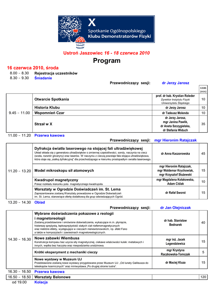 Ustroń Jaszowiec 16 - 18 czerwca 2010 Program 16 czerwca 2010, środa 8.00 - 8.30 8.30 - 9.30 Rejestracja uczestników Śniadanie Przewodniczący sesji: dr Jerzy Jarosz czas (min) prof. dr hab. Krystian Roleder Otwarcie Spotkania 9.45 - 11.00 Historia Klubu Wspomnień Czar Strzał w X Dyrektor Instytutu Fizyki Uniwersytetu Śląskiego 10 dr Jerzy Jarosz 10 dr Tadeusz Molenda dr Jerzy Jarosz, mgr Janina Pawlik, dr Aneta Szczygielska, dr Stefania Widuch 10 35 11.00 - 11.20 Przerwa kawowa Przewodniczący sesji: mgr Hieronim Ratajczak Dyfrakcja światła laserowego na stojącej fali ultradźwiękowej Układ składa się z generatora ultradźwięków o zmiennej częstotliwości, sondy, naczynia na ciecz (woda, rozwtór gliceryny) oraz laserów. W naczyniu z cieczą powstaje fala stojąca ultradźwiękowa, która staje się „siatką dyfrakcyjną" dla przechodzącego w kierunku prostopadłym swiatła laserowego. dr Anna Kaczorowska mgr Hieronim Ratajczak, mgr Waldemar Krychowiak, mgr Krzysztof SłuŜewski mgr Magdalena Kołakowska, Adam Ciślak 11.20 - 13.20 Model mikroskopu sił atomowych Kwadrupol magnetyczny Pokaz rozkładu kierunku pola magnetycznego kwadrupola. 45 15 10 Warsztaty w Ogrodzie Doświadczeń im. St. Lema Zaprezentowane zostaną Warsztaty prowadzone w Ogrodzie Doświadczeń im. St. Lema, stanowiące ofertę dodatkową dla grup odwiedzających Ogród. dr Rafał Sworst 15 13.20 - 14.30 Obiad Przewodniczący sesji: Wybrane doświadczenia pokazowe z reologii i magnetoreologii Zostaną przedstawione i omówione doświadczenia, wykazujące m.in. płynięcie, histerezę spręŜystą, lepkospręŜystość stałych ciał nieferromagnetycznych oraz niektóre efekty, występujące w cieczach nienewtonowskich, np. efekt Fano a takŜe w kompozytach i zawiesinach magnetoreologicznych. 14.30 - 16.30 Nowe zabawki Wiembusa Konstrukcja kompasu bez uzycia siły magnetycznej, ciekawe właściwości kulek: metalowych i innych, wędka bez haczyka oraz niespodzianka urodzinowa. Krótki eksperyment z mechaniki cieczy dr Jan Olejniczak dr hab. Stanisław Bednarek 40 mgr inŜ. Jacek Legendziewicz 15 mgr Krystyna Raczkowska-Tomczak 5 dr Maciej Kluza 15 Nowe wystawy w Muzeum UJ Przedstawione zostaną nowe wystawy przygotowane przez Muzeum UJ: „Od lunety Galileusza do teleskopów kosmicznych” oraz miniwystawa „Po drugiej stronie lustra”. 16.30 - 16.50 Przerwa kawowa 16.50 - 18.50 Warsztaty Balonowe Kolacja od 19.00 120 17 czerwca 2010, czwartek 8.00 - 9.00 Śniadanie Przewodniczący sesji: prof. Wojciech Nawrocik Koncert Urodzinowy Ogólnopolskiego Klubu Demonstratorów Śniadanie u Tiffany'ego Nauka to nie tylko laboratoria i uniwersytety. Doświadczenia naukowe moŜna teŜ przeprowadzać na podwórku, na pikniku, w kawiarni lub podczas śniadania. 9.00 - 11.00 Promień światła w ośrodku o zmiennym współczynniku załamania 10 mgr Marcin Paweł Sadowski, inŜ. Krzysztof Strzemieczny, dr Krzysztof Karpierz 40 mgr Jerzy Krysiak 20 dr Aneta Mika 10 Pokaz zaprezentuje jak w prosty sposób moŜna przygotować i wykonać eksperyment pokazujący, Ŝe światło nie zawsze biegnie po prostej. Niekonwencjonalne źródła uzyskiwania energii w praktycznym zastosowaniu Prezentacja projektów wykonanych przez uczniów VI Liceum Ogólnokształcącego w Szczecinie przedstawiających urządzenia działające dzięki róŜnorodnym źródłom zasilania oraz pokazujących róŜne warianty przemian energetycznych. 11.00 - 11.20 Przerwa kawowa Przewodniczący sesji: Statikos znaczy powodujący stanie Zaprezentowane zostaną mniej lub bardziej znane eksperymenty ze statyki, hydrostatyki i aerostatyki. dr Marek Gołąb dr Andrzej Kuczkowski, dr Leszek Wicikowski, mgr inŜ. Andrzej Kozłowski, inŜ. Janusz Skrzypecki 20 dr Jan Olejniczak 15 dr Tadeusz Molenda 35 dr Iwona Nowak 15 Obiekty niewidoczne dla radaru 11.20 - 13.20 Zasada działania radaru wykrywającego obiekty w ruchu, sposoby utrudniające/uniemoŜliwiające rejestrację radarową. Doświadczenia róŜne MiraŜ, zderzenia piłeczek, zachowanie probówek, zagadki z ruchu ciał. Wokół koła-interaktywna wystawa w Muzeum InŜynierii Miejskiej Wystawa Wokół koła, składa się z modeli, gdzie wykonując proste doświadczenia lub czynności, zwiedzający poznaje fakty historyczne, zjawiska fizyczne, zagadnienia techniczne, których cechą wspólną jest kształt koła. 13.20 - 14.30 Obiad Przewodniczący sesji: Doświadczenia ze spawarką Zostanie pokazany model lampy łukowej, wytwarzanie i podpalanie wodoru, jak równieŜ rozkład promieniowania UV podczas wyładowania (fosforescencja). Komputerowe sterowanie procesem fizycznym 14.30 - 16.30 Wykorzystanie komputera do pomiarów i sterowania z zastosowaniem dyskretnego algorytmu PID i układów programowalnych. Pięć doświadczeń z fizyki Wózek Ŝyroskopowy, wiotki łańcuch, przewodnictwo szkła, skacząca taśma, rura ze śrutem. 16.30 - 16.50 Przerwa kawowa Przejazd na Równicę 16.50 - 18.50 Loty balonów. od 19.30 Uroczysta kolacja dr Tadeusz Molenda mgr Rafał Wojtyniak 30 Krzysztof Kaczała 20 dr Marek Gołąb, mgr Robert Maciński, mgr inŜ. Sławomir Oksiutowicz 30 18 czerwca 2010, piątek 8.00 - 9.00 Śniadanie Przewodniczący sesji: mgr Juliusz Ciemniewski Doświadczenia dla dzieci dr Anna Hajdusianek 20 mgr Andrzej Trzebuniak 10 mgr Krystyna Raczkowska-Tomczak 5 mgr Dorota Gołębiewska 25 Marek Budziński 15 mgr Piotr Jacoń 15 Łamanie i zrywanie – jak i dlaczego – oto jest pytanie Jubileuszowe nawiązanie do mego pierwszego wystąpienia na OSDF w Katowicach: łamania kija zawieszonego na papierkach – tym razem wersja odwrotna, plus ciekawy sposób zrywania grubych sznurków w rękach z próbą wyjaśnienia fizyki zjawiska… Zamiana wody w wino 9.00 - 11.00 Pojemność kondensatora płaskiego oraz Magnesy 1) ZaleŜność pojemności kondensatora od odległości okładek, ich powierzchni oraz dielektryka 2) Magnesy małe i duŜe, ciecz magnetyczna Doświadczenia róŜne z zakresu