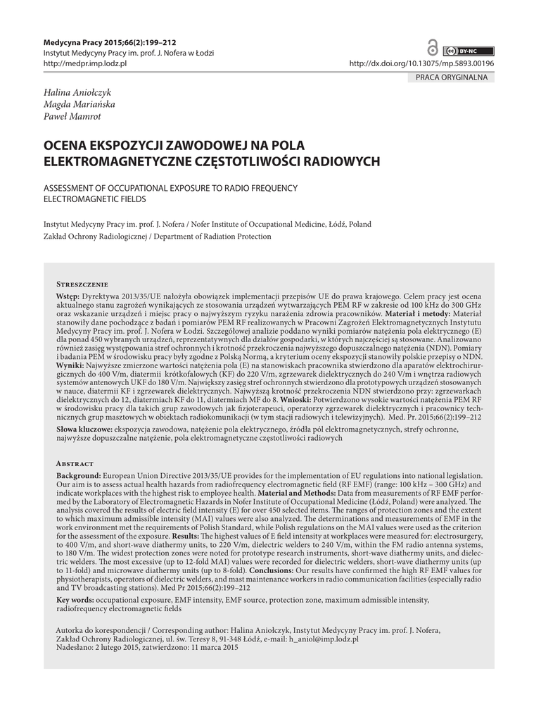 Medycyna Pracy 2015;66(2):199–212 Instytut Medycyny Pracy im. prof. J. Nofera w Łodzi http://medpr.imp.lodz.pl http://dx.doi.org/10.13075/mp.5893.00196 PRACA ORYGINALNA Halina Aniołczyk Magda Mariańska Paweł Mamrot OCENA EKSPOZYCJI ZAWODOWEJ NA POLA ELEKTROMAGNETYCZNE CZĘSTOTLIWOŚCI RADIOWYCH ASSESSMENT OF OCCUPATIONAL EXPOSURE TO RADIO FREQUENCY ELECTROMAGNETIC FIELDS Instytut Medycyny Pracy im. prof. J. Nofera / Nofer Institute of Occupational Medicine, Łódź, Poland Zakład Ochrony Radiologicznej / Department of Radiation Protection Streszczenie Wstęp: Dyrektywa 2013/35/UE nałożyła obowiązek implementacji przepisów UE do prawa krajowego. Celem pracy jest ocena aktualnego stanu zagrożeń wynikających ze stosowania urządzeń wytwarzających PEM RF w zakresie od 100 kHz do 300 GHz oraz wskazanie urządzeń i miejsc pracy o najwyższym ryzyku narażenia zdrowia pracowników. Materiał i metody: Materiał stanowiły dane pochodzące z badań i pomiarów PEM RF realizowanych w Pracowni Zagrożeń Elektromagnetycznych Instytutu Medycyny Pracy im. prof. J. Nofera w Łodzi. Szczegółowej analizie poddano wyniki pomiarów natężenia pola elektrycznego (E) dla ponad 450 wybranych urządzeń, reprezentatywnych dla działów gospodarki, w których najczęściej są stosowane. Analizowano również zasięg występowania stref ochronnych i krotność przekroczenia najwyższego dopuszczalnego natężenia (NDN). Pomiary i badania PEM w środowisku pracy były zgodne z Polską Normą, a kryterium oceny ekspozycji stanowiły polskie przepisy o NDN. Wyniki: Najwyższe zmierzone wartości natężenia pola (E) na stanowiskach pracownika stwierdzono dla aparatów elektrochirurgicznych do 400 V/m, diatermii krótkofalowych (KF) do 220 V/m, zgrzewarek dielektrycznych do 240 V/m i wnętrza radiowych systemów antenowych UKF do 180 V/m. Największy zasięg stref ochronnych stwierdzono dla prototypowych urządzeń stosowanych w nauce, diatermii KF i zgrzewarek dielektrycznych. Najwyższą krotność przekroczenia NDN stwierdzono przy: zgrzewarkach dielektrycznych do 12, diatermiach KF do 11, diatermiach MF do 8. Wnioski: Potwierdzono wysokie wartości natężenia PEM RF w środowisku pracy dla takich grup zawodowych jak fizjoterapeuci, operatorzy zgrzewarek dielektrycznych i pracownicy technicznych grup masztowych w obiektach radiokomunikacji (w tym stacji radiowych i telewizyjnych). Med. Pr. 2015;66(2):199–212 Słowa kluczowe: ekspozycja zawodowa, natężenie pola elektrycznego, źródła pól elektromagnetycznych, strefy ochronne, najwyższe dopuszczalne natężenie, pola elektromagnetyczne częstotliwości radiowych Abstract Background: European Union Directive 2013/35/UE provides for the implementation of EU regulations into national legislation. Our aim is to assess actual health hazards from radiofrequency electromagnetic field (RF EMF) (range: 100 kHz – 300 GHz) and indicate workplaces with the highest risk to employee health. Material and Methods: Data from measurements of RF EMF performed by the Laboratory of Electromagnetic Hazards in Nofer Institute of Occupational Medicine (Łódź, Poland) were analyzed. The analysis covered the results of electric field intensity (E) for over 450 selected items. The ranges of protection zones and the extent to which maximum admissible intensity (MAI) values were also analyzed. The determinations and measurements of EMF in the work environment met the requirements of Polish Standard, while Polish regulations on the MAI values were used as the criterion for the assessment of the exposure. Results: The highest values of E field intensity at workplaces were measured for: electrosurgery, to 400 V/m, and short-wave diathermy units, to 220 V/m, dielectric welders to 240 V/m, within the FM radio antenna systems, to 180 V/m. The widest protection zones were noted for prototype research instruments, short-wave diathermy units, and dielectric welders. The most excessive (up to 12-fold MAI) values were recorded for dielectric welders, short-wave diathermy units (up to 11-fold) and microwave diathermy units (up to 8-fold). Conclusions: Our results have confirmed the high RF EMF values for physiotherapists, operators of dielectric welders, and mast maintenance workers in radio communication facilities (especially radio and TV broadcasting stations). Med Pr 2015;66(2):199–212 Key words: occupational exposure, EMF intensity, EMF source, protection zone, maximum admissible intensity, radiofrequency electromagnetic fields Autorka do korespondencji / Corresponding author: Halina Aniołczyk, Instytut Medycyny Pracy im. prof. J. Nofera, Zakład Ochrony Radiologicznej, ul. św. Teresy 8, 91-348 Łódź, e-mail: [email protected] Nadesłano: 2 lutego 2015, zatwierdzono: 11 marca 2015 200 H. Aniołczyk i wsp. WSTĘP W opracowaniach Międzynarodowej Agencji Badań nad Rakiem (International Agency for Research on Can‑ cer – IARC) i monografiach Światowej Organizacji Zdrowia (World Health Organization – WHO) dotyczących ochrony człowieka przed polami i promieniowaniem elektromagnetycznym (PEM) z zakresu częstotliwości od 0 Hz do 300 GHz wyraźnie zaznacza się podział na 2 podzakresy PEM: ekstremalnie niskich częstotliwości (extremely low frequency – ELF) i częstotliwości radiowych (radiofrequency – RF) [1,2]. Granice ww. przedziałów nie zostały jednak jednoznacznie określone w rekomendacjach ani normatywach regulujących warunki ekspozycji na PEM. Dla przykładu w przepisach kanadyjskich zakres ten obejmuje częstotliwości od 3 kHz do 300 GHz, podobnie jak w przepisach Organizacji Traktatu Północnoatlantyckiego (North Atlantic Treaty Organization – NATO) [3,4]. Obowiązujące przepisy polskiego prawa pracy [5], podobnie jak nowa Dyrektywa 2013/35/UE [6], regulują poziom ochrony zdrowia i bezpieczeństwa pracowników narażonych na PEM z zakresu częstotliwości od 0 Hz do 300 GHz. Instytut Medycyny Pracy im. prof. J. Nofera w Łodzi (