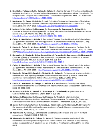 1. Niedziejko, P.; Szewczyk, M.; Kalicki, P.; Kałuża, Z. L-Proline Derived Arylmethanamine Ligands and their Application in Copper-Catalyzed Asymmetric Henry Reaction. A Rare Example of a Cucomplex with a Dicopper Tetraacetate Core. Tetrahedron: Asymmetry 2015, 26 , 1083–1094. http://dx.doi.org/10.1016/j.tetasy.2015.08.002 2. Mostowicz, D.; Dygas, M.; Kałuża, Z. Heck Cyclization Strategy for Preparation of Erythrinan Alkaloids: Asymmetric Synthesis of Unnatural (−)-Erysotramidine from L-Tartaric Acid. J. Org. Chem. 2015, 80, 1957−1963. http://pubs.acs.org/doi/abs/10.1021/jo5026157 3. Lepiarczyk, M.; Kałuża, Z.; Bielawska, A.; Czarnomysy, R.; Gornowicz, A.; Bielawski, K. Cytotoxic activity of octahydropyrazin[2,1-a:5,4-a’]diisoquinoline derivatives in human breast cancer cells. Arch. Pharm. Res. 2015, 38, 628–641. http://link.springer.com/article/10.1007/s12272-014-0444-z 4. Synthesis of Tunable Diamine Ligands with Spiro Indane2,2′-pyrrolidine Backbone and Their Applications in Enantioselective Henry Reaction” J. Org. Chem. 2014, 79, 1222−1234. http://pubs.acs.org/doi/abs/10.1021/jo402631u 5. Kałuża, Z.; Ćwiek, R.; M.; Dygas, Kalicki, P. Diamine Ligands for Asymmetric Catalysis: Facile Synthesis of C2-Symmetric Piperazines from Seebach’s Oxazolidinone. Synlett, 2014, 25, 1883– 1887.https://www.thieme-connect.com/products/ejournals/abstract/10.1055/s-0034-1378341 6. Gornowicz, A.; Kałuża, Z.; Bielawska, A.; Gabryel-Porowska, H.; Czarnomysy, R.; Bielawski, K. Cytotoxic efficacy of a novel dinuclear platinum(II) complex used with anti-MUC1 in human breast cancer cells. Mol. Cell Biochem. 2014 392, 161–174. http://link.springer.com/article/10.1007/s11010-014-2018-2 7. Ćwiek, R.; Niedziejko, P.; Kałuża, Z. Synthesis of Tunable Diamine Ligands with Spiro Indane2,2′-pyrrolidine Backbone and Their Applications in Enantioselective Henry Reaction. J. Org. Chem. 2014, 79, 1222−1234. http://pubs.acs.org/doi/abs/10.1021/jo402631u 8. Kałuża, Z.; Bielawski K.; Ćwiek, R.; Niedziejko, P.; Kaliski, P. C2-Symmetric hemiaminal ethers and diamines: new ligands for copper-catalyzed desymmetrization of meso-1,2-diols and asymmetric Henry reactions. Tetrahedron: Asymmetry 2013, 24,1435–1442. http://www.sciencedirect.com/science/article/pii/S0957416613003960 9. Kałuża, Z.; Mostowicz, D.; Dołęga, G.; Wójcik, R. A New Route to Optically Pure Highly Functionalized Tetrahydro-isoquinolines with a Quaternary Carbon Stereocenter. Tetrahedron, 2008, 64, 2321-2328. 10. Furman, B.; Kałuża, Z.; Stencel, A.; Grzeszczyk, B.; Chmielewski, M. -Lactams from Carbohydrates. Top. Heterocycl. Chem. 2007, 7, 101-132. 11. Kałuża, Z.; Mostowicz, D.; Dołęga, G.; Mroczko, K.; Wójcik, R. 10b-Substituted Hexahydropyrrolo-isoquinolines: Studies on Diastereoselective Formation of a Quaternary Carbon Stereocenter via N-Acyliminium Ion Cyclization. Tetrahedron, 2006, 62, 943-953. 12. Łysek, R.; Borsuk, K.; Furman, B.; Kałuża, Z.; Kazimierski, A.; Chmielewski, M. Strategies for the stereocontrolled formation of oxygen analogues of penicillins and cephalosporins. Curr. Med. Chem., 2004, 11(14), 1813-1835. 13. Kazimierski, A.; Kałuża, Z.; Chmielewski, M.: Ethoksycarbonylation of 3-keto-4-methyl-5oxacephams ARKIVOK, 2004, 3, 213-225. 14. Mostowicz, D.; Wójcik, R.; Dołęga, G.; Kałuża Z. Diastereoselective synthesis of 10bsubstituted hexahydropyrrolo-isoquinolines from L-tartaric acid. Creation of a quaternary carbon stereocenter via N-acyliminium ion cyclization. Tetrahedron Letters, 2004, 45, 60116015. 15. Łysek, R.; Borsuk, K.; Furman, B.; Kałuża, Z.; Chmielewski, M. Stereochemistry of [2+2] cycloaddition of chlorosulfonyl isocyanate to olefins. Curr. Org. Chem. 2004, 8, 463-473. 16. Kałuża, Z.; Kazimierski, A.; Lewandowski, K.; Suwińska, K.; Szczęsna B.; Chmielewski, M. A new synthetic approach to 5-dethia-4-methyl-5-oxacephems” Tetrahedron, 2003, 59, 58935903. 17. Kałuża, Z.; Mostowicz, D. Synthesis of enantiopure 1,2-dihydroxyhexahydropyrroloisoquinolines as potential tools for asymmetric catalysis. Tetrahedron Asymmetry, 2003, 14, 225232. 18. Łysek, R.; Borsuk, K.; Chmielewski, M.; Kałuża, Z.; Urbańczyk-Lipkowska, Z.; Klimek, A.; Frelek J. 5-Dethia-5-oxacephams: Toward Correlation and Chiroptical Properties. J. Org. Chem. 2002, 67, 1472-1479. 19. Łysek, R.; Furman, B.; Kałuża, Z.; Frelek, J.; Suwińska, K.; Urbańczyk-Lipkowska, Z.; M. Chmielewski: [2+2 ] Cycloaddition of Chlorosulfonyl Isocyanate to allenyl-sugar ethers”. Tetrahedron Asymmetry, 2000, 11, 3131-3150. 20. Kałuża, Z.; Furman, B.; Krajewski P.; Chmielewski M. Strategies for the Formation of 1-Dethia1-oxa-cephams. Tetrahedron, 2000, 56, 5553-5562. 21. Łysek, R.; Furman, B.; Kałuża, Z.; M. Chmielewski. Synthesis of 7-Substituted 5-Dethia-5oxocephams via [2+2]Cycloaddytion of Chlorosulfonyl Isocyanate to Sugar Vinyl Ethers”. Polish J. Chem., 2000, 74, 51-60. 22. Łysek, R.; Krajewski, P.; Urbańczyk-Lipkowska, Z.; Furman, B.; Kałuża, Z.; Kozerski, L.; Chmielewski, M. Conformation of chiral alkoksyallenes by proton NMR spectroscopy. J. Chem. Soc., Perkin Trans.2, 2000, 61-67. 23. Furman, B.; Thürmer, R.; Kałuża, Z.; Voelter, W.; Chmielewski, M. A New Acetal Resin Valuable for the Solid-Phase Synthesis of 1-Oxacephams via Cyclization/Cleavage step” Tetrahedron Lett. 1999, 40, 5909-5912. 24. Furman, B.; Thürmer, R.; Kałuża, Z.; Łysek, R.; Voelter, W.; Chmielewski M. Stereoselective Solid-Phase Synthesis of -lactams - A Novel Cyclization/Cleavage Step towards 1Oxacephams’’, Angew. Chem., 1999, 38, 1121-1123. 25. B. Furman, Z. Kaluża, R. Łysek, and M. Chmielewski. [2+2]Cycloaddition of Chlorosulfonyl Isocyanate to Chiral Vinyl Ethers. Polish J. Chem., 1999, 74, 43-54. 26.Furman, B.; Krajewski, P.; Kałuża, Z.; Thürmer, R; Voelter, W.; Kozerski, L.; Williamson, M.P; Chmielewski, M. Stereochemical model of [2+2]cycloaddition of chlorosulfonyl isocyanate to chiral vinyl ethers