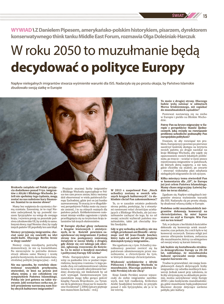 ŚWIAT 15 WYWIAD \ Z Danielem Pipesem, amerykańsko-polskim historykiem, pisarzem, dyrektorem konserwatywnego think tanku Middle East Forum, rozmawia Olga Doleśniak-Harczuk W roku 2050 to muzułmanie będą decydować o polityce Europy Napływ nielegalnych imigrantów stwarza wyśmienite warunki dla ISIS. Nadarzyła się po prostu okazja, by Państwo Islamskie zbudowało swoją siatkę w Europie Fot. Wikipedia To może z drugiej strony. Dlaczego ludzie wolą zatonąć w odmętach Morza Śródziemnego, niż zapukać do muzułmańskich sąsiadów? Ponieważ nastawiają się na niebo w Europie i piekło na Bliskim Wschodzie. Bruksela zażądała od Polski przyjęcia dodatkowo ponad 9 tys. imigrantów z Afryki i Bliskiego Wschodu. Jeżeli nie spełnimy tego żądania, mogą zostać na nas nałożone kary finansowe. Szantaż to za mocne słowo? Mamy bez wątpienia do czynienia z formą szantażu. Zauważmy, że to rząd Niemiec zadecydował, by np. pozwolić rzeszom Syryjczyków na wstęp do swojego kraju, i wywiera presję na pozostałe państwa członkowskie UE, by zrobiły to samo. Innymi słowy, rząd Niemiec chce, by rządy innych państw UE popełniły ten sam błąd. Niemcy przyjmują imigrantów, chociaż sami już się zawiedli na idei multi-kulti. Dlaczego Berlin brnie w ślepy zaułek? Niemcy czują nieodpartą potrzebę demonstracji, że nie są ksenofobami. Na nieszczęście ta potrzeba demonstracji skłania same Niemcy i resztę państw kontynentu do wdrażania katastrofalnej polityki [imigracyjnej – red.]. Nie ma sposobu, by rzetelnie skontrolować wszystkich przybyszów, stwierdzić, że ktoś na pewno jest ofiarą wojny, a nie członkiem czy sympatykiem Państwa Islamskiego. Polska nie jest gotowa na takie wyzwanie. Jaki scenariusz czeka nas, jeżeli przyjmiemy narzucaną nam liczbę obcych kulturowo imigrantów? Przyjęcie znacznej liczby imigrantów z Bliskiego Wschodu zapoczątkuje w Polsce ten sam proces zmian, który możemy dziś obserwować w wielu państwach Europy Zachodniej, gdzie jest on już bardzo zaawansowany. To znaczy, że w długofalowej perspektywie Polska może się znacznie zmienić, i to na różnych ważnych dla państwa polach. Krótkoterminowo natomiast istnieje wielkie zagrożenie z tytułu prześlizgnięcia się na terytorium kraju islamistów lub innych ekstremistów. W Europie słychać głosy zwłaszcza z kręgów lewicowych i ateistycznych, że to Kościół powinien zaopiekować się imigrantami. Z jednej strony tzw. postępowcy zmieniają świątynie w nocne kluby, z drugiej, gdy dzieje się coś takiego jak obecnie, zgłaszają roszczenia do Kościoła. Co to mówi o kondycji moralnej i politycznej Europy XXI wieku? Wielu Europejczyków ma poczucie winy za paskudne trio w postaci imperializmu, faszyzmu i rasizmu. I z tego powodu chcą coś zademonstrować całemu światu, i to w sposób zdecydowanie bardziej drastyczny, niż ktokolwiek by od nich wymagał. Zainteresowanym tym zjawiskiem mogę tylko gorąco polecić książkę Pascala Bruecknera „La Tyrannie de la pénitence: Essai sur le masochisme Occidental” ( 2006) [pisarz piętnuje tam masochizm Zachodu – red.]. W 2013 r. zaapelował Pan: „Niech uchodźcy zostaną w swoich własnych kręgach kulturowych”. Co dokładnie chciał Pan zakomunikować? To, co w zasadzie ostatnio podniosła strona polska, postulując, by z otwartymi ramionami witać chrześcijan uciekających z Bliskiego Wschodu, ale już muzułmanów zachęcać do tego, by na cel swojej ucieczki wybierali państwa muzułmańskie, takie jak chociażby Arabia Saudyjska. Gdy w grę wchodzą uchodźcy, nie ma religii, przekonań ani filozofii – utrzymuje szef KE Jean-Claude Juncker, który żąda od państw UE przyjęcia dziesiątek tysięcy imigrantów... Nie zgadzam się z tym. Uchodźcy muzułmańscy powinni zwrócić się ku państwom zdominowanym przez muzułmanów, a chrześcijanie ku tym, w których dominuje chrześcijaństwo. Większość uciekinierów z Afryki Północnej i Bliskiego Wschodu to muzułmanie. Dlaczego państwa Zatoki Perskiej ich nie chcą? Kraje Zatoki Perskiej zawsze wpuszczały do siebie imigrantów zarobkowych, inni byli rzadkością. Królestwo Arabii Saudyjskiej twierdzi, że przyjęło ponad 2 mln Syryjczyków, ale ja w to nie wierzę. Patrzy Pan na kryzys migracyjny w Europie z perspektywy Stanów Zjednoczonych. Jaką receptę na rozwiązanie problemu uchodźców podsunąłby Pan europejskim politykom? Uważam, że aby rozwiązać ten problem, Europejczycy powinni po pierwsze zaostrzyć kontrolę dostępu na terytoria swoich państw, po drugie naciskać na kraje Bliskiego Wschodu, aby zajęły się opanowaniem swoich lokalnych problemów, po trzecie – wcielać w życie prawo rejestrowania imigrantów w państwach, do których dotrą najpierw, a nie tam, gdzie chcieliby się znaleźć, po czwarte – stworzyć wykonalny plan odsyłania nielegalnych imigrantów do ich ojczyzn. Kilka miesięcy temu stwierdził Pan w komentarzu dla „GP”, że Europa już jest celem Państwa Islamskiego. Mamy chaos migracyjny. Łatwiej będzie im teraz działać... Zgadzam się. Napływ nielegalnych imigrantów stwarza wyśmienite warunki dla ISIS. Nadarzyła się po prostu okazja, by zbudować własną siatkę w Europie. Podobno setki muzułmańskich imigrantów dokonują konwersji na chrześcijaństwo, by mieć lepsze szanse na azyl w Europie. Wie Pan coś na ten temat? Tak, w jednym z berlińskich kościołów dokonała się konwersja setek muzułmanów, czas pokaże, ilu z nich było w tej konwersji szczerych. Zmiana religii jest zawsze olbrzymim krokiem, zwłaszcza dla muzułmanów, którzy za odstępstwo od swojej wiary są karani śmiercią. Jak będzie się kształtowała struktura demograficzna Europy za 20–30 lat, zakładając, że muzułmańska ludność sprowadzi swoje rodziny, zapuści korzenie etc. Trudno to przewidzieć, nie znając kompleksowych danych dotyczących liczby imigrantów c