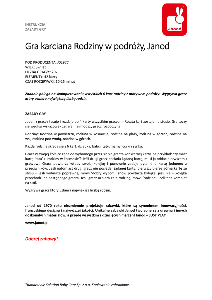 INSTRUKCJA ZASADY GRY Gra karciana Rodziny Rodziny w podróży, podróży, Janod KOD PRODUCENTA: J02977 WIEK: 3-7 lat LICZBA GRACZY: 2-6 ELEMENTY: 42 karty CZAS ROZGRYWKI: 10-15 minut Zadanie polega na skompletowaniu wszystkich 6 kart rodziny z motywem podróży. Wygrywa gracz który uzbiera największą liczbę rodzin. ZASADY GRY Jeden z graczy tasuje i rozdaje po 4 karty wszystkim graczom. Reszta kart zostaje na stosie. Gra toczy się według wskazówek zegara, najmłodszy gracz rozpoczyna. Rodziny: Rodzina w powietrzu, rodzina w kosmosie, rodzina na plaży, rodzina w górach, rodzina na wsi, rodzina pod wodą, rodzina w górach. Każda rodzina składa się z 6 kart: dziadka, babci, taty, mamy, córki i synka. Gracz w swojej kolejce żąda od wybranego przez siebie gracza konkretnej karty, na przykład: czy masz kartę ‘tata’ z ‘rodziny w kosmosie’? Jeśli drugi gracz posiada żądaną kartę, musi ja oddać pierwszemu graczowi. Gracz powtarza wtedy swoją kolejkę i ponownie zadaje pytanie o kartę jednemu z przeciwników. Jeśli natomiast drugi gracz nie posiadał żądanej karty, pierwszy bierze górną kartę ze stosu – jeśli wybierze poprawną, mówi ‘dobry wybór’ i znów powtarza kolejkę, jeśli nie – kolejka przechodzi na następnego gracza. Jeśli gracz uzbiera cała rodzinę, mówi ‘rodzina’ i odkłada komplet na stół. Wygrywa gracz który uzbiera największa liczbę rodzin. Janod od 1970 roku niezmiennie projektuje zabawki, które są synonimem innowacyjności, francuskiego designu i najwyższej jakości. Unikalne zabawki Janod tworzone są z drewna i innych doskonałych materiałów, a przede wszystkim z dziecięcych marzeń! Janod – JUST PLAY www.janod.pl Dobrej zabawy! Tłumaczenie Solution Baby Care Sp. z o.o. Kopiowanie zabronione.