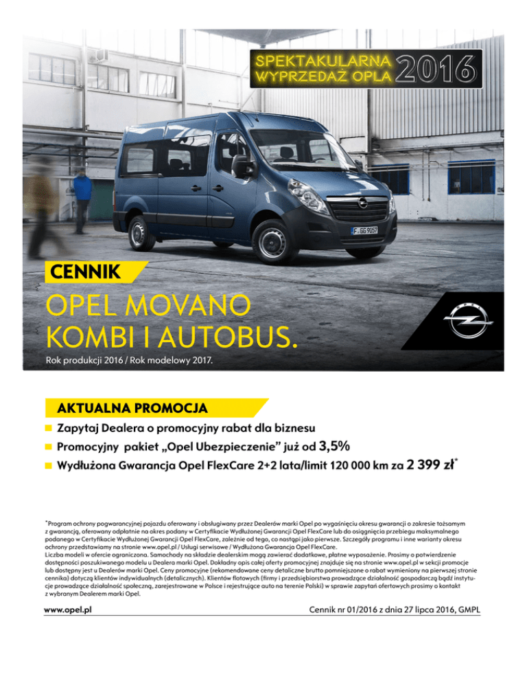 CENNIK OPEL MOVANO KOMBI I AUTOBUS. Rok produkcji 2016 / Rok modelowy 2017. AKTUALNA PROMOCJA Zapytaj Dealera o promocyjny rabat dla biznesu Promocyjny pakiet „Opel Ubezpieczenie” już od 3,5% Wydłużona Gwarancja Opel FlexCare 2+2 lata/limit 120 000 km za 2 399 zł* *Program ochrony pogwarancyjnej pojazdu oferowany i obsługiwany przez Dealerów marki Opel po wygaśnięciu okresu gwarancji o zakresie tożsamym z gwarancją, oferowany odpłatnie na okres podany w Certyfikacie Wydłużonej Gwarancji Opel FlexCare lub do osiągnięcia przebiegu maksymalnego podanego w Certyfikacie Wydłużonej Gwarancji Opel FlexCare, zależnie od tego, co nastąpi jako pierwsze. Szczegóły programu i inne warianty okresu ochrony przedstawiamy na stronie www.opel.pl / Usługi serwisowe / Wydłużona Gwarancja Opel FlexCare. Liczba modeli w ofercie ograniczona. Samochody na składzie dealerskim mogą zawierać dodatkowe, płatne wyposażenie. Prosimy o potwierdzenie dostępności poszukiwanego modelu u Dealera marki Opel. Dokładny opis całej oferty promocyjnej znajduje się na stronie www.opel.pl w sekcji promocje lub dostępny jest u Dealerów marki Opel. Ceny promocyjne (rekomendowane ceny detaliczne brutto pomniejszone o rabat wymieniony na pierwszej stronie cennika) dotyczą klientów indywidualnych (detalicznych). Klientów flotowych (firmy i przedsiębiorstwa prowadzące działalność gospodarczą bądź instytucje prowadzące działalność społeczną, zarejestrowane w Polsce i rejestrujące auto na terenie Polski) w sprawie zapytań ofertowych prosimy o kontakt z wybranym Dealerem marki Opel. www.opel.pl Cennik nr 01/2016 z dnia 27 lipca 2016, GMPL Cennik – Opel Movano Kombi/Autobus rok produkcji 2016, rok modelowy 2017 Modele i wersje 2.3 CDTI BiTurbo 110 KM S/S 2.3 CDTI BiTurbo 145 KM S/S 2.3 CDTI BiTurbo 170 KM S/S 2.3 CDTI BiTurbo 145 KM S/S 2.3 CDTI BiTurbo 163 KM S/S L1H1 FWD 3,0t Kombi 9-os. M6 140 290 145 840 149 790 – – L1H1 FWD 3,3t Kombi 9-os. M6 142 790 148 340 152 290 – – L2H2 FWD 3,3t Kombi 9-os. M6 144 590 151 140 155 090 – – L2H2 FWD 3,5t Kombi 9-os. M6 147 590 153 140 157 090 – – L3H2 FWD 3,9t Autobus 17-os. M6 – – – 190 840 192 190 L – dostępne długości nadwozia: 1 = krótka, 2 = średnia, 3 = długa H – dostępne wysokości nadwozia: 1 = niska, 2 = średnia FWD = napęd na przednie koła Wszystkie ceny zawarte w niniejszym cenniku są rekomendowanymi cenami detalicznymi brutto, zawierającymi opłatę za transport samochodu, podatek VAT oraz podatek akcyzowy zależny od typu homologacji i od pojemności silnika.Dokładny opis całej oferty promocyjnej dostępny jest u Dealerów marki Opel. Ceny promocyjne dotyczą klientów indywidualnych (detalicznych). Klientów flotowych (firmy i przedsiębiorstwa prowadzące działalność gospodarczą bądź instytucje prowadzące działalność społeczną, zarejestrowane w Polsce i rejestrujące auto na terenie Polski) w sprawie zapytań ofertowych prosimy o kontakt z wybranym Dealerem marki Opel. Dane techniczne silników Kombi i Autobus Skrzynie biegów Pojemność skokowa, cm3 Moc maksymalna, kW/KM przy obr./min Maks. moment obrotowy, Nm przy obr./min Norma emisji spalin Zużycie paliwa, cykl mieszany, l/100 km* Kombi 2.3 CDTI BiTurbo 110 KM S/S Kombi 2.3 CDTI BiTurbo 145 KM S/S Kombi 2.3 CDTI BiTurbo 170 KM S/S Autobus 2.3 CDTI BiTurbo 145 KM S/S Autobus 2.3 CDTI BiTurbo 163 KM S/S 6-biegowa manualna 6-biegowa manualna 6-biegowa manualna 6-biegowa manualna 6-biegowa manualna 2 299 2 299 2 299 2 299 2 299 81 / 110 przy 3 500 107 / 145 przy 3 500 125/ 170 przy 4 750-6 000 107 / 145 przy 3 500 120 / 165 przy 3 500 285 przy 1 250-2 000 350 przy 1 500-2 750 350 przy 1 500-2 750 350 przy 1 500-2 750 360 przy 1 500-3 000 Euro 6 Euro 6 Euro 6 Euro 6 Euro 6 7,1-6,9 6,6–6,3 6,6–6,3 b.d. b.d. Emisja CO2, cykl mieszany, g/km* 188-185 197–193 197–193 b.d. b.d. Obowiązkowe przeglądy okresowe co 40 000 km lub 2 lata co 40 000 km lub 2 lata co 40 000 km lub 2 lata co 30 000 km lub 1 rok co 30 000 km lub 1 rok * Wszystkie informacje są aktualne w momencie publikacji materiału. General Motor Poland Sp. z o.o. oraz Dealerzy marki Opel zastrzegają sobie prawo do zmian specyfikacji produktów. Indywidualne uzgodnienie właściwości, ceny oraz specyfikacji technicznej pojazdu następuje w umowie sprzedaży pojazdu zawieranej z Dealerem marki Opel. Wszystkie dane dotyczą modeli podstawowych z wyposażeniem seryjnym. Wartości zużycia paliwa i emisji spalin dla silników spełniających normę Euro 6 zostały określone zgodnie z Rozporządzeniem (WE) nr 715/2007 Parlamentu Europejskiego i Rady oraz Rozporządzeniem Komisji (WE) nr 692/2008, na podstawie oficjalnych testów w warunkach laboratoryjnych. Rzeczywiste wartości mogą różnić się od podanych w zależności od zachowania kierowcy, warunków atmosferycznych, nawierzchni, jak i innych czynników natury nietechnicznej. Dodatkowe wyposażenie może spowodować wyższe spalanie i emisję CO 2 , zwiększenie masy własnej pojazdu, a co za tym idzie nacisku na osie i jednoczesne ograniczenie ładowności pojazdu i dopuszczalnej masy całkowitej przyczepy. Może również prowadzić do zmniejszenia maksymalnej prędkości i uzyskiwanych przyśpieszeń. Zmierzone osiągi dotyczą pojazdu z kierowcą o masie 75 kg i obciążeniem 125 kg. Wymiary, masy, pojemności Nadwozie Przestrzeń ładunkowa (wg ECIE, w zależności od wersji) Długość całkowita (mm): L1: 5 048, L2: 5 548, L3: 6 198 Długość przestrzeni ład. (Kombi z 3 rzędem siedzeń, mm): L1: 948, L2: 1 448 Wysokość całkowita (mm, bez obciążenia): H1: 2 287, H2: 2 495 - 2 482, Bus: 2 488 Długość przestrzeni ład. (Kombi z 2 rzędem siedzeń, mm): L1: 1 757, L2: 2 257 Szerokość między nadkolami (Kombi, mm): 1 380 Szerokość ze złożonymi/rozłożonymi lusterkami (mm): 2 070/2 470 Wysokość wnętrza pojazdu (mm): H1: 1 650, H2: 1 850 Rozstaw osi (mm): 3 182/3 682/4 332 Rozsta