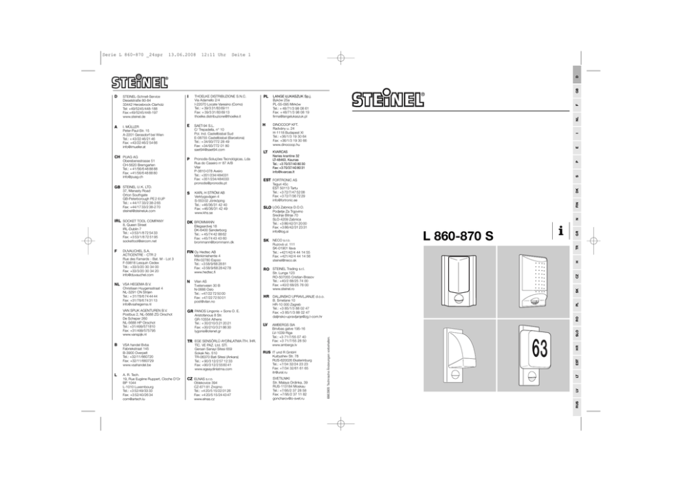 13.06.2008 12:11 Uhr Seite 1 THOELKE DISTRIBUZIONE S.N.C. Via Adamello 2/4 I-22070 Locate Varesino (Como) Tel.: + 39/3 31/83 69 11 Fax: + 39/3 31/83 69 13 [email protected] PL LANGE ŁUKASZUK Sp.j. Byków 25a PL-55-095 Mirków Tel.: + 48/71/3 98 08 61 Fax: + 48/71/3 98 08 19 [email protected] A I. MÜLLER Peter-Paul-Str. 15 A-2201 Gerasdorf bei Wien Tel.: + 43/22 46/21 46 Fax: +43/22 46/2 54 66 [email protected] E SAET-94 S.L. C/ Trepadella, n° 10 Pol. Ind. Castellbisbal Sud E-08755 Castellbisbal (Barcelona) Tel.: + 34/93/772 28 49 Fax: +34/93/772 01 80 [email protected] H DINOCOOP KFT. Radvány u. 24 H-1118 Budapest XI Tel.: +36/1/3 19 30 64 Fax: +36/1/3 19 30 66 www.dinocoop.hu LT KVARCAS Neries krantine 32 LT-48463, Kaunas Tel.: +3 70/37/40 80 30 Fax: +3 70/37/40 80 31 [email protected] Christiaan Huygensstraat 4 NL-3291 CN Strijen Tel.: + 31/78/6 74 44 44 Fax: +31/78/6 74 31 13 [email protected] VAN SPIJK AGENTUREN B.V. Postbus 2, NL-5688 ZG Oirschot De Scheper 260 NL-5688 HP Oirschot Tel.: +31/499/571810 Fax: +31/499/575795 www.vanspijk.nl B L N Vilan AS Tvetenveien 30 B N-0666 Oslo Tel.: +47/22 72 50 00 Fax: +47/22 72 50 01 [email protected] Aristofanous 8 Str. GR-10554 Athens Tel.: + 30/210/3 21 20 21 Fax: +30/210/3 21 86 30 [email protected] A. R. Tech. 19, Rue Eugène Ruppert, Cloche D’Or BP 1044 L-1010 Luxembourg Tel.: +3 52/49/33 33 Fax: +3 52/40/26 34 [email protected] TÍC. VE PAZ. Ltd. STÍ. Gersan Sanayi Sitesi 659 Sokak No. 510 TR-06370 Bati Sitesi (Ankara) Tel.: + 90/3 12/2 57 12 33 Fax: +90/3 12/2 55 60 41 www.egeaydinlatma.com CZ ELNAS s.r.o. Oblekovice 394 CZ-671 81 Znojmo Tel.: +4 20/5 15/22 01 26 Fax: +4 20/5 15/24 43 47 www.elnas.cz FIN N GR H TR i RO STEINEL Trading s.r.l. Str. Lunga 123 RO-507055 Cristian-Brasov Tel.: +40/2 68/25 74 00 Fax: +40/2 68/25 76 00 www.steinel.ro HR DALJINSKO UPRAVLJANJE d.o.o. B. Smetane 10 HR-10 000 Zagreb Tel.: +3 85/1/3 88 02 47 Fax: +3 85/1/3 88 02 47 [email protected] GR PANOS Lingonis + Sons O. E. TR EGE SENSÖRLÜ AYDÍNLATMA ÍTH. ÍHR. VSA handel Bvba Fabriekstraat 145 B-3900 Overpelt Tel.: +32/11/660720 Fax: +32/11/660729 www.vsahandel.be Ruzová ul. 111 SK-01901 Ilava Tel.: +421/42/4 44 14 55 Fax: +421/42/4 44 14 56 [email protected] FIN Oy Hedtec AB Mänkimiehentie 4 FIN-02780 Espoo Tel.: +3 58/9/68 28 81 Fax: +3 58/9/68 28 42 78 www.hedtec.fi L 860-870 S SK NECO s.r.o. CZ Ellegaardvej 18 DK-6400 Sønderborg Tel.: + 45/74 42 88 62 Fax: +45/74 43 43 60 [email protected] SK NL VSA HEGEMA B.V. DK BROMMANN LV AMBERGS SIA Brivibas gatve 195-16 LV-1039 Riga Tel.: +3 71/7/55 07 40 Fax: +3 71/7/55 28 50 www.ambergs.lv RUS IT und R GmbH Kuibyshev Str. 78 RUS-620026 Ekaterinburg Tel.: +7/34 32/24 23 23 Fax: +7/34 32/61 61 65 [email protected] SVETILNIKI Str. Malaya Ordinka, 39 RUS-113184 Moskau Tel.: +7/95/2 37 28 58 Fax: +7/95/2 37 11 82 [email protected] PL DUVAUCHEL S.A. ACTICENTRE - CTR 2 Rue des Famards - Bat. M - Lot 3 F-59818 Lesquin Cedex Tél.: +33/3/20 30 34 00 Fax: +33/3/20 30 34 20 [email protected] Podjetje Za Trgovino Srednje Bitnje 70 SLO-4209 Zabnica Tel.: +3 86/42/31 20 00 Fax: +3 86/42/31 23 31 [email protected] RO F SLO LOG Zabnica D.O.O. SLO 8, Queen Street IRL-Dublin 7 Tel.: +3 53/1/8 72 54 33 Fax: +3 53/1/8 72 51 95 [email protected] DK Teguri 45c EST 50113 Tartu Tel.: +3 72/7/47 52 08 Fax: +3 72/7/36 72 29 [email protected] HR IRL SOCKET TOOL COMPANY S KARL H STRÖM AB Verktygsvägen 4 S-553 02 Jönköping Tel.: +46/36/31 42 40 Fax: +46/36/31 42 49 www.khs.se EST 37, Manasty Road Orton Southgate GB-Peterborough PE 2 6 UP Tel.: + 44/17 33/2 38-2 65 Fax: +44/17 33/2 38-2 70 [email protected] P S EST FORTRONIC AS GB STEINEL U. K. LTD. LT Pronodis-Soluções Tecnológicas, Lda Rua do Caseiro no 87 A/B Vilar P-3810-078 Aveiro Tel.: +351/234/484031 Fax: +351/234/484033 [email protected] LV P RUS Oberebenestrasse 51 CH-5620 Bremgarten Tel.: + 41/56/6 48 88 88 Fax: +41/56/6 48 88 80 [email protected] 6663905 Technische Änderungen vorbehalten. CH PUAG AG NL I I STEINEL-Schnell-Service Dieselstraße 80-84 33442 Herzebrock-Clarholz Tel: +49/5245/448-188 Fax:+49/5245/448-197 www.steinel.de E D F GB D Serie L 860-870 _24spr Serie L 860-870 _24spr 13.06.2008 12:11 Uhr Seite 3 12 15 1x 2x 5 sec.-15 min 4h 12 m 16 5m 4 5 5m 12 m 12 m 5m 55 m 6 L 86x/875/876/885 S 12m 12m = 5m 5m 180° L 870/871 S 12 m 5m 5m 12 m 11 55 m Alternativ 12m 12m = 12m 12 m 180° Alternativ TORX = 17 12 m 90° 13 = 5m 12 m 12 m 5m max.12 m -2- <12 m <12 m -3- 180° PL 13.06.2008 12:11 Uhr Zasady bezpieczeństwa Instrukcja montażu Szanowny Nabywco! Dziękujemy za okazane zaufanie i zakup nowej lampy z czujnikiem ruchu marki STEINEL. Wybraliście Państwo wyrób wysokiej jakości, który wyprodukowano, przetestowano i zapakowano z największą starannością. Przed uruchomieniem prosimy zapoznać się z poniższą instrukcją montażu. Tylko prawidłowa instalacja i uruchomienie urządzenia zapewniają długoletnią, niezawodną i bezusterkową eksploatację. Życzymy Państwu wiele radości z użytkowania nowej lampy z czujnikiem ruchu marki STEINEL. Seite 69 ■ Przed przystąpieniem do jakiejkolwiek pracy przy urządzeniu należy wyłączyć napięcie zasilające! ■ Przewód zasilający, który należy podłączyć przy montażu nie może być pod napięciem. Dlatego najpierw należy wyłączyć prąd i sprawdzić brak napięcia przy pomocy próbnika napięcia. ■ Podczas instalacji lampy z czujnikiem ruchu mamy do czynienia z pracę wykonywaną pod napięciem sieciowym. Dlatego należy ją wykonać fachowo, zgodnie z obowiązującymi przepisami dotyczącymi instalacji i podłączania do zasilania elektrycznego. ( -VDE 0100, -ÖVE/ÖNORM E 8001-1, -SEV 1000) ■ Ustawianie funkcji , , wykonywać tylko z zamontowaną soczewką. A Opis urządzenia Zasada działania Uchwyt naścienny Mimośród do zamocowania klosza Soczewka czujnika (wyjmowana i obracana do ustawiania podstawowego zasięgu czujnika: maksymalnie do 5 m lub do 12 m) Ustawianie pr