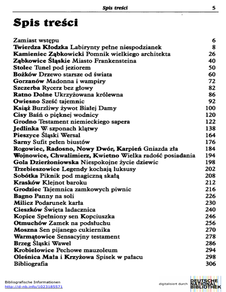 Spis treści 5 Spis treści Zamiast wstępu Twierdza Kłodzka Labirynty pełne niespodzianek Kamieniec Ząbkowicki Pomnik wielkiego architekta Ząbkowice Śląskie Miasto Frankensteina Stolec Tunel pod jeziorem Bożków Drzewo starsze od świata Gorzanów Madonna i wampiry Szczerba Rycerz bez głowy Ratno Dolne Ukrzyżowana królewna Owiesno Sześć tajemnic Książ Burzliwy żywot Białej Damy Cisy Baśń o pięknej wodnicy Grodno Testament niemieckiego sapera Jedlinka W szponach klątwy Pieszyce Śląski Wersal Sarny Sufit pełen biustów Rogowiec, Radosno, Nowy Dwór, Karpień Gniazda zła Wojnowice, Chwalimieiz, Kwietno Wielka radość posiadania Gola Dzierżoniowska Niespokojne życie dziewic Trzebieszowice Legendy kochają luksusy Sobótka Piknik pod magiczną skałą Krasków Klejnot baroku Grodziec Tajemnica zamkowych piwnic Bagno Panny na soli Milicz Podarunek karła Cieszków Święta ladacznica Kopice Spełniony sen Kopciuszka Otmuchów Zamek na podsłuchu Moszna Sen pijanego cukiernika Warmątowice Sensacyjny testament Brzeg Śląski Wawel Krobielowice Pechowe mauzoleum Oleśnica Mała i Krzyżowa Spisek w pałacu Bibliografia http://d-nb.info/1023185571 6 8 26 40 50 60 72 82 86 92 100 120 122 138 164 176 184 194 198 202 208 212 216 226 230 240 246 256 270 278 286 294 298 306