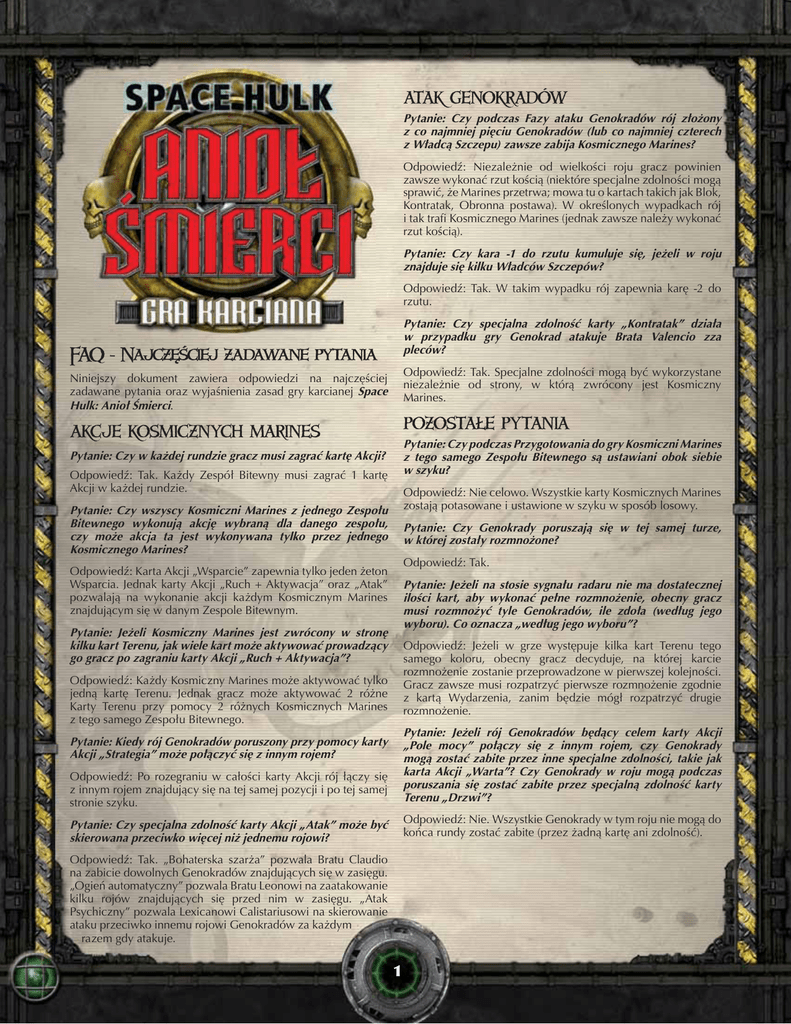 ATAK GENOKRADÓW Pytanie: Czy podczas Fazy ataku Genokradów rój złożony z co najmniej pięciu Genokradów (lub co najmniej czterech z Władcą Szczepu) zawsze zabija Kosmicznego Marines? Odpowiedź: Niezależnie od wielkości roju gracz powinien zawsze wykonać rzut kością (niektóre specjalne zdolności mogą sprawić, że Marines przetrwa; mowa tu o kartach takich jak Blok, Kontratak, Obronna postawa). W określonych wypadkach rój i tak trafi Kosmicznego Marines (jednak zawsze należy wykonać rzut kością). Pytanie: Czy kara -1 do rzutu kumuluje się, jeżeli w roju znajduje się kilku Władców Szczepów? Odpowiedź: Tak. W takim wypadku rój zapewnia karę -2 do rzutu. Pytanie: Czy specjalna zdolność karty „Kontratak” działa w przypadku gry Genokrad atakuje Brata Valencio zza pleców? FAQ - Najczęściej zadawane pytania Odpowiedź: Tak. Specjalne zdolności mogą być wykorzystane niezależnie od strony, w którą zwrócony jest Kosmiczny Marines. Niniejszy dokument zawiera odpowiedzi na najczęściej zadawane pytania oraz wyjaśnienia zasad gry karcianej Space Hulk: Anioł Śmierci. POZOSTAŁE PYTANIA AKCJE KOSMICZNYCH MARINES Pytanie: Czy podczas Przygotowania do gry Kosmiczni Marines z tego samego Zespołu Bitewnego są ustawiani obok siebie w szyku? Pytanie: Czy w każdej rundzie gracz musi zagrać kartę Akcji? Odpowiedź: Tak. Każdy Zespół Bitewny musi zagrać 1 kartę Akcji w każdej rundzie. Odpowiedź: Nie celowo. Wszystkie karty Kosmicznych Marines zostają potasowane i ustawione w szyku w sposób losowy. Pytanie: Czy wszyscy Kosmiczni Marines z jednego Zespołu Bitewnego wykonują akcję wybraną dla danego zespołu, czy może akcja ta jest wykonywana tylko przez jednego Kosmicznego Marines? Pytanie: Czy Genokrady poruszają się w tej samej turze, w której zostały rozmnożone? Odpowiedź: Tak. Odpowiedź: Karta Akcji „Wsparcie” zapewnia tylko jeden żeton Wsparcia. Jednak karty Akcji „Ruch + Aktywacja” oraz „Atak” pozwalają na wykonanie akcji każdym Kosmicznym Marines znajdującym się w danym Zespole Bitewnym. Pytanie: Jeżeli na stosie sygnału radaru nie ma dostatecznej ilości kart, aby wykonać pełne rozmnożenie, obecny gracz musi rozmnożyć tyle Genokradów, ile zdoła (według jego wyboru). Co oznacza „według jego wyboru”? Pytanie: Jeżeli Kosmiczny Marines jest zwrócony w stronę kilku kart Terenu, jak wiele kart może aktywować prowadzący go gracz po zagraniu karty Akcji „Ruch + Aktywacja”? Odpowiedź: Jeżeli w grze występuje kilka kart Terenu tego samego koloru, obecny gracz decyduje, na której karcie rozmnożenie zostanie przeprowadzone w pierwszej kolejności. Gracz zawsze musi rozpatrzyć pierwsze rozmnożenie zgodnie z kartą Wydarzenia, zanim będzie mógł rozpatrzyć drugie rozmnożenie. Odpowiedź: Każdy Kosmiczny Marines może aktywować tylko jedną kartę Terenu. Jednak gracz może aktywować 2 różne Karty Terenu przy pomocy 2 różnych Kosmicznych Marines z tego samego Zespołu Bitewnego. Odpowiedź: Po rozegraniu w całości karty Akcji rój łączy się z innym rojem znajdujący się na tej samej pozycji i po tej samej stronie szyku. Pytanie: Jeżeli rój Genokradów będący celem karty Akcji „Pole mocy” połączy się z innym rojem, czy Genokrady mogą zostać zabite przez inne specjalne zdolności, takie jak karta Akcji „Warta”? Czy Genokrady w roju mogą podczas poruszania się zostać zabite przez specjalną zdolność karty Terenu „Drzwi”? Pytanie: Czy specjalna zdolność karty Akcji „Atak” może być skierowana przeciwko więcej niż jednemu rojowi? Odpowiedź: Nie. Wszystkie Genokrady w tym roju nie mogą do końca rundy zostać zabite (przez żadną kartę ani zdolność). Pytanie: Kiedy rój Genokradów poruszony przy pomocy karty Akcji „Strategia” może połączyć się z innym rojem? Odpowiedź: Tak. „Bohaterska szarża” pozwala Bratu Claudio na zabicie dowolnych Genokradów znajdujących się w zasięgu. „Ogień automatyczny” pozwala Bratu Leonowi na zaatakowanie kilku rojów znajdujących się przed nim w zasięgu. „Atak Psychiczny” pozwala Lexicanowi Calistariusowi na skierowanie ataku przeciwko innemu rojowi Genokradów za każdym razem gdy atakuje. 1