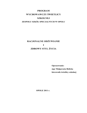 PROGRAM WYCHOWAWCZY ŚWIETLICY SZKOLNEJ ZESPOŁU SZKÓŁ SPECJALNYCH W OPOLU RACJONALNE ODŻYWIANIE I ZDROWY STYL ŻYCIA Opracowanie: mgr Małgorzata Bolicka kierownik świetlicy szkolnej OPOLE 2011 r. WSTĘP Życie i zdrowie to najważniejsze wartości i bogactwo człowieka. Troska o zdrowie powinna być wpajana przez rodzinę, przedszkole, szkołę i inne instytucje, a wszelkie zabiegi wychowawcze skierowane na przygotowanie do kultury zdrowia. Wychowanie do takiej kultury zdrowotnej jest ważne, gdyż coraz częściej obserwuje się negatywny wpływ współczesnej cywilizacji na zdrowie człowieka. Zagrożenia te, związane są z niewłaściwym stylem życia, na które składają się: pośpiech, stres, przepracowanie, brak ruchu, niewłaściwe wykorzystanie czasu wolnego i nieracjonalne odżywianie. Szczególnie na te zagrożenia podatni są młodzi ludzie, dlatego ważne jest wychowanie dzieci i młodzieży zgodnie z zasadami edukacji zdrowotnej. Przekazując wiedzę o zdrowiu, pomożemy dziecku w nabyciu umiejętności dbania o zdrowie. Im wcześniej to uczynimy, tym istnieje większa możliwość zmiany ich stylu życia. Pragnąc rozszerzyć wiedzę dziecka o zdrowiu, podjęłam próbę opracowania programu, mającego na celu kształtowanie u dzieci przekonania, że racjonalne odżywianie, dbałość o higienę, aktywność fizyczna, przyczynią się do realizacji ich potrzeb, aspiracji oraz pozwolą cieszyć się dobrym zdrowiem przez długie lata. ZAŁOŻENIA PROGRAMOWE Niniejszy program powstał w oparciu o treści „Programu Wychowawczego Zespołu Szkół Specjalnych w Opolu”. Program zawiera cel główny, który jest precyzowany przez cele szczegółowe. Adresatami programu są wychowankowie świetlicy, z upośledzeniem umysłowym w stopniu lekkim, umiarkowanym lub znacznym. Realizowany będzie przez nauczycieli świetlicy szkolnej. Program został stworzony na 1 rok . Zajęcia odbywać się będą raz w tygodniu po 60 minut. Po tym czasie nastąpi jego ewaluacja. Program pomoże dzieciom w sposób ciekawy i dostępny zdobyć wiedzę dotyczącą zdrowia, poprzez różnorodne formy pracy. Opracowany przeze mnie program ma charakter otwarty i może być modyfikowany w zależności od potrzeb i możliwości organizacyjnych. CELE PROGRAMU Cel główny: • nabycie umiejętności związanych z racjonalnym odżywianiem i zdrowym stylem życia. Cele szczegółowe: • zapoznanie z zasadami zdrowego żywienia, • wyrobienie postawy odpowiedzialności za swoje zdrowie, • doskonalenie samoobsługi, • nabycie i utrwalenie właściwych nawyków higienicznych, • rozwijanie zainteresowań problematyką zdrowotną poprzez różnorodne formy pracy, • wpajanie zasad bezpiecznego i zdrowego spędzania czasu wolnego, • wyrabianie nawyków aktywności na świeżym powietrzu. PROCEDURA OSIĄGANIA CELÓW Dobór metod i form pracy W celu realizacji założonych celów, w czasie zajęć świetlicowych wykorzystywane będą różnorodne metody i formy pracy. Zajęcia oparte będą na metodzie uczenia się i wychowania, poprzez działanie, przeżywanie i odkrywanie. Metody: • poglądowe : obserwacja, • słowne: pogadanka, dyskusja, praca z książką, rozmowa kierowana, instruktaż, opis, • praktyczne: zajęcia plastyczno – techniczne, przygotowywanie posiłków, burza mózgów, gry i zabawy dydaktyczne, inscenizacje, metoda niedokończonych zdań, rebusy, krzyżówki. Formy pracy: • praca indywidualna, • praca grupowa, • praca zbiorowa. TREŚCI PROGRAMU Na program składają się następujące obszary działań: 1. Zdrowe odżywianie. 2. Higiena. 3. Sport i rekreacja. 4. Pierwsza pomoc. Blok I – Zdrowe odżywianie 1. Właściwe odżywianie: • uświadamianie wpływu racjonalnego odżywiania na zdrowie człowieka, • poznanie głównych składników pożywienia, • źródło witamin: owoce, warzywa, • piramida żywienia, • błędy żywnościowe i ich wpływ na zdrowie człowieka. 2. Zasady zachowania się przy stole: • nabycie umiejętności posługiwania się sztućcami, • zaznajamianie z savoir –vivre przy stole. Uczeń: • przestrzega zasady racjonalnego odżywiania, • zna podstawowe składniki pokarmowe, • potrafi prawidłowo zachować się przy stole. Blok II – Higiena 1.Higiena osobista: • wpajanie zasad higieny osobistej, • wyrabianie umiejętności higienicznych, • poznanie przyborów i środków pielęgnacyjnych stosowanych podczas toalety porannej i wieczornej. 2. Estetyka ubioru: • dobór odzieży w zależności od pogody i okoliczności, • uwrażliwianie na czystość i schludność. Uczeń: • wie jak dbać o higienę własnego ciała, • wie, że higieniczny tryb życia jest gwarancją zdrowia, • zna zabiegi i przybory higieniczne, • potrafi stosownie dostosować ubiór do pogody, • dba o estetykę wyglądu. Blok III –Sport i rekreacja 1. Aktywność ruchowa i jej wpływ na zdrowie człowieka: • wpływ aktywności fizycznej na zdrowie i samopoczucie, • zapoznanie z zagrożeniami wynikającymi z siedzącego trybu życia, • rozbudzanie zainteresowań zabawami ruchowymi, • zachęcanie do ruchu w różnych porach roku. Uczeń: • rozumie potrzebę uprawiania sportu dla prawidłowego funkcjonowania organizmu, • zna aktywne formy spędzania czasu wolnego, • umie wybrać odpowiednią formę wypoczynku, • poznał zagrożenia wynikające z siedzącego trybu życia. Blok IV – Pierwsza pomoc 1. Pomoc w nagłych sytuacjach: • poznanie podstawowych zasad udzielania pierwszej pomocy, • poznanie wyposażenia apteczki, • korzystanie z telefonów alarmowych w sytuacjach zagrożenia. Uczeń: • zna zasady udzielania pierwszej pomocy, • zna wyposażenie i zastosowanie apteczki, • zna numery alarmowe i potrafi z nich skorzystać. PRZEWIDYWANE EFEKTY Zakładam, że wychowankowie z obniżoną sprawnością intelektualną, w wyniku realizacji programu zdobędą wiedzę, jak należy dbać o zdrowie i higienę osobi