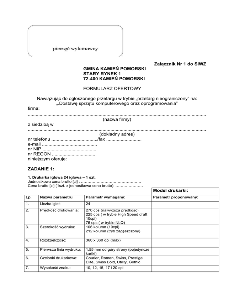 Załącznik Nr 1 do SIWZ GMINA KAMIEŃ POMORSKI STARY RYNEK 1 72-400 KAMIEŃ POMORSKI FORMULARZ OFERTOWY Nawiązując do ogłoszonego przetargu w trybie „przetarg nieograniczony” na: „.Dostawę sprzętu komputerowego oraz oprogramowania” firma: ........................................................................................................................................ (nazwa firmy) z siedzibą w ........................................................................................................................................ (dokładny adres) nr telefonu .................................../fax ........................... e-mail .......................................... nr NIP ......................................... nr REGON .................................. niniejszym oferuje: ZADANIE 1: 1. Drukarka igłowa 24 igłowa – 1 szt. Jednostkowa cena brutto [zł] : ………………………………………. Cena brutto [zł] (1szt. x jednostkowa cena brutto): ………………… Model drukarki: Lp. Nazwa parametru Parametr wymagany: 1. Liczba igieł: 24 2. Prędkość drukowania: 3. Szerokość wydruku: 270 cps (najwyższa prędkość) 225 cps ( w trybie High Speed draft 10cpi) 75 cps ( w trybie NLQ) 106 kolumn (10cpi) 212 kolumn (tryb zagęszczony) 4. Rozdzielczość: 360 x 360 dpi (max) 5. Pierwsza linia wydruku: 6. Czcionki drukarkowe: 1,55 mm od góry strony (pojedyncze kartki) Courier, Roman, Swiss, Prestige Elite, Swiss Bold, Utility, Gothic 7. Wysokość znaku: 10, 12, 15, 17 i 20 cpi Parametr proponowany: 8. Pamięć: 23 KB (min.) 9. Rozmiary papieru: Papier ciągły: 76-304,8 mm Pojedyncze arkusze: 90-304,8 mm 10. Gramatura papieru: 45-120 g/m2 11. Podawanie papieru 1: Przedni traktor pchający do druku na papierze ciągłym 12. Podawanie papieru 2: 13. Standardowe podawanie papieru: 14. Emulacje: 15. Wbudowany interfejs: Przedni podajnik ręczny – poziome podawanie papieru o nietypowych formatach i grubościach Ręczne podawanie pojedynczych kartek papieru Traktor pchający Epson LQ , IBM ProPrinter X24E/X24E/X24E AGM Równoległy Centronics 16. Żywotność głowicy: 200 milionów znaków 17. Żywotność taśmy: 3 miliony znaków 18. MTBF: 5 000 godzin (min) 19. Zasilanie: 220/230V AC (+6%, -14%) 240V AC (+/- 10%) 20. Częstotliwość zasilania 50/60 Hz 21. Poziom hałasu: 58 dBA (max) 22. Dodatkowo dołączone do drukarki: Kabel zasilający, kabel sygnałowy 22. Gwarancja: 2 lata (min) 2. Drukarka igłowa 9 igłowa – 1 szt. Jednostkowa cena brutto [zł] : ………………………………………. Cena brutto [zł] (1szt. x jednostkowa cena brutto): ………………… Model drukarki: Lp. Nazwa parametru Parametr wymagany: 1. Liczba igieł: 9 2. Prędkość drukowania: 3. Szerokość wydruku: 4. Rozdzielczość: 435 cps (najwyższa prędkość) 387 cps ( w trybie High Speed draft 10cpi) 290 cps ( w trybie Utility 10 cpi) 73 cps ( w trybie NLQ) 80 kolumn (10cpi) 160 kolumn (tryb zagęszczony) 240 x 216 dpi (max) Parametr proponowany: 5. Pierwsza linia wydruku: 0,55 mm od góry strony 6. Czcionki drukarkowe: Courier, Gothic, Sans serif, utility 7. Wysokość znaku: 10, 12, 15, 17 i 20 cpi 8. Pamięć: 88 Kb (min.) 9. 10. Rozmiary papieru: Gramatura papieru: Papier ciągły: 63,5-254 mm 38-90 g/m2 11. Standardowe podawanie papieru: 12. Emulacje: 13. Wbudowany interfejs: Traktor tylny pchający do podawania od tyłu Funkcja parkowania papieru Ręczne podawanie pojedynczych kartek Epson FX , IBM ProPrinter, Oki ML - Standard Centronics&USB 14. Żywotność głowicy: 200 milionów znaków 15. Żywotność taśmy: 3 miliony znaków 16. MTBF: 10 000 godzin (min) 17. Zasilanie: 220/230V AC (+6%, -14%) 240V AC (+/- 10%) 18. Częstotliwość zasilania 50/60 Hz 19. Poziom hałasu: 57 dBA (max) 20. Dodatkowo dołączone do drukarki: Kabel zasilający, kabel sygnałowy 21. Gwarancja: 2 lata (min) 3. Drukarka laserowa – 1 szt. Jednostkowa cena brutto [zł] : ………………………………………. Cena brutto [zł] (1szt. x jednostkowa cena brutto): ………………… Model drukarki: Lp. Nazwa parametru: Parametr wymagany: 1. Technologia druku Monochromatyczny druk laserowy 2. Minimum 26 stron / minutę 4. Prędkość drukowania (A4, w czerni, tryb normal) Czas wydruku pierwszej strony (A4 w czerni) Szybkość procesora Poniżej 8,5 s (z trybu uśpienia) Minimum 400 MHz 5. Jakość druku (w czerni) do 1200 x 1200 dpi 6 Minimalna liczba podajników papieru Minimalna pojemność podajnika (arkusze) 2 3. 7. 300 Parametr proponowany: 8. Minimalna pojemność odbiornika (arkusze) 150 9. Nośniki 10. Druk dwustronny Papier (typu Bond, o niskiej lub wysokiej gramaturze, zwykły ekologiczny, szorstki), koperty, etykiety, kartony, folia do przeźroczy, nośniki o wysokiej gramaturze Automatyczny 11. Standardowe wymiary nośników A4, A5, A6, B5, B6, C5, DL 12. Niestandardowe wymiary nośników 13. Gramatura nośników (wg ścieżki podawania papieru) 14. Zainstalowana pamięć Podajnik 1: 76x127 do 216x356 mm; Podajnik2: 147x211 do 216x356 mm Podajnik 1: od 60 do 163 g/m2 (prosta ścieżka prowadzenia papieru dla nośników specjalnych; Podajnik 2: od 60 do 105 g/m2 Minimum 32 MB 15. Możliwość rozbudowy pamięci Minimum 288 MB 16. Gniazda pamięci 17. 18. 19. 20. 21. Minimum 1x 144-stykowe gniazdo DIMM Języki drukarki PCL 6, PCL 5e, emulacja Postscript poziom 3 z automatycznym przełącznikiem języków Kroje czcionek 45 skalowalnych czcionek TrueType, 35 czcionek PostScript Rozwiązania komunikacyjne Port Hi_Speed USB (zgodny ze specyfikacją USB 2.0), wbudowany serwer druku do sieci Fast Ethernet Obsługiwane systemy operacyjne Microsoft Windows 2000, XP Home, XP Professional, Serwer 2003; Dostosowany do systemu Windows Vista; Mac OS X 10.2.8, Mac OS X 10.3.9, Mac OS X 10.4.3 lub nowszy Obsługiwane sieciowe systemy Przez serwer druku: operacyjne Microsoft Windows 2000, XP Home, XP Professional, XP Professional x64(tylko sterownik drukarki) s